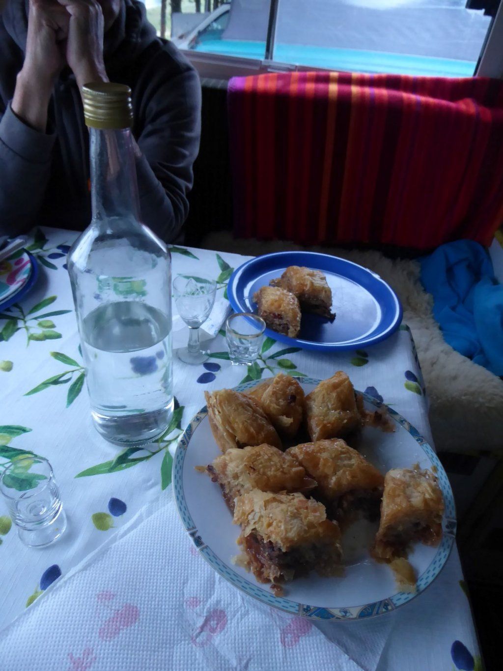 Heute lesen wir, dass die Demonstranten mit der Polizei zusammenstiessen und Tränengas und Molotowcokails eingesetzt wurden. Wir haben auf dem Camping ein feines Fleisch vom Grill genossen. Nun ist das Balkantief wieder aktiv und es regnet schon seit der Nacht. Darum gab es auch Zeit für den Blog. Um 20 Uhr kommt die Besitzerin und bringt uns Baklava und Raki zum Ende des Ramadans. Sie hat als Christin einen Tag gefastet und wird um 20.15 Uhr wieder essen und trinken. Das ist echte albanische Gastfreundschaft.