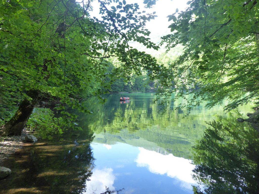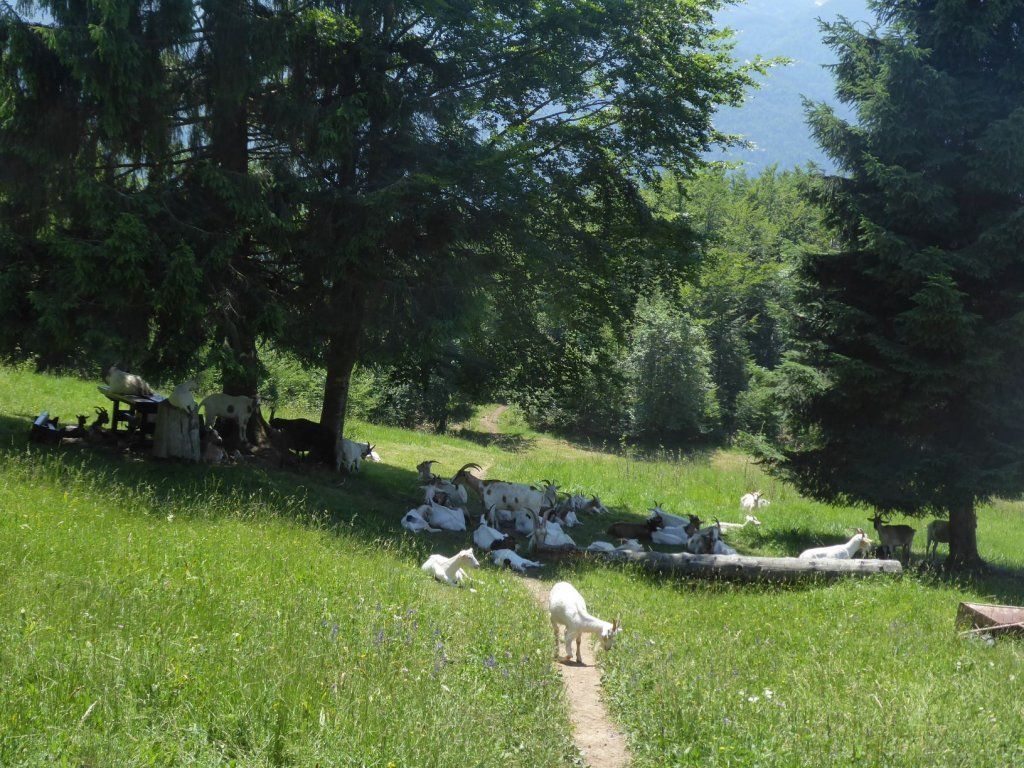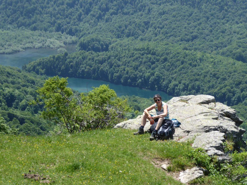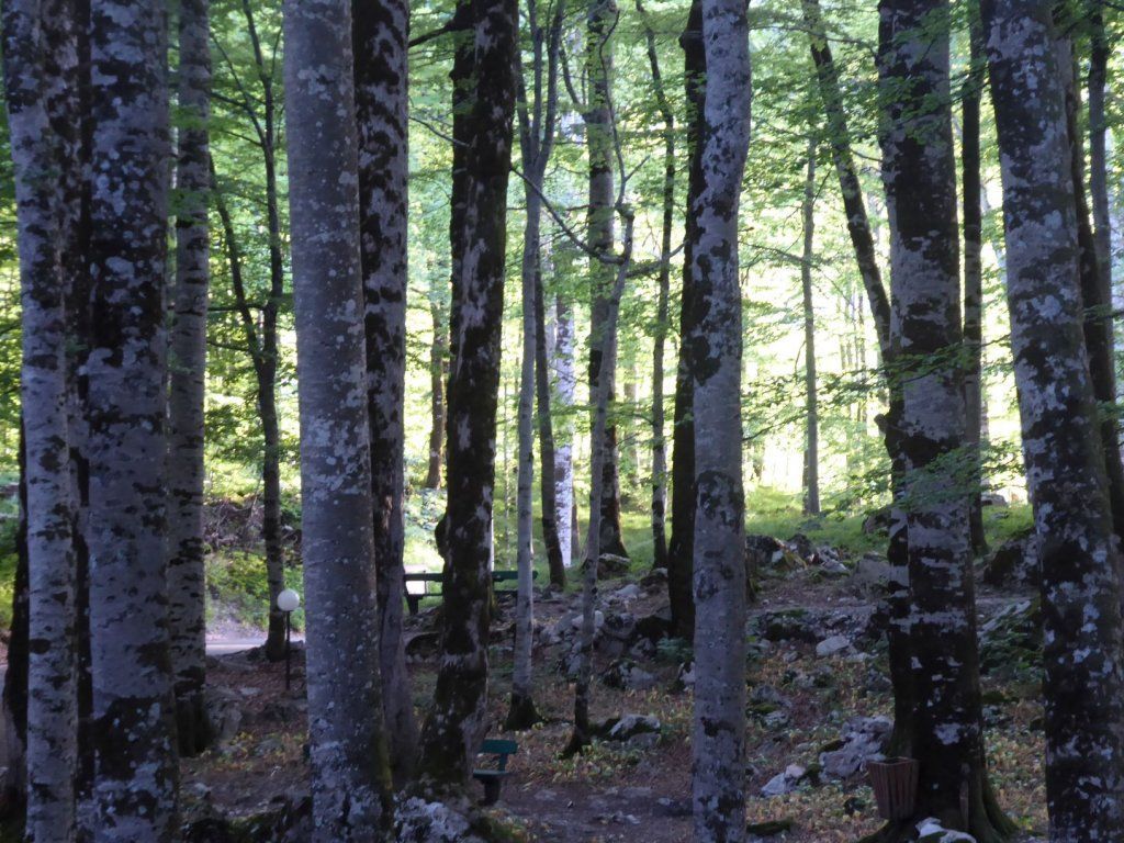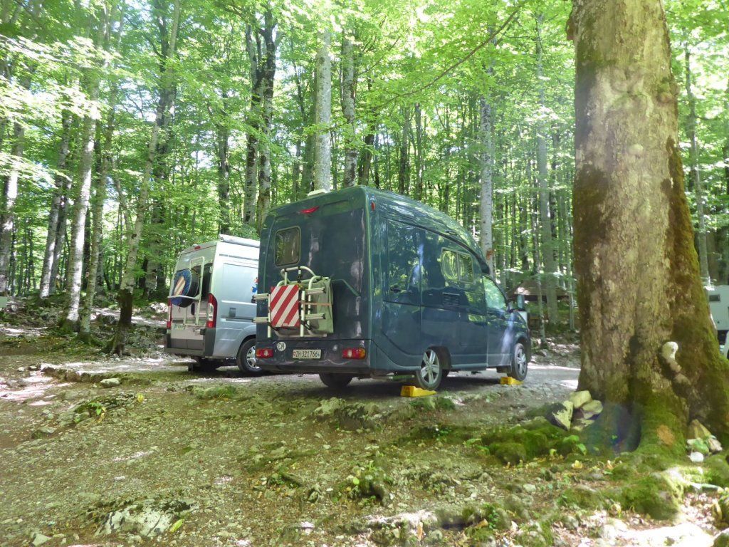 Unser nächstes Ziel ist der Nationalpark Biogradsko Jezero. Über eine enge Passstrasse kommen wir nach Kolasin und fahren dann zum See hoch. Jezero heisst See. Wir umrunden ihn in einer Stunde. Dort hat es im Wald einen Campingplatz. Ganz viele PWs stehen auf den ebenen Plätzen, die fahren dann aber ab und dann entern die etwa 12 Camper das Gebiet. Am nächsten Tag wollen wir wandern. Grundlagen ist die App Maps.me und eine Karte von 1984 aus kommunistischer Zeit, auf der Jugoslawien tatsächlich noch als ganzes Land abgebildet ist, also ein historisches Relikt. Am Anfang sind die Wege breit und gut bezeichnet. Schon bald werden sie schmaler, verlieren sich im Farn oder im Morast. Maps.me zeigt unsere Position und wir finden dadurch die Route wieder. Wir kommen auf eine erste Alp, auf der man übernachten, essen und trinken könnte, aber ausser zwei kläffenden Hunden an Ketten sehen wir niemanden. Wir kommen auf eine zweite Alp. Dort ist leider nur ein Hund angebunden und der andere kläfft uns wieder aus seinem Territorium zurück. Wir haben vorher die ganz kleine Abzweigung verpasst. Nach einem Aussichtspunkt und einer Pause fängt das Abenteuer erst an: Der Weg wird ein Geissenpfad, der Hang sehr steil, viel liegendes Gras und Erosionsschäden und er verliert sich immer wieder. Zudem geht es immer aufwärts, am Schluss einen ganz steilen Wald hinauf, völlig im Kraut. Die Wanderstöcke habe ich nicht mitgenommen, weil Hans meinte, es seien etwa vier Stunden. Zum Glück finde ich einen kräftigen Stecken. Immer wieder frage ich mal nach dem Abstieg, der See sei nämlich weit unten, da endlich beschwichtigt Hans, in 900 Metern seien wir auf einer Alp. Dort begrüssen uns wieder bellende Hunde zum Glück an Ketten und eine Frau scheint uns zu erwarten. Es ist die Hirtin, etwa 35 jährig, die mit ihrem jüngsten Sohn einige Kühe und 300 Schafe hütet. Ihre älteste Tochter ist 15 und in Podgorica verheiratet. Voller Stolz serviert sie uns ihre selbstgemachten Spezialitäten, Raki, Likör, Heidelbeersaft und Käse. Wir haben kein Geld bei uns, aber Hans findet noch zehn Schweizerfranken im Handy und sie freut sich darüber. Nach einer erfrischenden Pause steigen wir auf der Alpstrasse die 750 Höhenmeter wieder hinunter und sind nach sechs Stunden wieder beim Wigwamm.