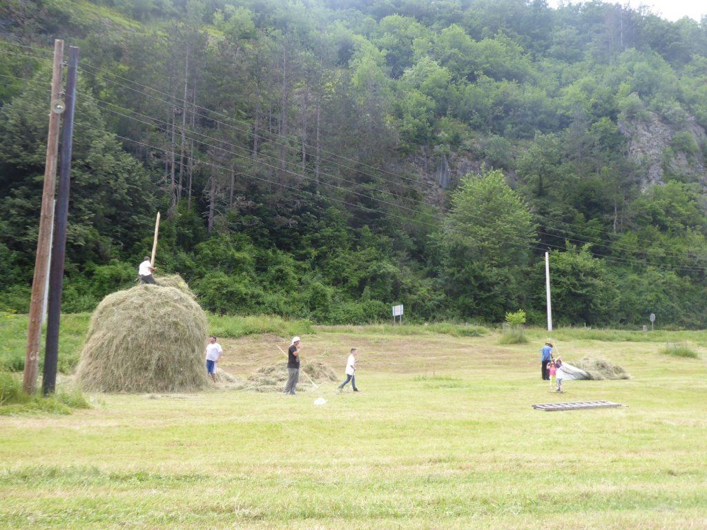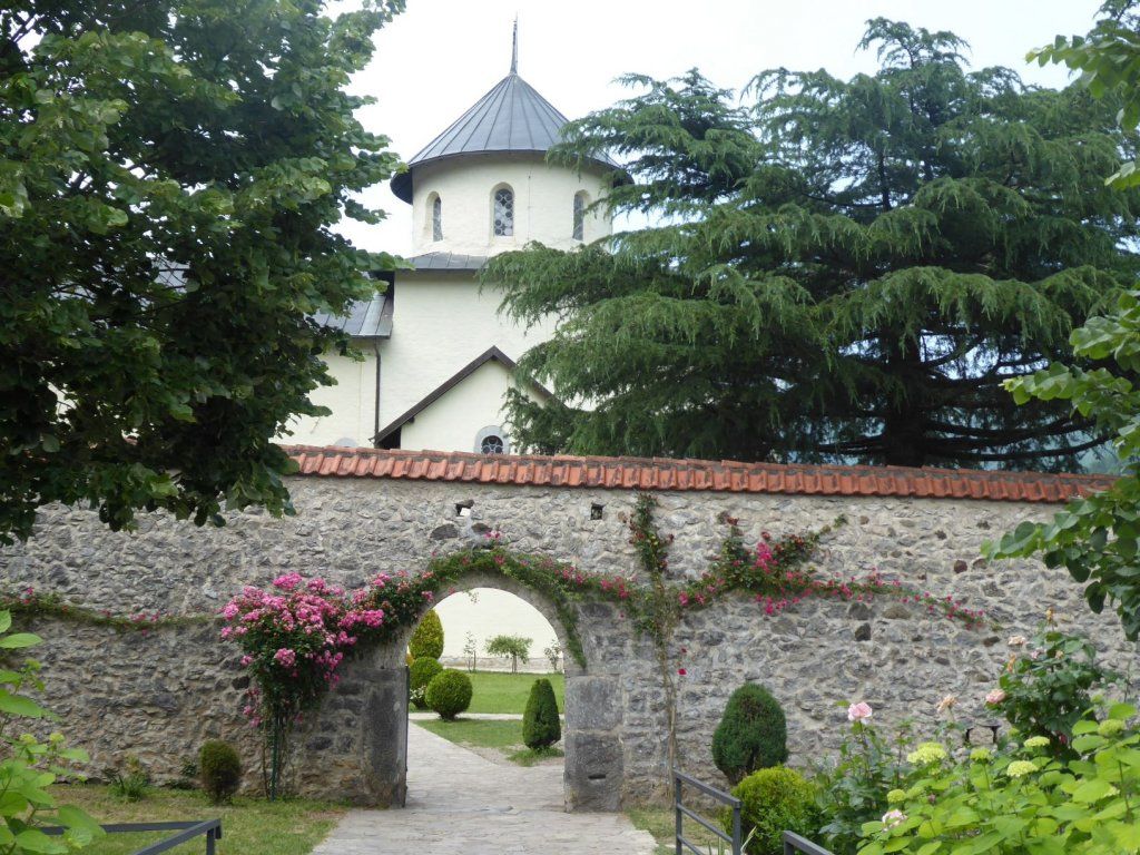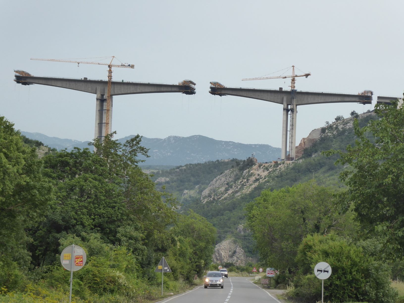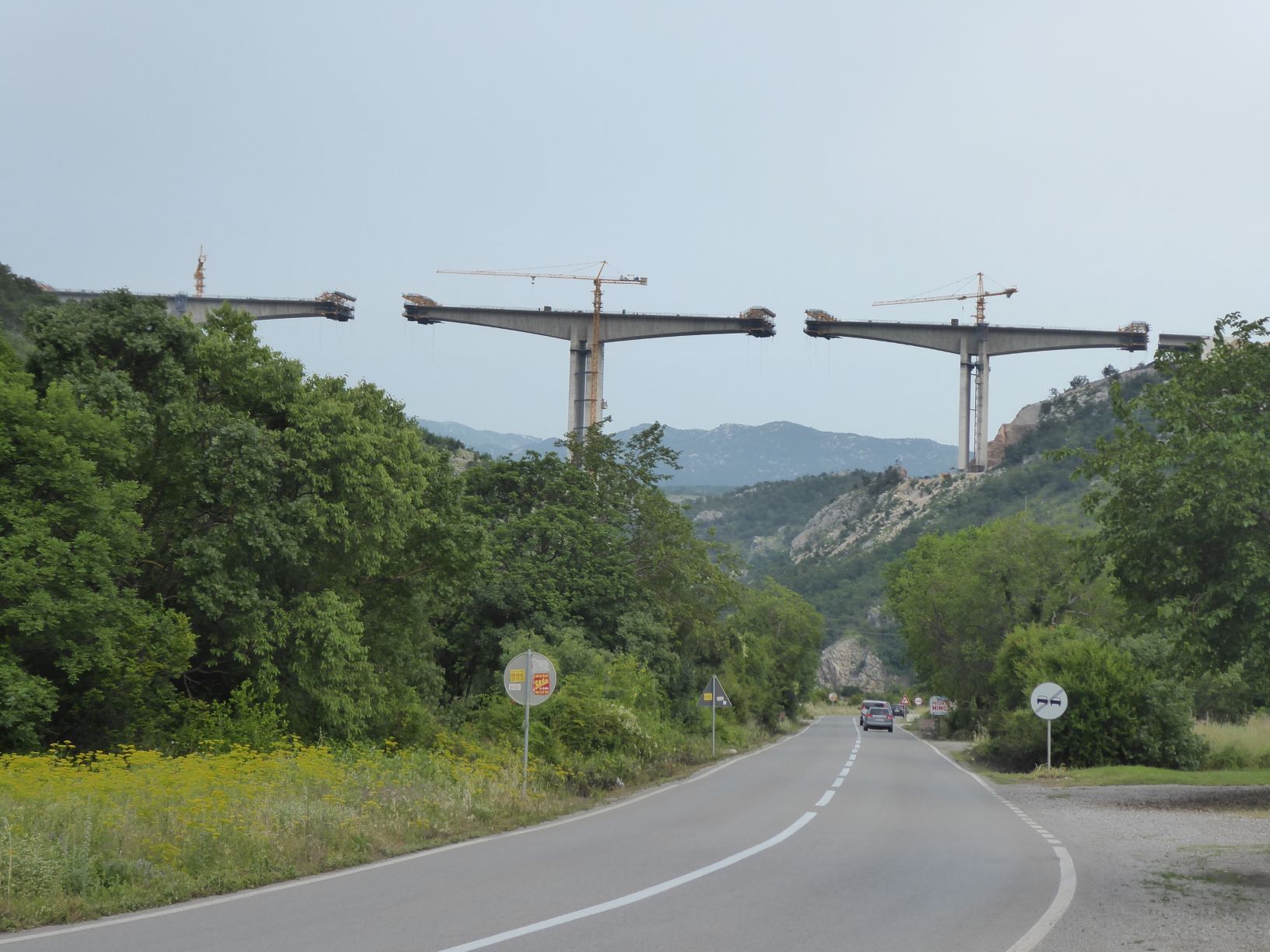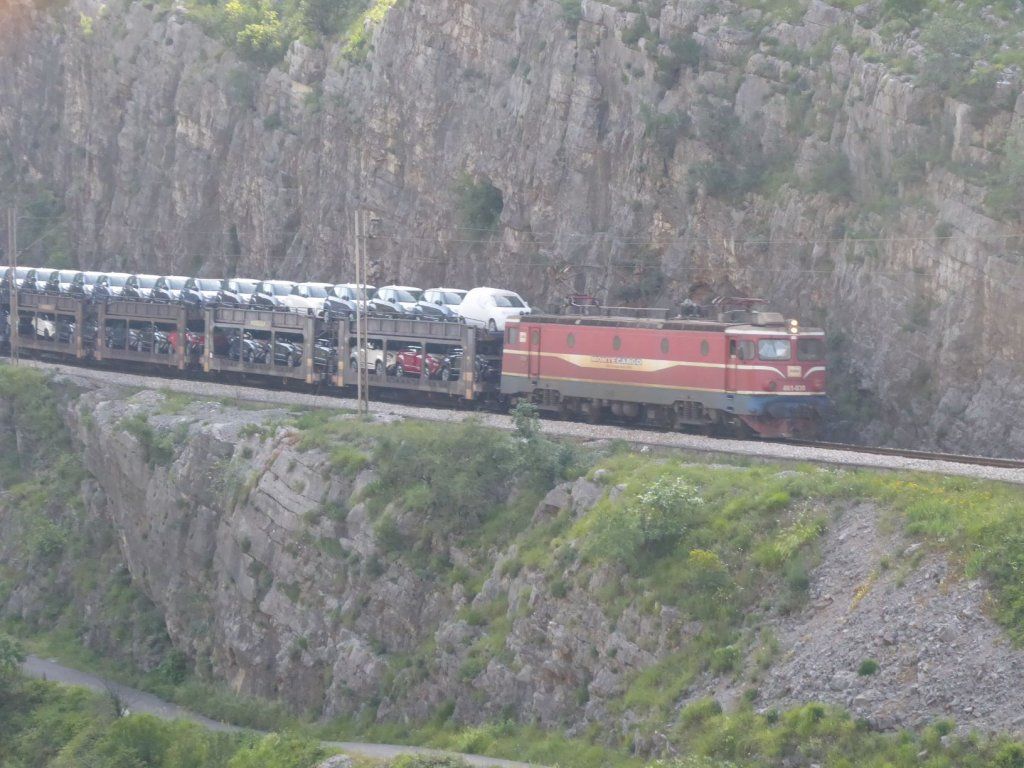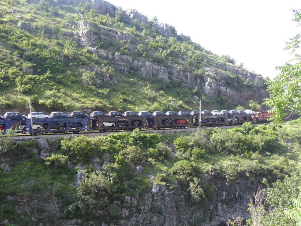 Wir packen zusammen und fahren dann durch die Moraca Schlucht Richtung Podgorica, Hauptstadt von Montenegro. Es ist eine gigantische Schlucht, steile enge Wände und eine sehr tiefe Schlucht, anfangs sieht man den Fluss gar nicht. Die Strasse ist sehr gut und es hat viele LKW mit serbischen Nummern. Die Strasse ist eine Verbindung von Serbien zum Meer. Beim Kloster Moraca halten wir. Es wurde 1252 gegründet. Berühmt sind die vielen schönen und gut erhaltenen Fresken. Leider Fotoverbot. Es ist Abendgebet und wir erhaschen etwas fromme Atmosphäre und Weihrauchduft. Vor dem Kloster wird hart gearbeitet und ein hoher Heustock erbaut. Das beeindruckt uns sehr. Kurz vor Podgorica sehen wir eine gigantische Autobahn Baustelle und viele chinesische Container. Auch in Montenegro Ausverkauf der Heimat. Wir stellen wir uns hinter ein Hotel und stärken uns mit Zigerhörnli. Alle Stunden rumort und rumpelt es gewaltig. Lange Züge der Titobahn fahren vorbei, auch ein Autozug. 2800 Autos pro Woche werden von Serbien nach Bar transportiert für den Export nach USA. Vor dem 2. Weltkrieg wurde mit dem Bau begonnen und Tito weihte sie ein.