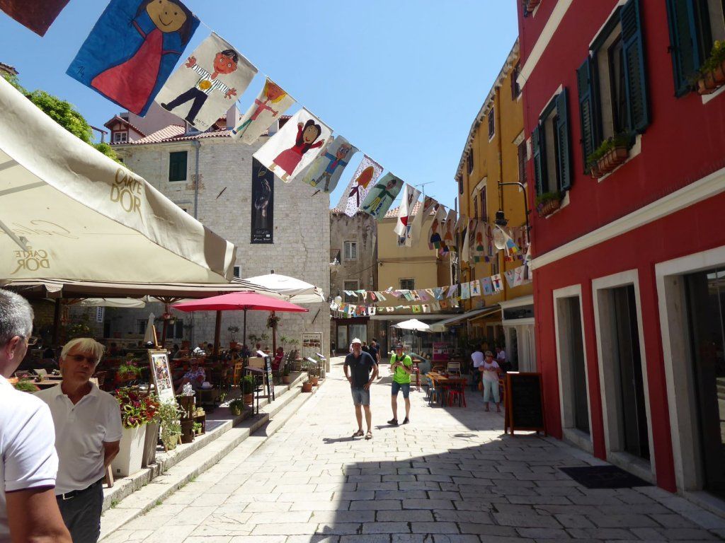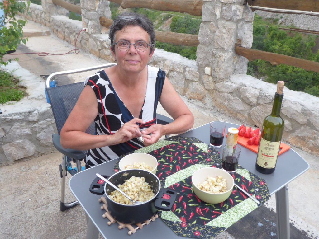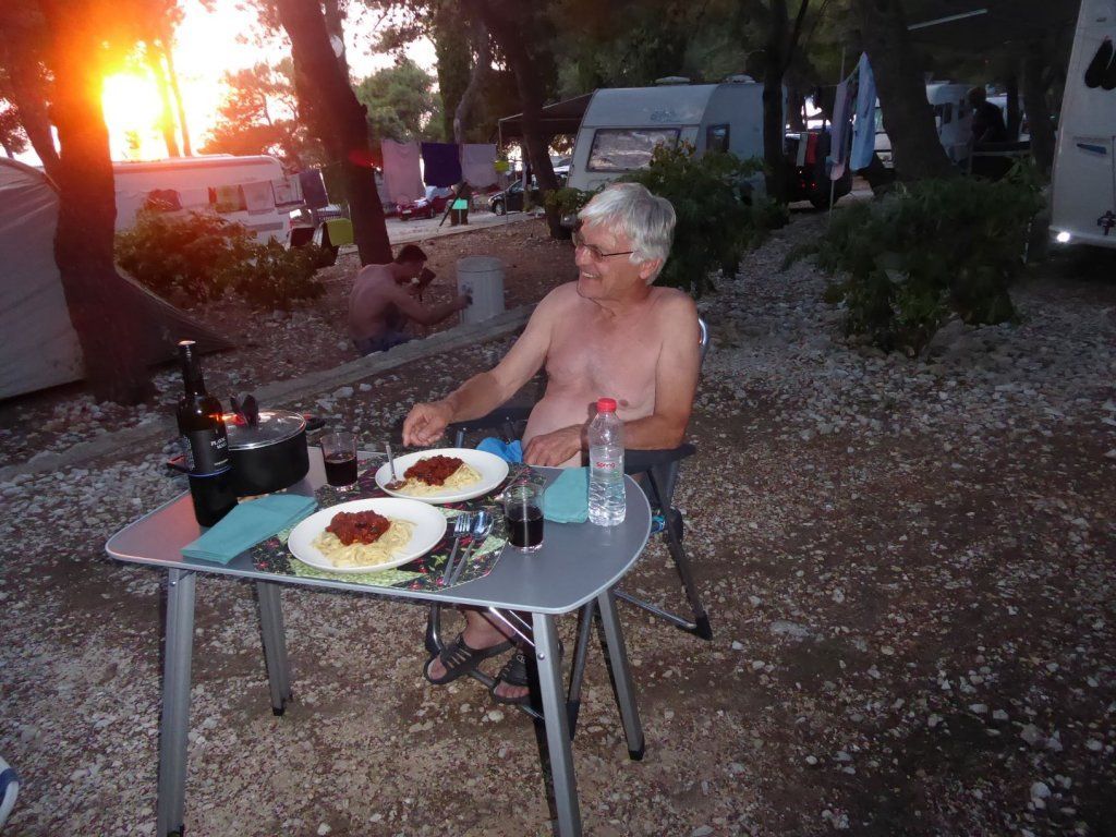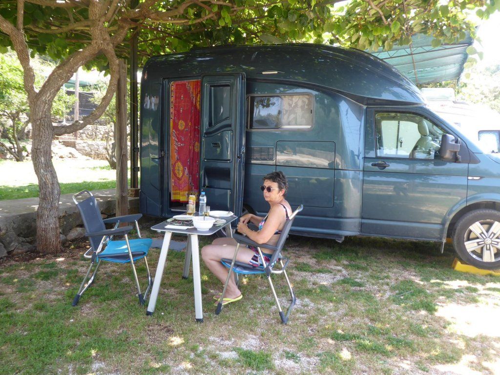 Wir fahren weiter der Küste entlang und würden gerne wandern. In Makarska suchen wir die Touristeninformation, werden leider schlecht beraten. Aber die stündige Wanderung durch die Stadt bingt uns zur Einsicht, dass es bei über 30 Grad viel zu heiss zum wandern ist. Bei Primosten finden wir einen Camping, der viel gelobt und gerühmt wird. Er ist schattig, riesig und hat allen Luxus. Da lassen wir uns nieder zum lesen, baden, ausruhen und weiter planen. Einzige Aktivität ist das backen des Sonntagszopfs. Die Nachbarn sind Polen und haben in der Nähe von Warschau ein grosses Haus und Wiese, wo sie Gäste und Camper beherbergen. Das wird ein Ziel von uns sein. Interessant ist einfach oft, dass man zwei, drei Tage nebeneinander lebt und einander beobachtet und zum Abschied entstehen die Kontakte = Abschiedsreichtum.
