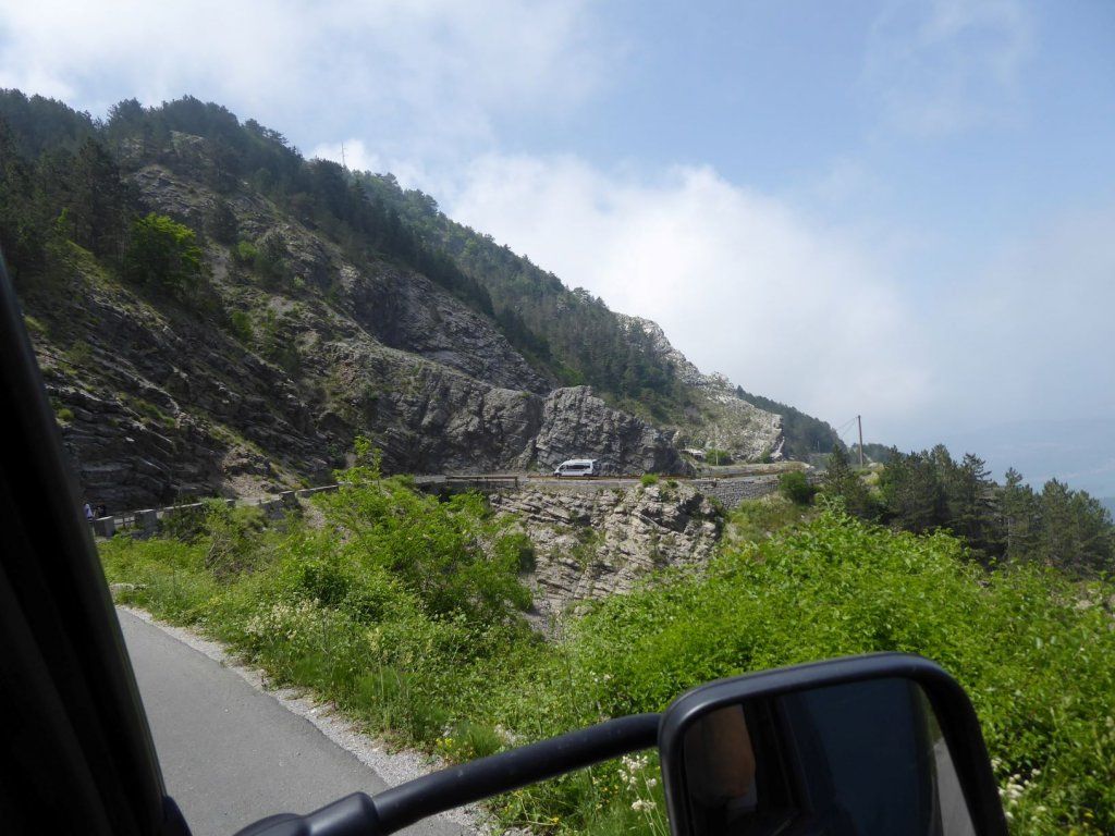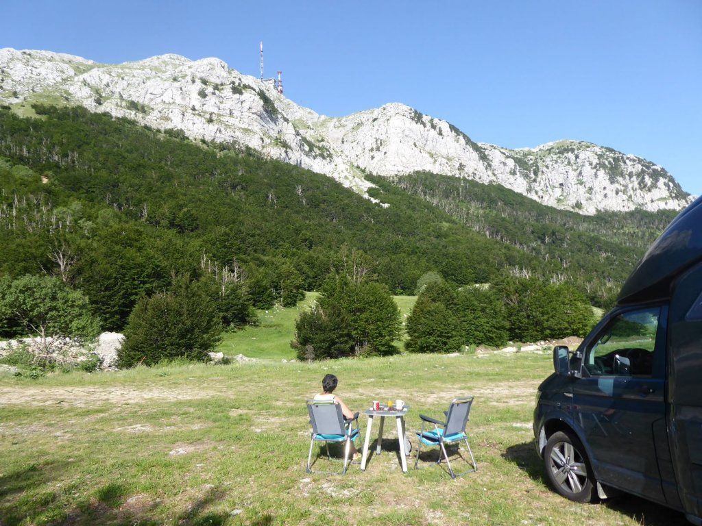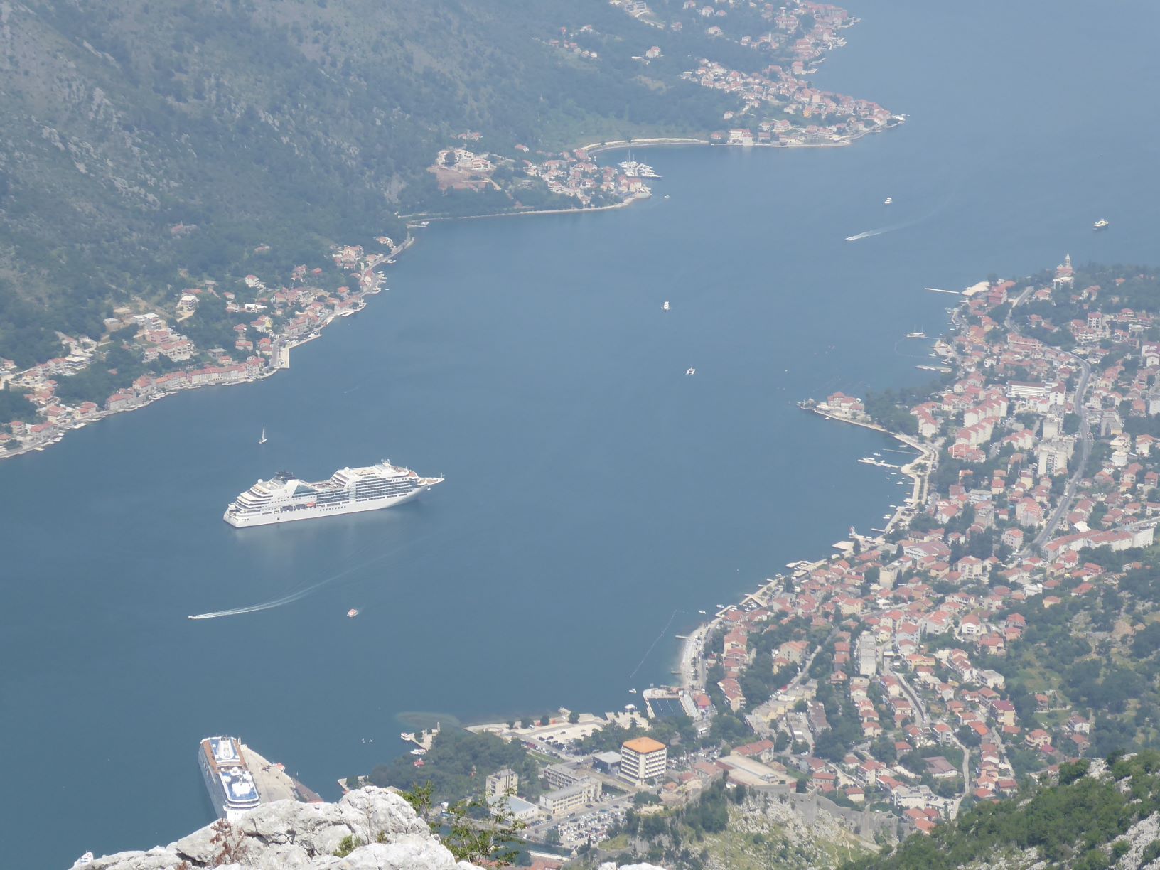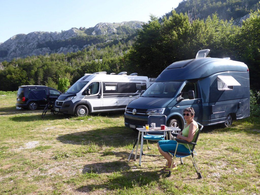 Letzte Station in Montenegro ist der Nationalpark Lovcen. Der Dichter Niegosh ist dort auf einem hohen Berg begraben, das Mausoleum darüber für uns wegen der Aussicht ein Anziehungspunkt. Auf der Wiese unterhalb finden wir einen schönen Stellplatz zusammen mit zwei Münchnerinnen. Wir tauschen gute Plätze und Tipps aus. Mit einem schönen Lagerfeuer geniessen wir die Vollmondnacht. Letztes Abenteuer ist die Strasse nach Kotor: 25 Haarnadelkurven, eng und steil, ohne Mittellinie. ist ja toll, wenn man keinen Gegenverkehr hat, aber bei drei grossen Cars gibt es manch kitzliges Kreuzungsmanöver. Ich sollte immer schauen, wieviel Hans noch nach rechts fahren kann, aber auf der Abgrundseite ist der Tiefblick so, dass es mir auf den Magen schlägt. Aber der Kurvenmeister Hans fährt das grossartig. In Kotor sind zwei Kreuzfahrtschiffe und die Massen Leute haben grüne Armbändchen. Ein Rundgang durch die Stadt und dann verlassen wir Montenegro. Dovidenja = Auf Wiedersehen.