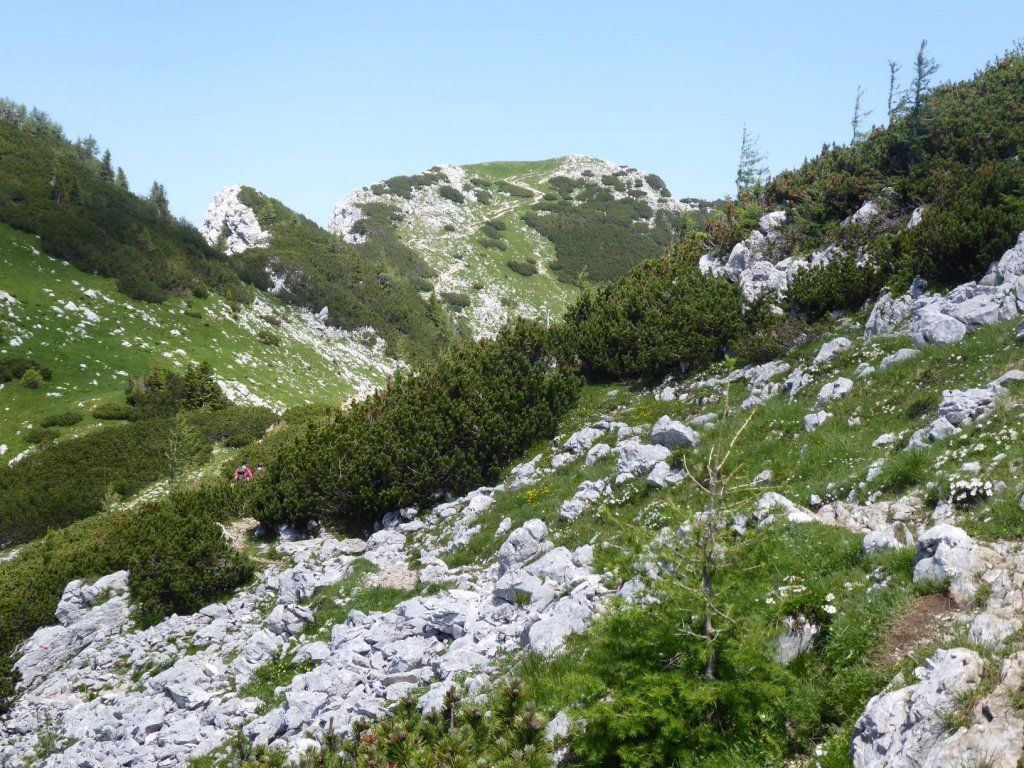 Aber wir wollen nun endlich wandern. Nach Planung und Vorbereitung starten wir zur Mittagszeit!, auf den Rudnica, 450 Höhenmeter. Zwar ist das meiste im Schatten, aber der Schweiss läuft in Strömen und der Weg ist extrem steil und steinig. Die Entschädigung ist die Aussicht. Wir schaffen Auf- und Abstieg und das Glücksgefühl stellt sich mit der Dusche ein. Am nächsten Tag ist der Debela Pec unser Ziel. Zuerst jagt uns das Navi über eine enge kurvenreiche Strasse zum Parkplatz. Dann 750 Höhenmeter, Hälfte schattig, die andere sonnig. Der Gpfel ist verborgen, es geht um Kurven, über einen Pass hinauf und hinunter. Und dann: Die Aussicht auf den Triglav, den höchsten Berg Sloweniens, ist einfach toll. Der Abstieg ist genauso heiss, steil, steinig und anstrengend. Ko und glücklich kommen wir zum Camping. Zum Glück gibt es ein Restaurant. Tags darauf liegen wir auf der faulen Haut, lesen, schlafen und geniessen feines Essen, selbst gekocht.