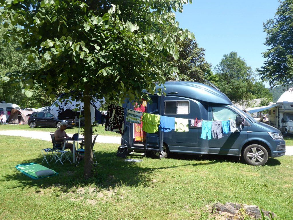 In Slowenien ist es so still, kaum Leute auf der Strasse, alle Läden geschlossen und überall hängen Fahnen. In Bled erfahren wir, dass Nationalfeiertag ist. Slowenien war der erste Staat, der sich nach Titos Tod unabhängig erklärte. Wir kommen nach Bohinjska Bistrica und haben ein dejà-vu. Da waren wir doch schon bei Regen und Kälte. Also wollen wir auf den Camping am Ende des Sees Bohinjsko Jezero. Dort aber ist echt Chaos. Soviele Zelte, Camper und Autos, dass einem kaum ein ebener Platz und ein Quadratmeter daneben bleibt. Also fahren wir die 11km wieder zurück und das ist ein Glück. Wir finden einen Platz auf der Wiese und haben einige GBs als Nachbarn. Es gibt viele interessante Gespräche. Ja, und heiss ist es auch, zum schlafen 31 Grad.