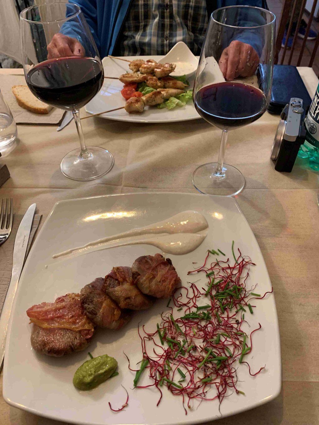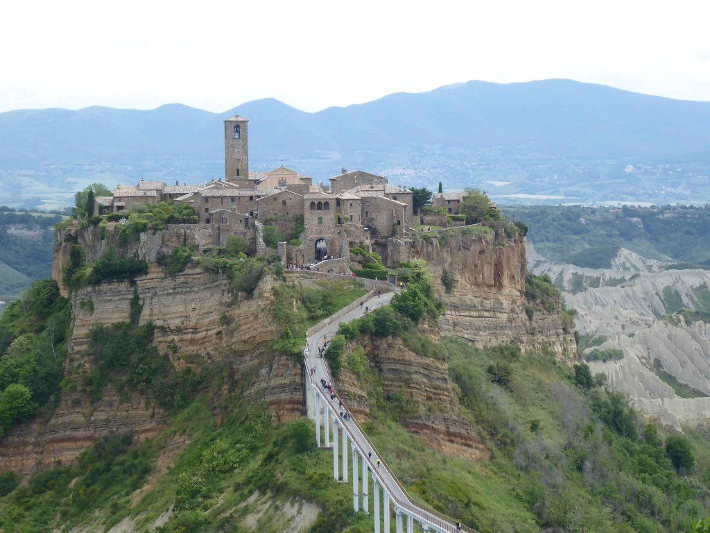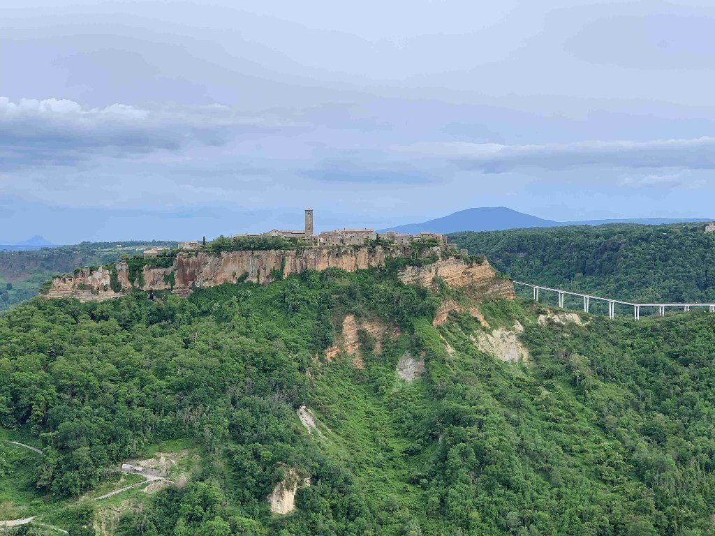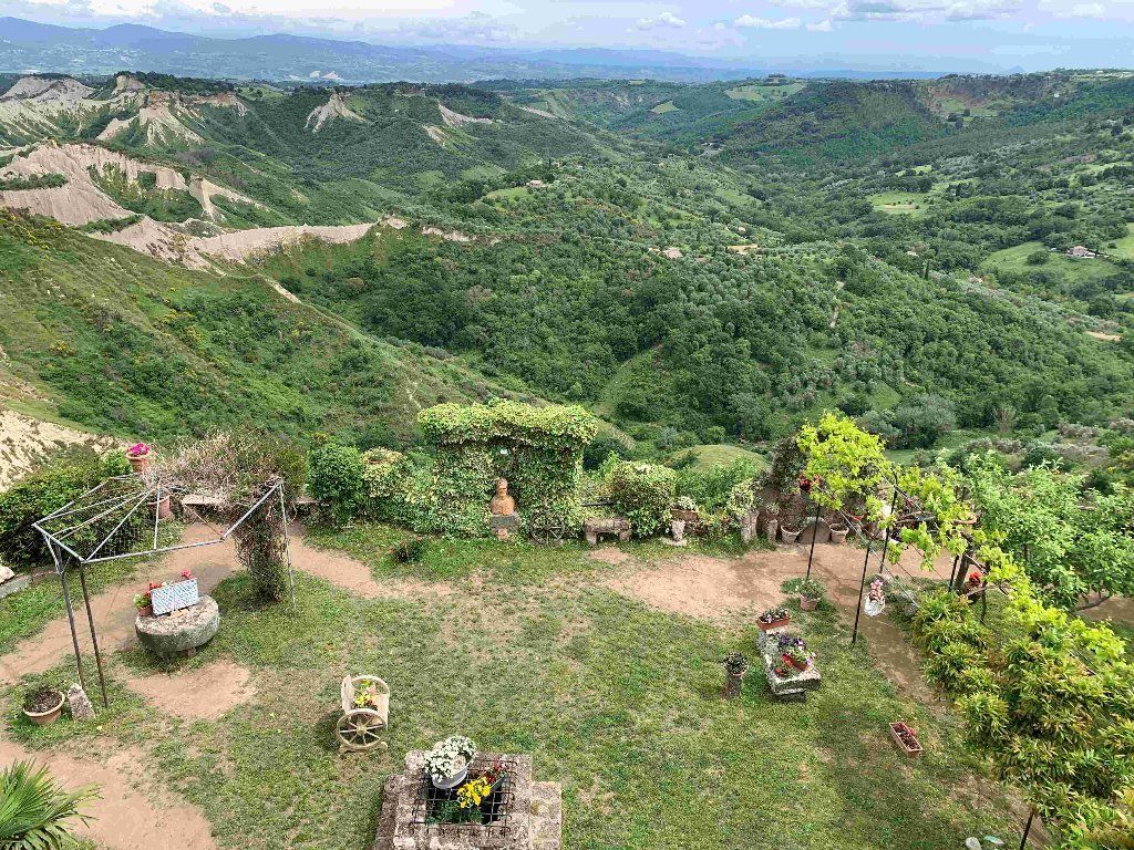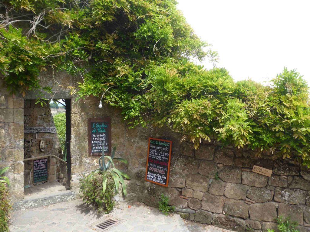 Auf Empfehlung meines Bruders fahren wir nach Bagnoregio. Nach einem Marktbesuch wandern wir zur Civita Alta. Dahin kommt man nur zu Fuss, über eine hohe Brücke, die über die Schlucht führt und wenn man 5 Euro bezahlt hat. Bald finden wir auch Il Pozzo dei Desideri, ein Restaurant in einem Keller unten mit fünf Tischen. Es war einmal eine Zisterne im Ort. Wir essen und trinken sehr fein und günstig. So gestärkt erkunden wir das kleine Städtchen. Die Aussicht in und vom Poetengarten ist prächtig.