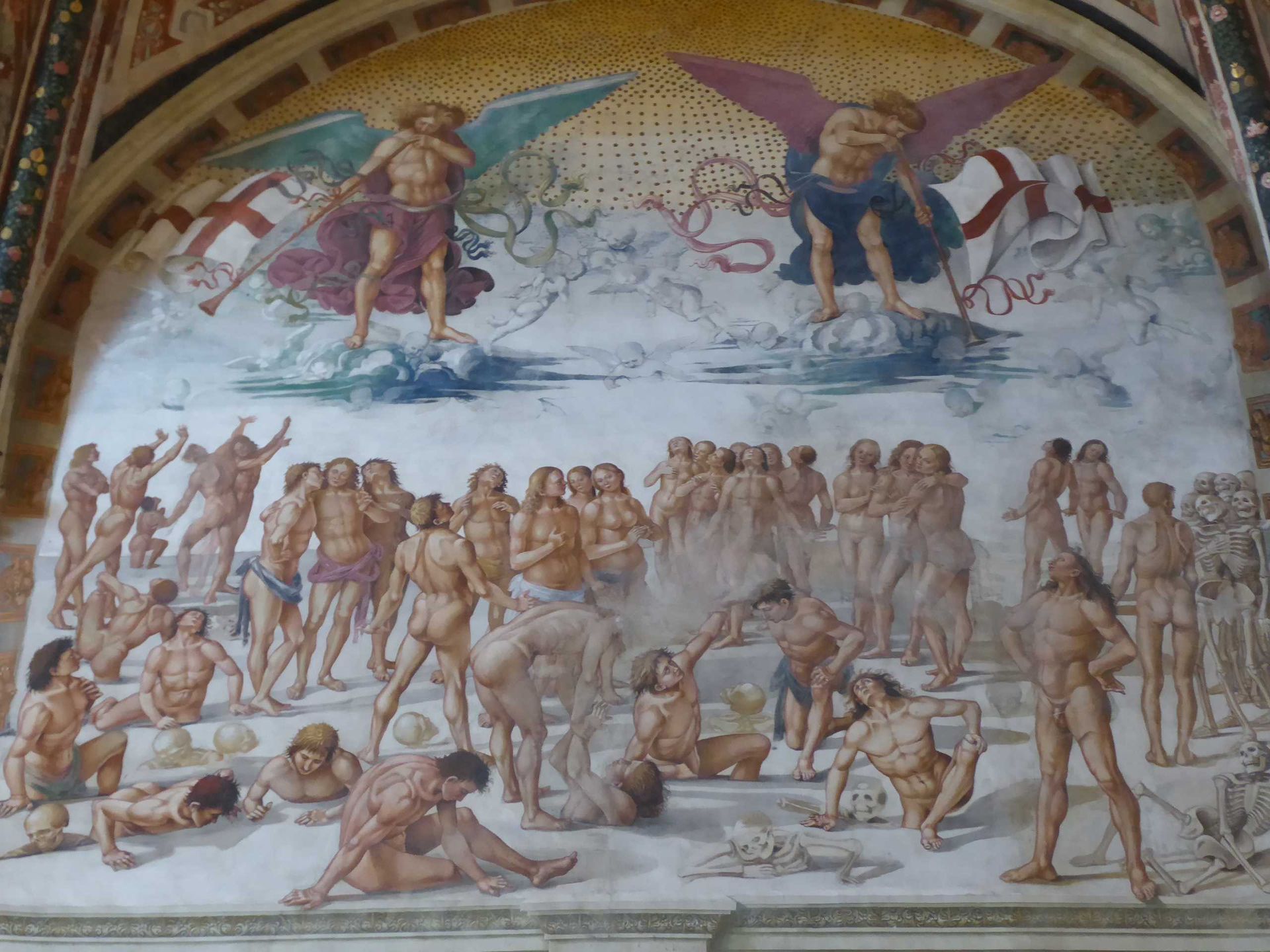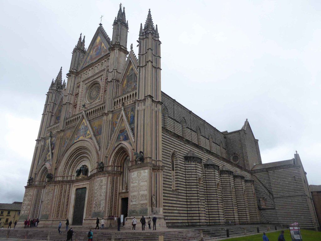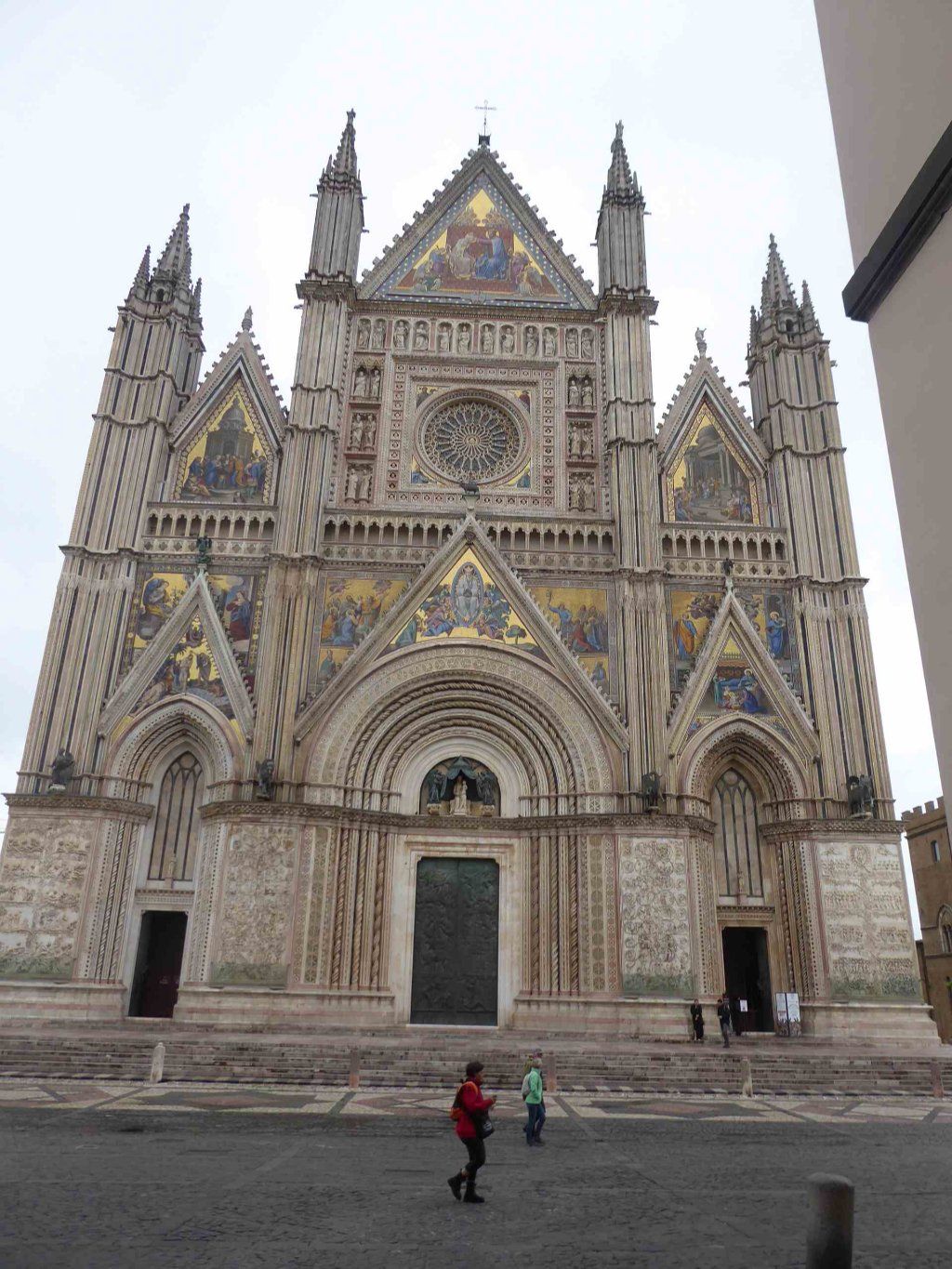 Gerne möchte ich Hans Orvieto zeigen. Da war ich schon vor 45 Jahren während des Studiums. In lebhafter Erinnerung ist mir die Fassade des Doms geblieben. Orvieto ist der meistbesuchte Ort in Umbrien, darum war ja nicht klar, ob wir den Dom auch anschauen können. Es regnet und ist kalt, am Mittag nur 14 Grad. Oh Wunder, wir kaufen Billette für 5 Euro ohne anzustehen und können direkt in den Dom, kaum zu glauben. Der Raum beeindruckt. Zwar haben wir keine Ahnung, wer wann diese Bilder gemalt hat, aber die Geschichten, die sie erzählen unterhalten uns sehr. Die Strickart ist auch einfach: die Guten werden erhöht, ihnen wird von Engeln geholfen, die Bösen trifft der Blitz vom Himmel, sie werden verstossen und gefoltert von teuflischen Wesen. Nur, wer sagt was gut und böse ist? Und wie sagt das Christus? - das erst ist die schwierige Situation.