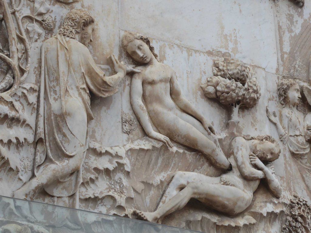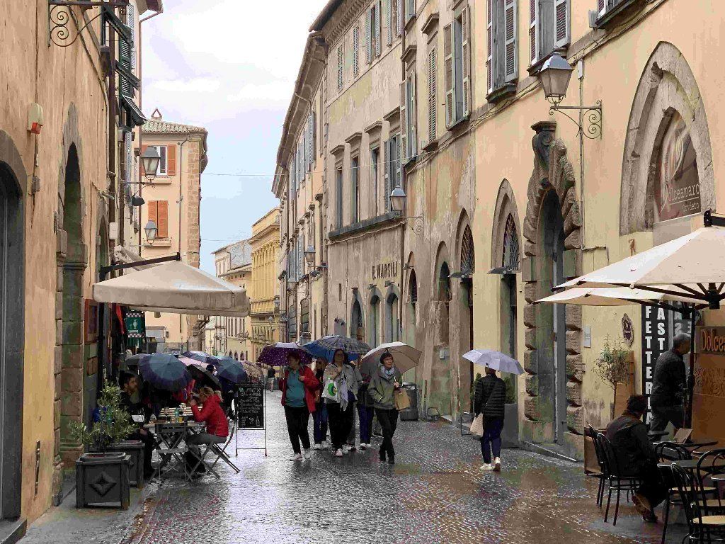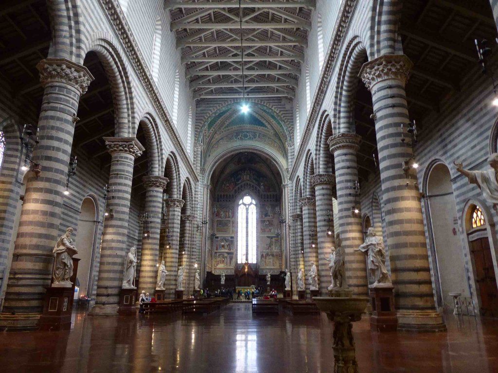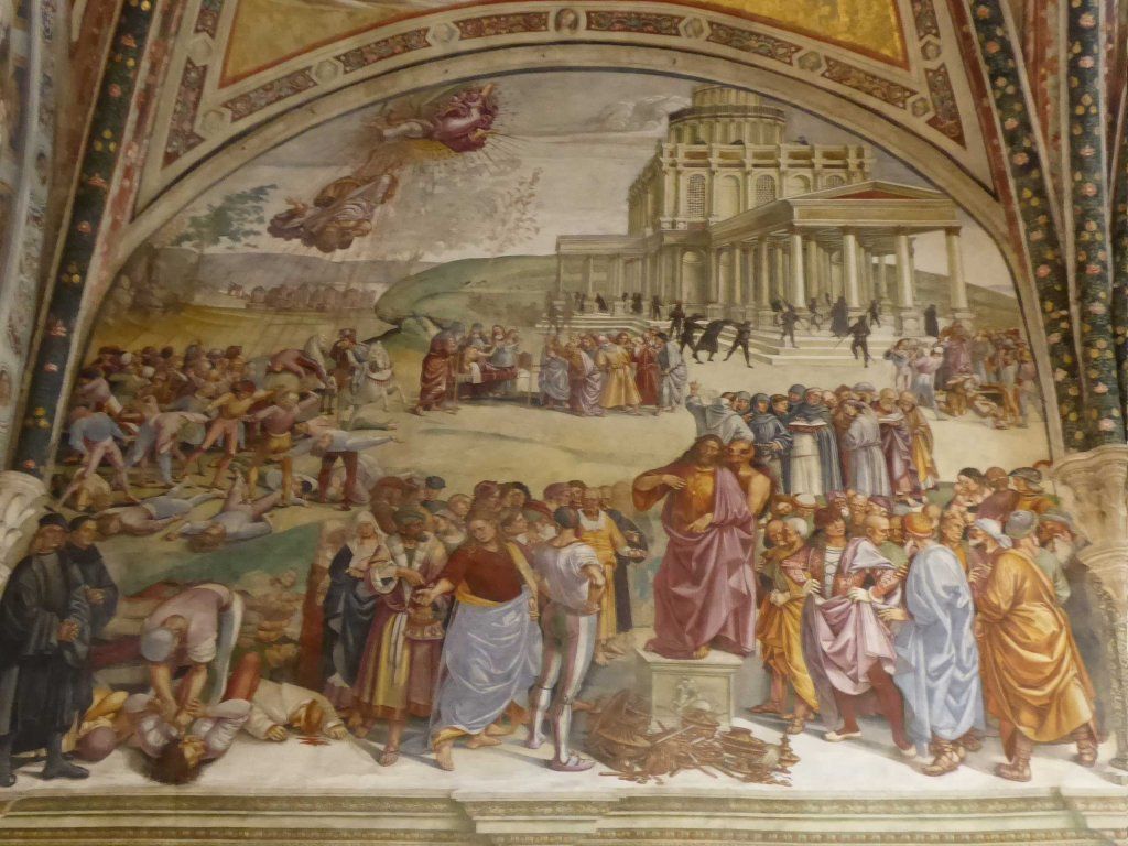 Gerne möchte ich Hans Orvieto zeigen. Da war ich schon vor 45 Jahren während des Studiums. In lebhafter Erinnerung ist mir die Fassade des Doms geblieben. Orvieto ist der meistbesuchte Ort in Umbrien, darum war ja nicht klar, ob wir den Dom auch anschauen können. Es regnet und ist kalt, am Mittag nur 14 Grad. Oh Wunder, wir kaufen Billette für 5 Euro ohne anzustehen und können direkt in den Dom, kaum zu glauben. Der Raum beeindruckt. Zwar haben wir keine Ahnung, wer wann diese Bilder gemalt hat, aber die Geschichten, die sie erzählen unterhalten uns sehr. Die Strickart ist auch einfach: die Guten werden erhöht, ihnen wird von Engeln geholfen, die Bösen trifft der Blitz vom Himmel, sie werden verstossen und gefoltert von teuflischen Wesen. Nur, wer sagt was gut und böse ist? Und wie sagt das Christus? - das erst ist die schwierige Situation.