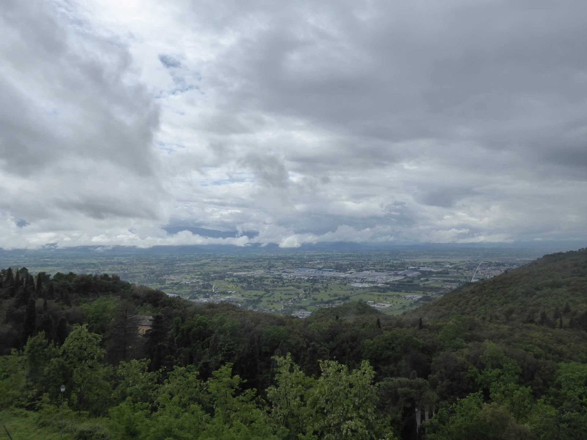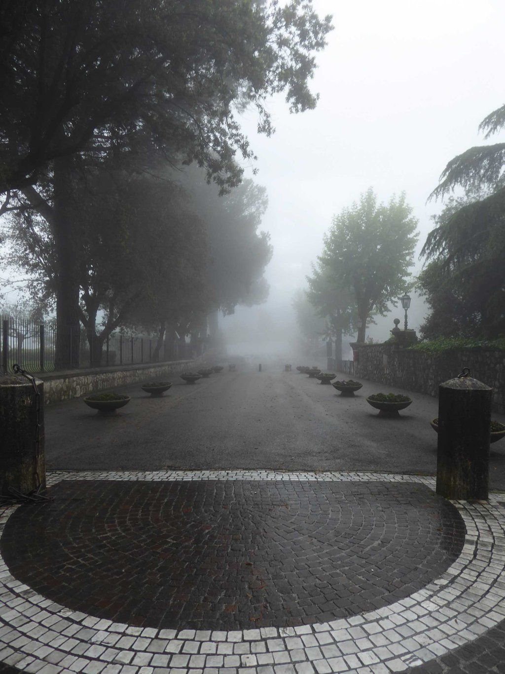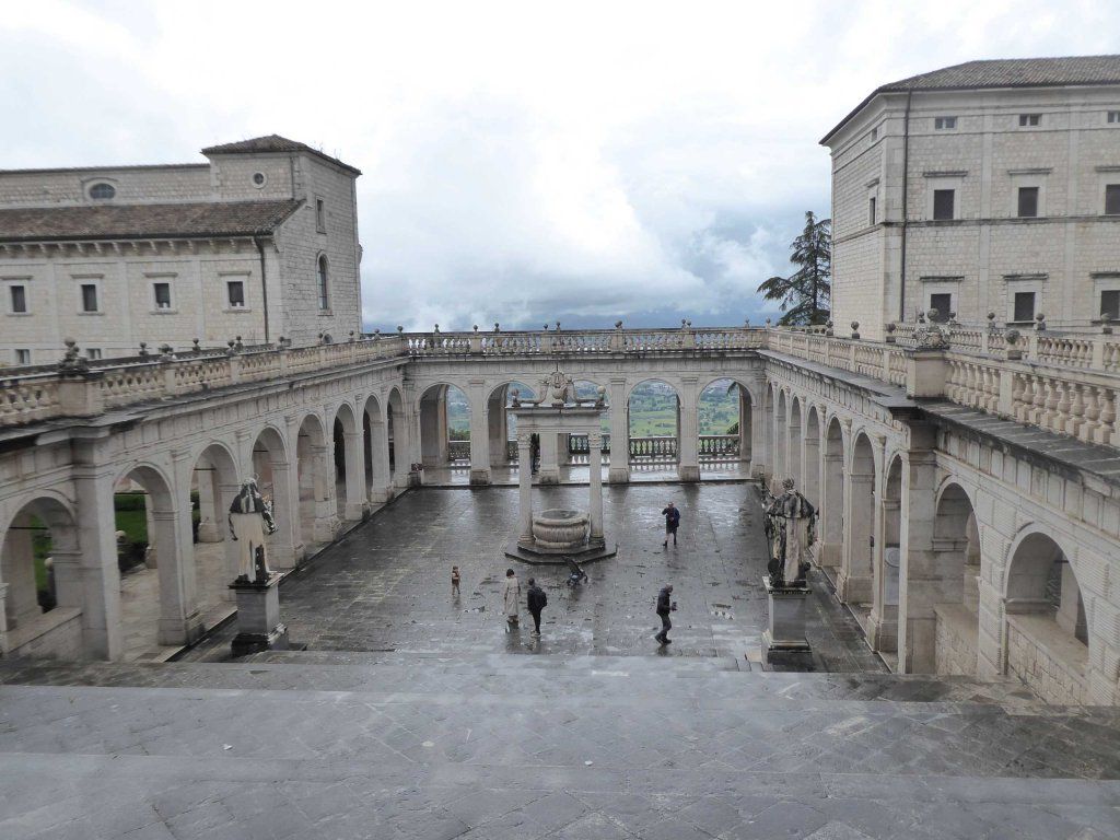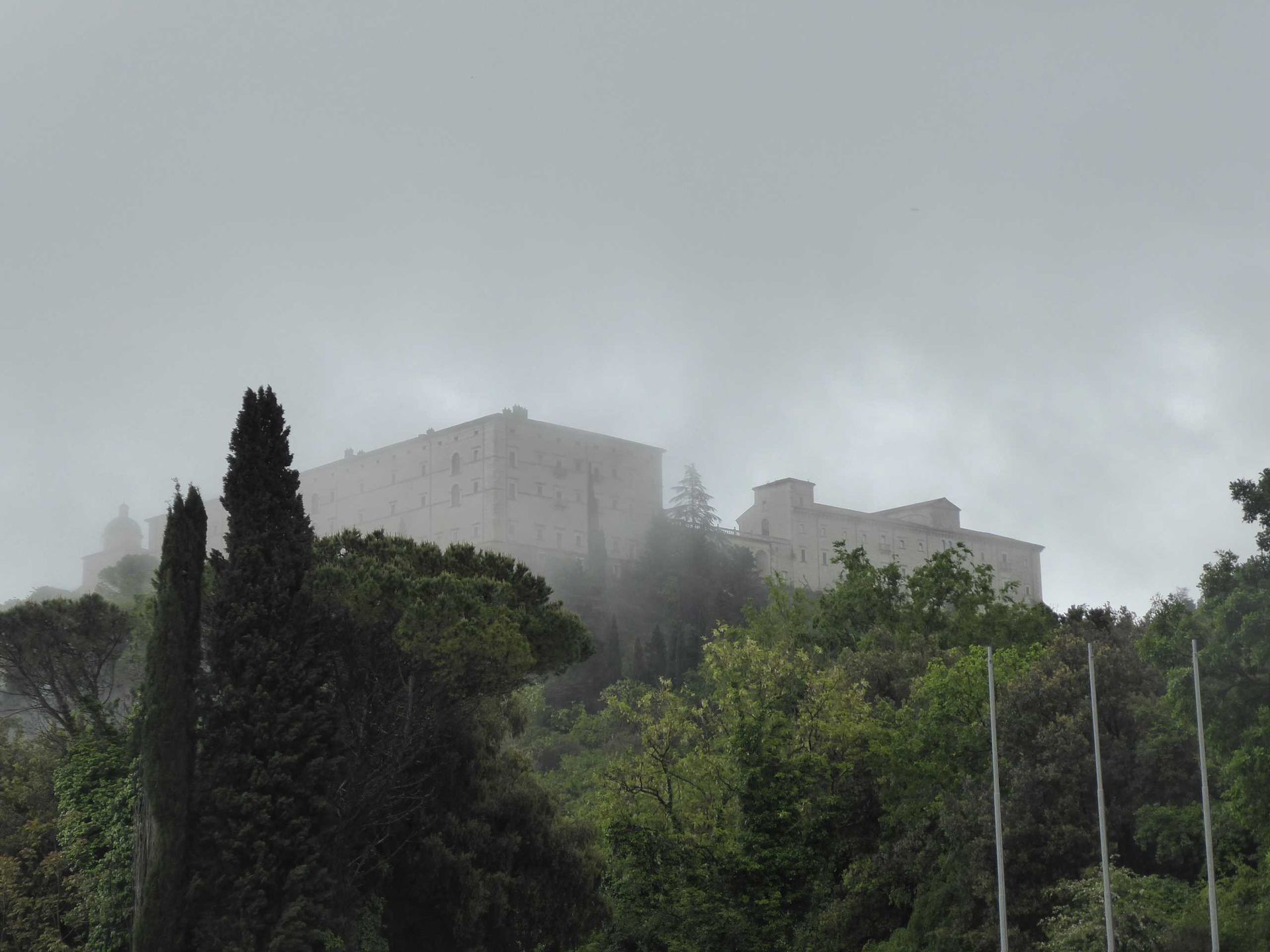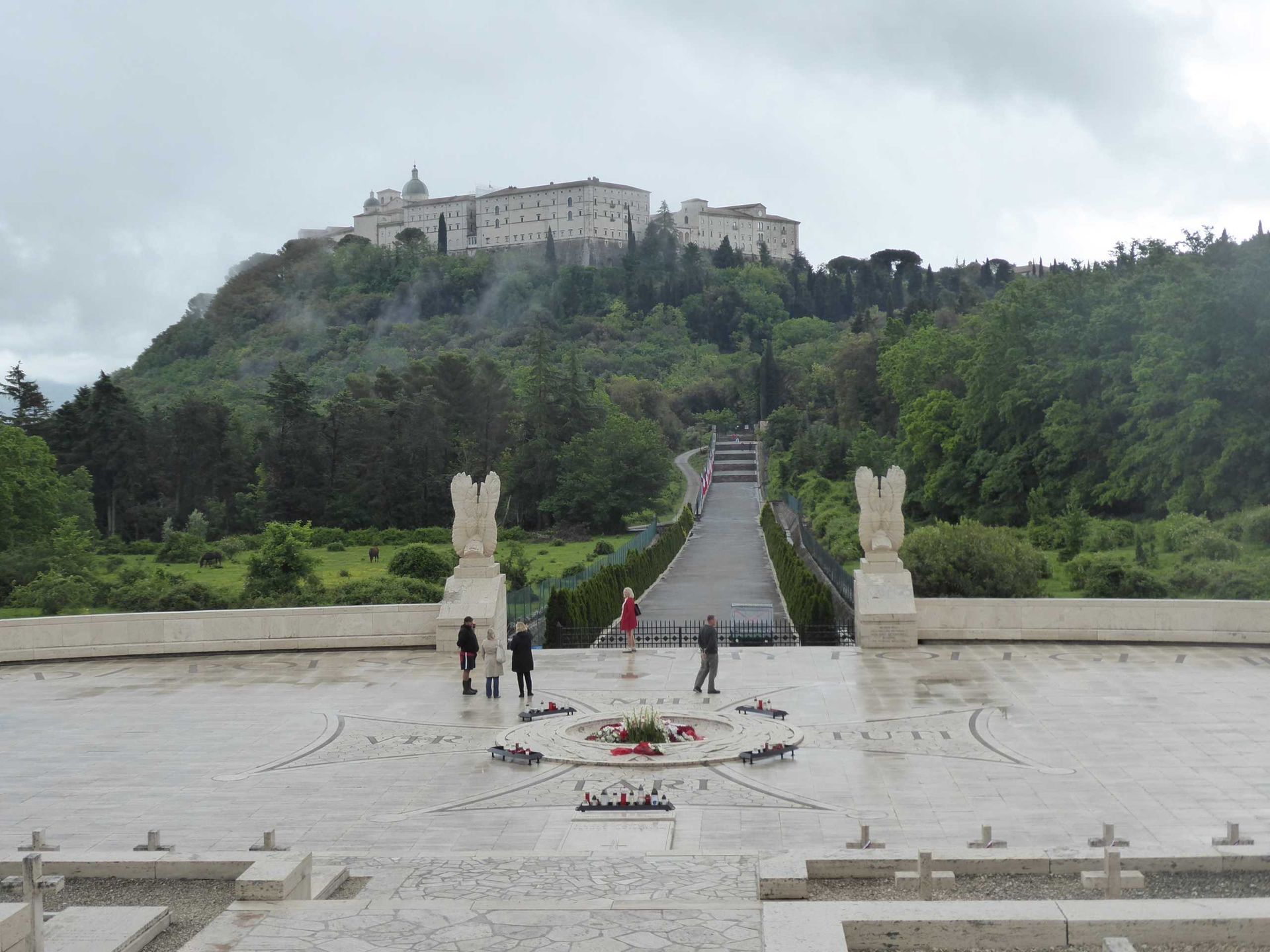 Nach Orvieto fährt Hans noch 200 km Richtung Napoli. Erst in Ceprano kann er auch die Fotos hochladen für den zweiten Teil des Reiseberichts. Direkt hinter ihm spielt am Fernseher Inter Mailand gegen AC Mailand, wahrlich eine Konzentrationsübung. Dann schrauben wir uns 500 Höhenmeter den Berg hoch zum Kloster Montecassino, dem Gründerkloster des Benediktinerordens 529. Es wurde mehrfach zerstört, zum letzten Mal 1944. In 10 Jahren wurde es originalgetreu wieder aufgebaut. Wir fahren die Serpentinen hoch in immer dichteren Nebel. Schade um die schöne Aussicht. Auf dem Parkplatz geht gerade ein Starkregen nieder, also essen wir zuerst Zmittag im Wigwam. Wir besuchen die Anlage, diesmal ist sie gratis und fast menschenleer.