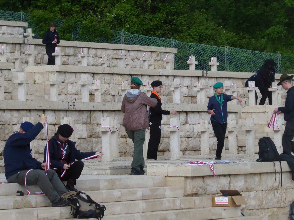 Dann fahren wir zum polnischen Friedhof. Eine Gruppe Pfadis schmückt die über 1000 Gräber mit rotweissen Bändern. Im kleinen Museum erhalten wir die Geschichte des 2. polnischen Korps auf italienisch. Zum Glück verstehe ich dazwischen einige Brocken und kann ganz verständnisvoll dreinblicken. Dieses Corps bestand aus polnischen Strafgefangenen in Russland, die dann zum Kampf eingezogen wurden. Sie machten einen langen Weg und kämpften bei Montecassino gegen die Nazis. Am 18. Mai 1944 wurde klar, dass die Alliierten gegen die Nazis siegen würden, darum wurde das ein polnischer Gedenktag.