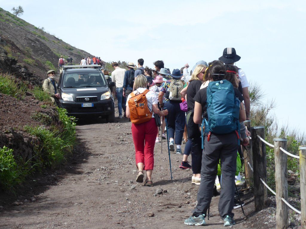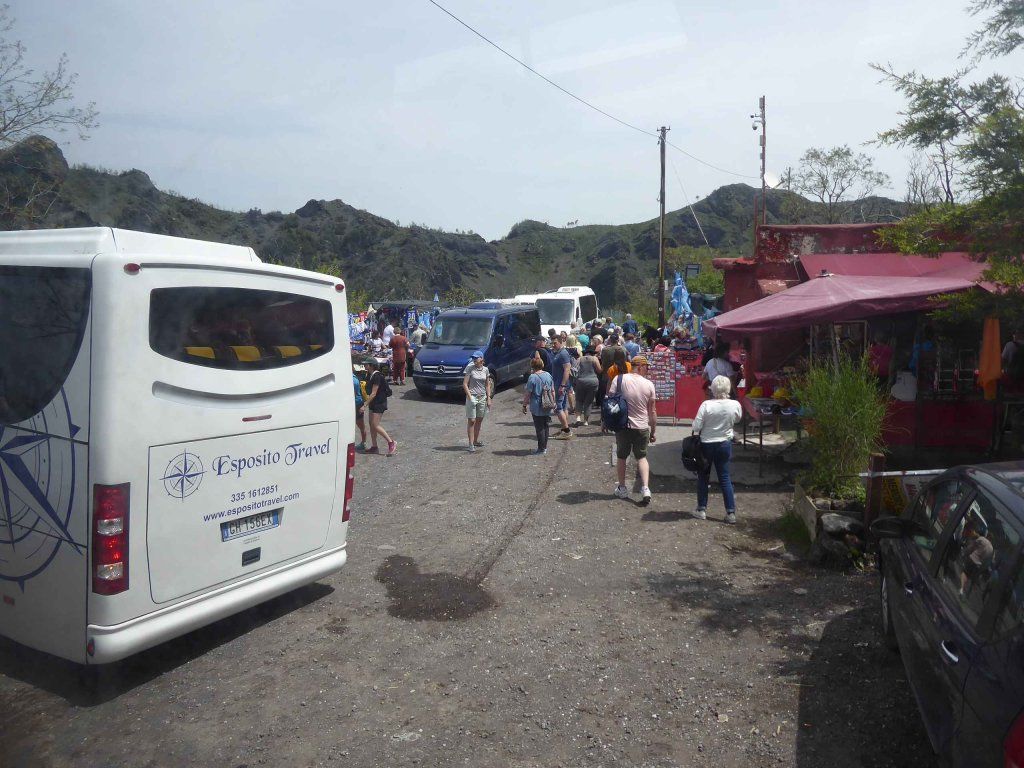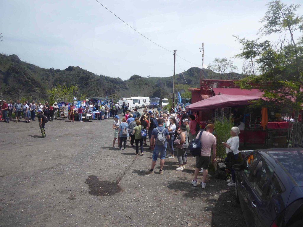 Weil gerade ganz schönes Wetter ist, packen wir die Gelegenheit und fahren mit einem Bus zum Parkplatz 280 Hm unter dem Kraterrand. Fahrt und Aussicht sind spektakulär, die Strasse eng und kurvenreich, es sind ja auch 1000 Hm zu überwinden und dazu hat es andere Cars und grosse Autos, Milimeterarbeit zum Kreuzen. Auf dem Parkplatz ist der Bär los, Cars und Autos in grosser Menge, viele herumstehende Touris und Marktstände, die einem unbedingt ein hellblaues Leibchen mit Nummer 10, Maradona, verkaufen wollen – also Chaos pur.