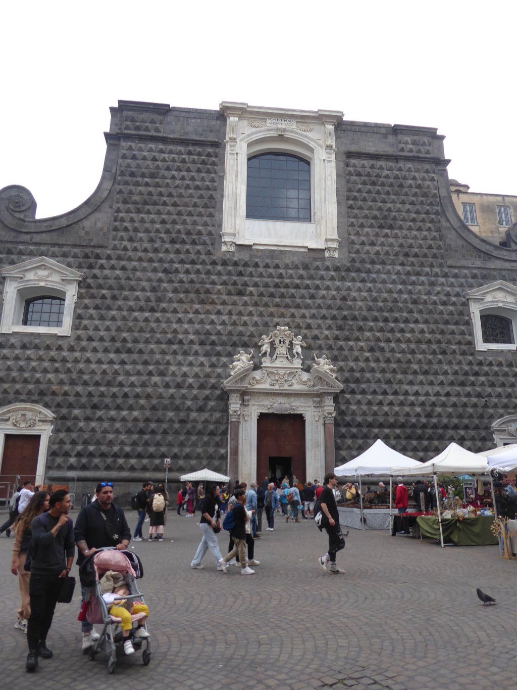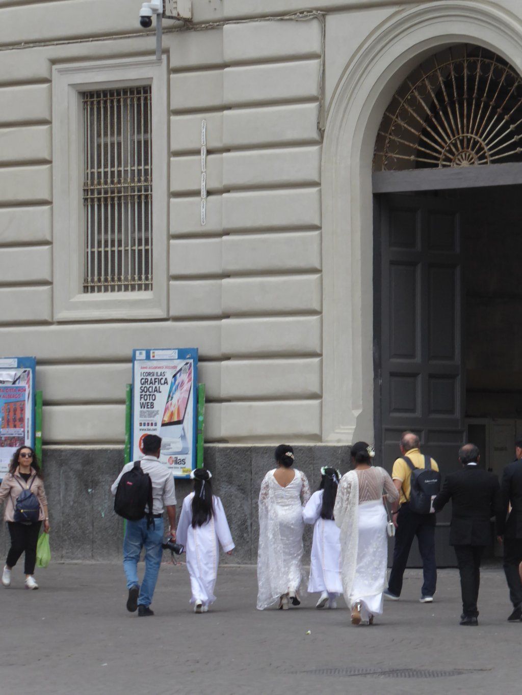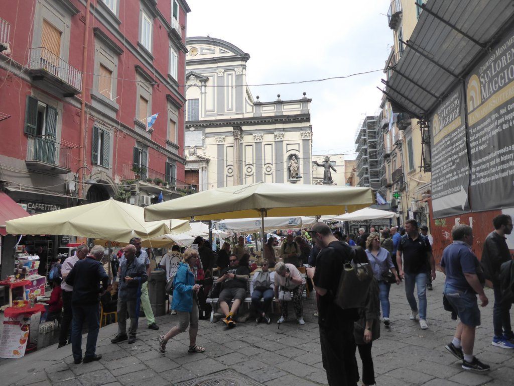 Bis dann schieben wir uns mit der Menge zum Dom, aber da ist gerade Gottesdienst. Dann finden wir die Gasse der Krippen, da ist ist das Gedränge und Gestosse am grössten. Wir suchen die einsameren Gassen und kommen zum Platz von Santa Giulia di San Domenico. Dort essen wir auf einer Terrasse mit Aussicht auf den Platz sehr fein.