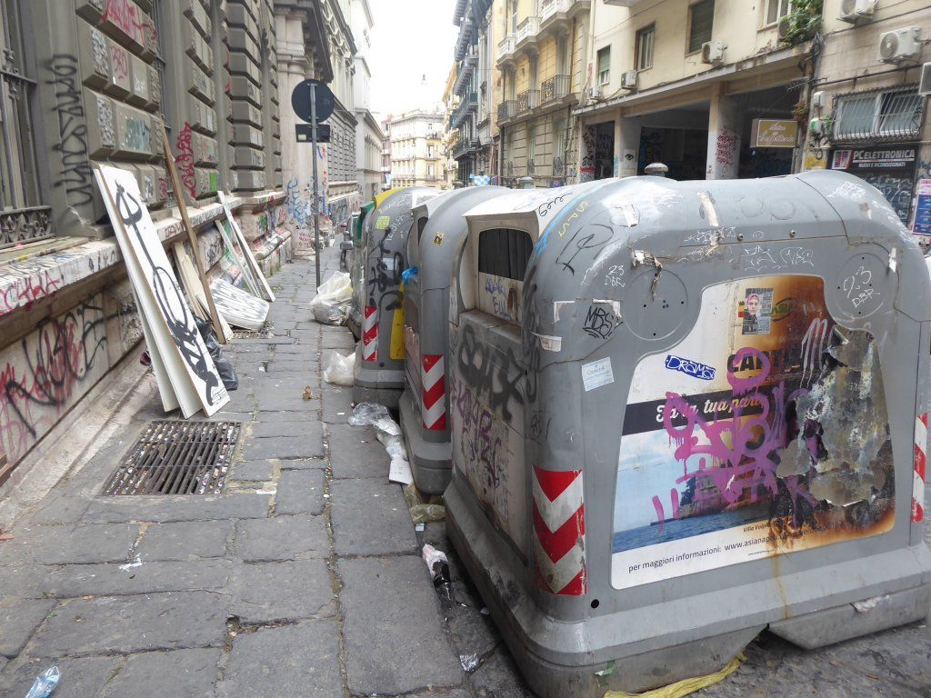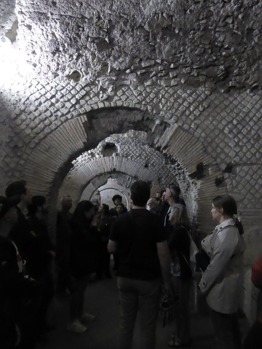 Am Morgen bringt uns der total versprayte Zug nach Napoli Stazione Zentrale Garibaldi und katapultiert uns direttissima in einen Schockzustand. Die vielen Leute, der Lärm, alles versprayt und überall Abfall ! Wir schieben uns mit der Menge dem Corso Umberto entlang und zweigen bei der Via Duomo ab. Mitten in die Menge fahren immer wieder Töffs und hupen, wenn sie nicht weiter kommen. Bei Napoli Sotterrana kaufen wir ein Billett für die englische Führung um 15:15 Uhr.