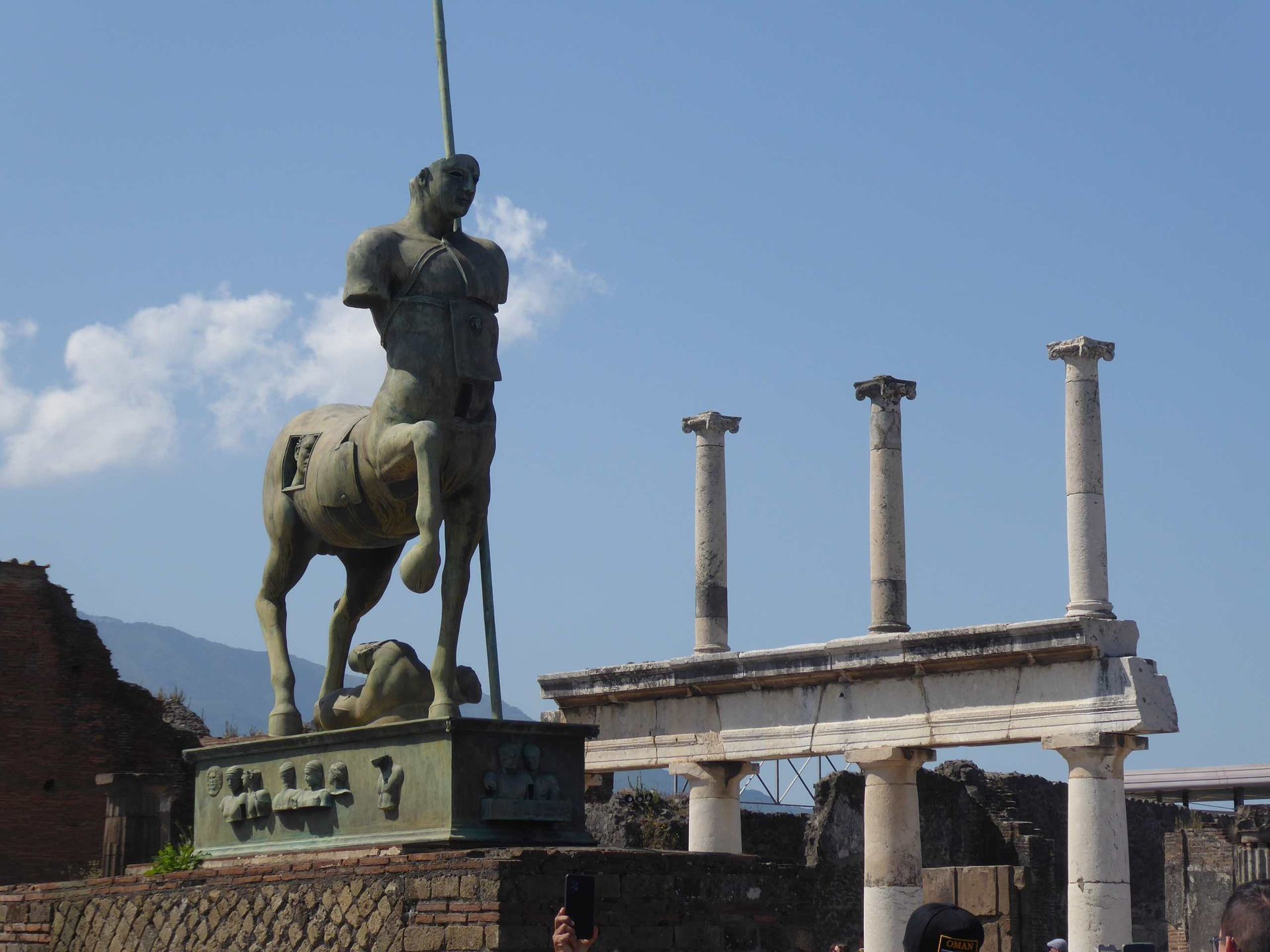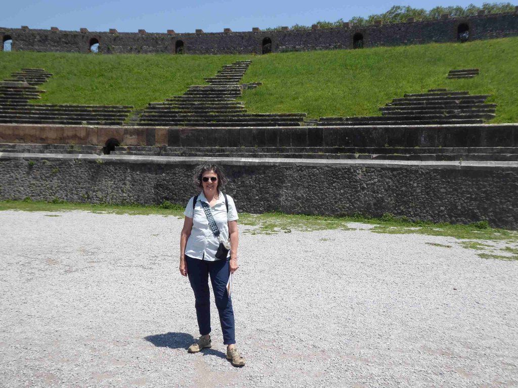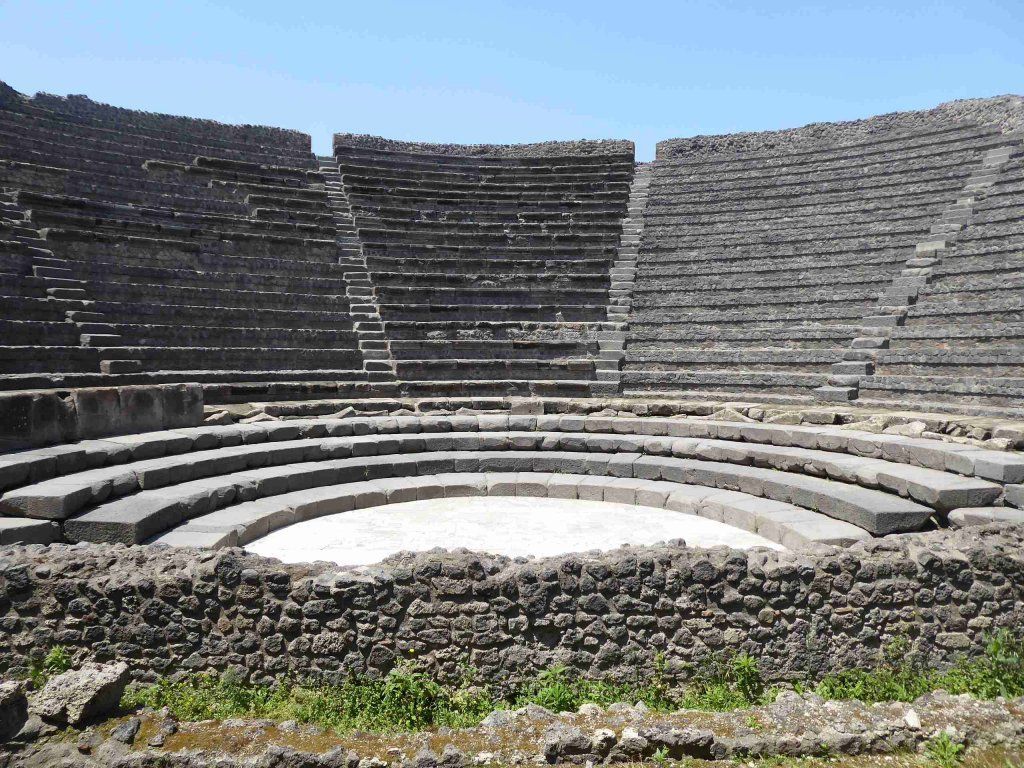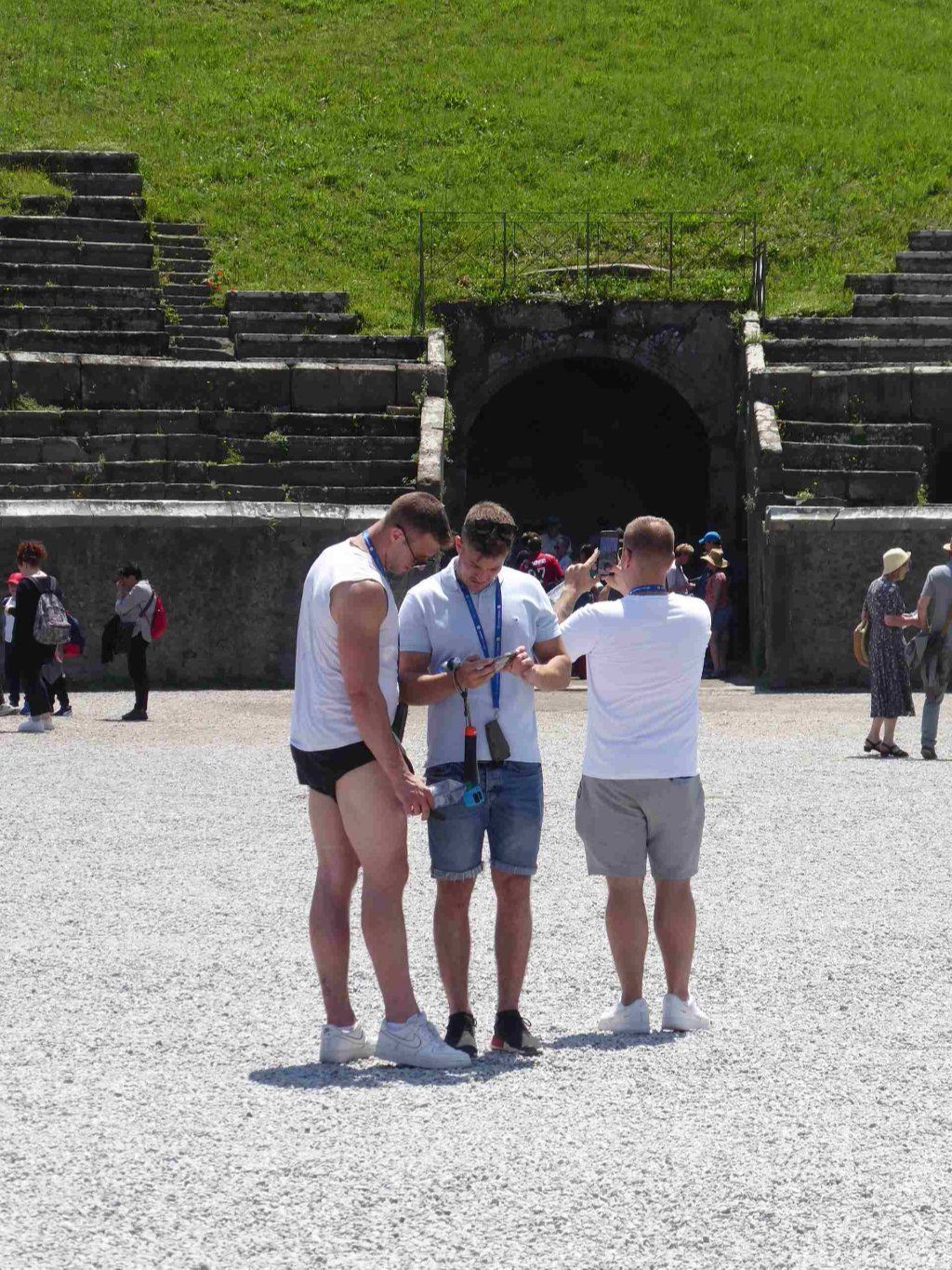 10. Nach der Führung erkunden wir Pompei alleine weiter. Wir kommen zum Amphitheater und treffen auch drei „Gladiatoren“. Dort wo früher Gladiatoren und Tiere waren, ist eine Ausstellung des Konzerts von Pink Floyd 2005. Das grosse Theater wird auch heute noch genutzt, darum kann es nicht besichtigt werden. Aber auch das kleine Theater ist imposant.