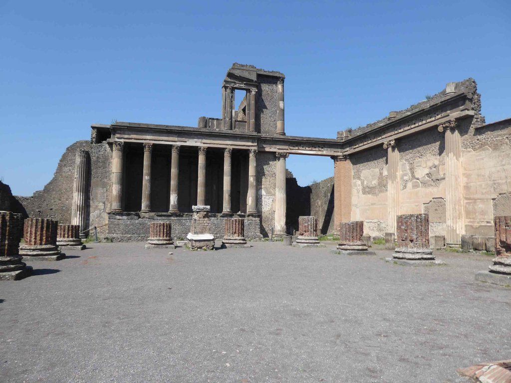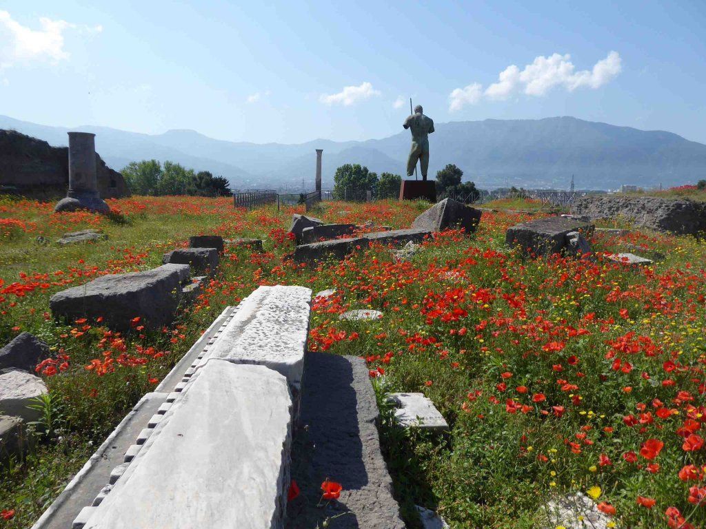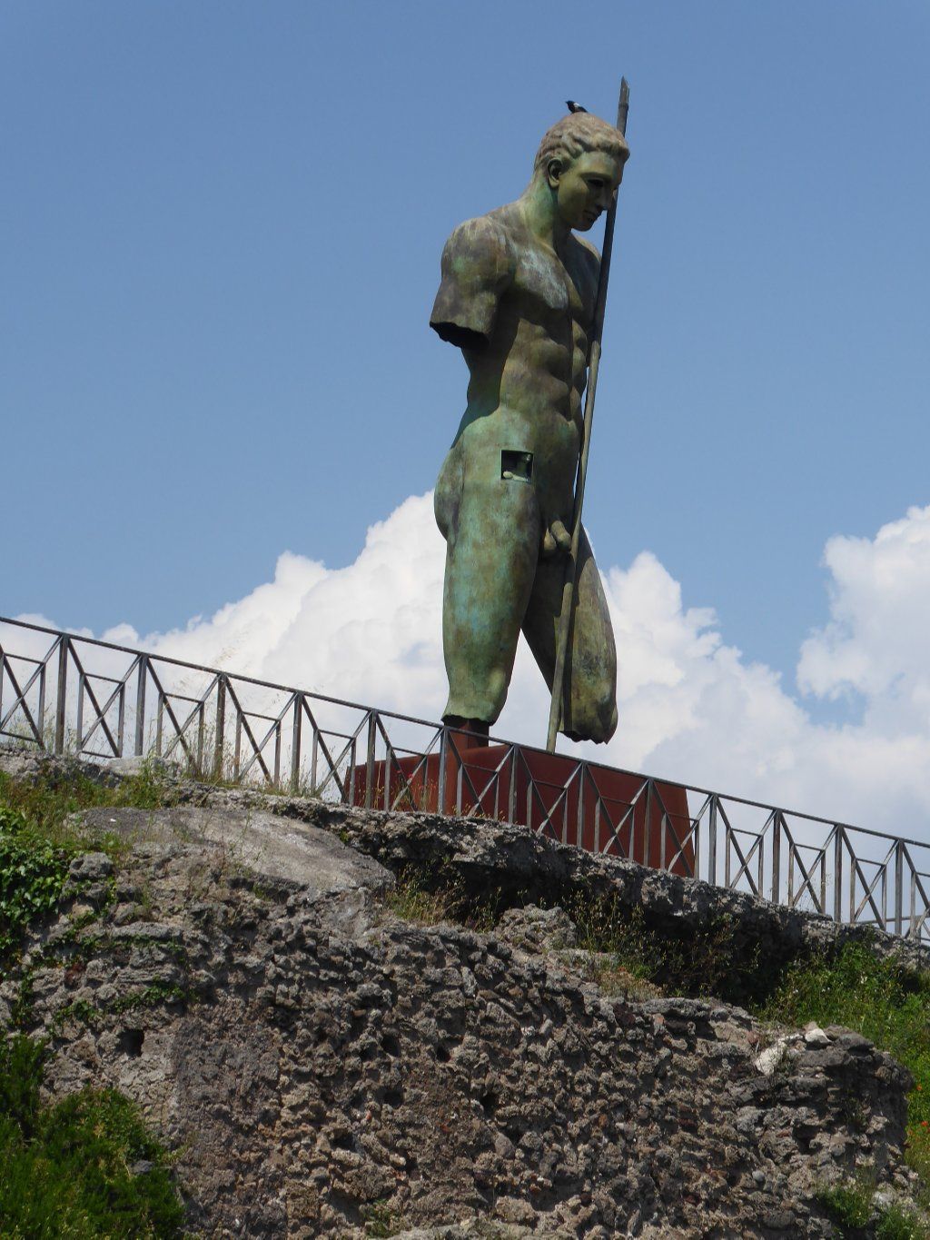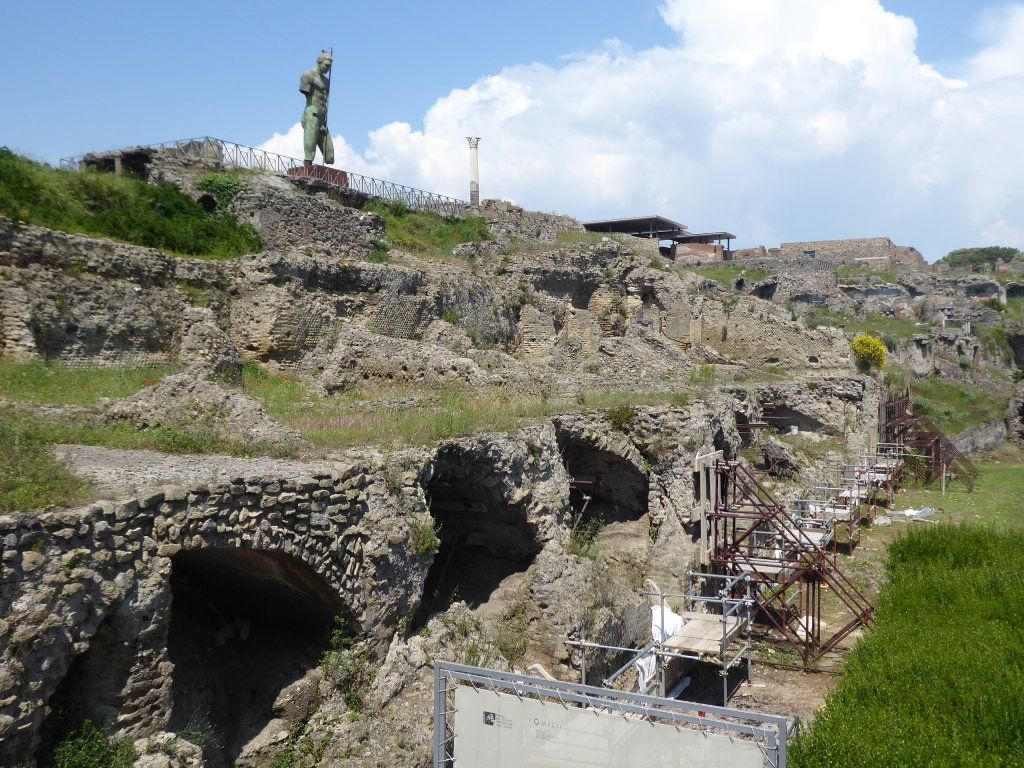 10. Nach der Führung erkunden wir Pompei alleine weiter. Wir kommen zum Amphitheater und treffen auch drei „Gladiatoren“. Dort wo früher Gladiatoren und Tiere waren, ist eine Ausstellung des Konzerts von Pink Floyd 2005. Das grosse Theater wird auch heute noch genutzt, darum kann es nicht besichtigt werden. Aber auch das kleine Theater ist imposant.
