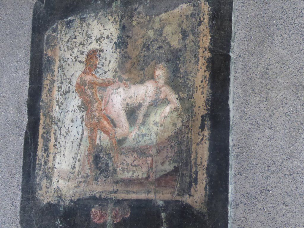 3. Neu war die Verbindung zum Lupanare = Freudenhaus, die ist allerdings wissenschaftlich nicht gesichert laut unserem Reiseführer. Eine tolle Geschichte ist es allemal. Ein Mann zahlt eine Münze und wählt Stellung, Ort und Prostituierte. Nach der Sauna geht er in den oberen Stock zu der Liege wo sein Wunsch angeboten wird, gibt die Münze ab und voilà wird seine Lust gestillt. Prostituierte waren Griechinnen oder Orientalinnen. Der Penis an der Säule weist auf ein Lupanare hin.