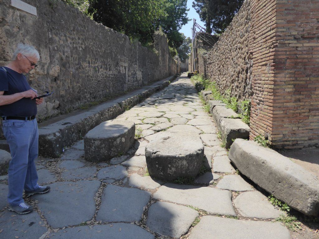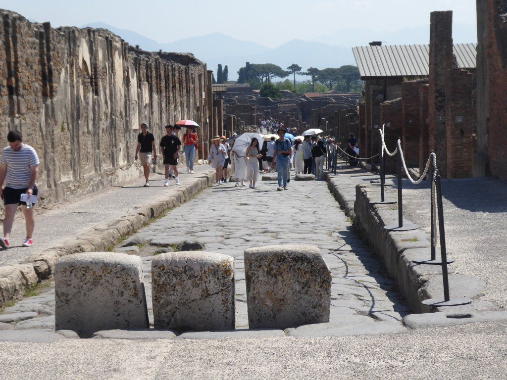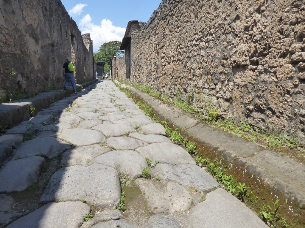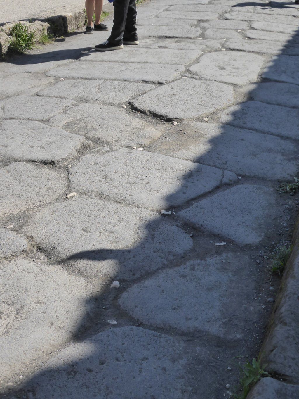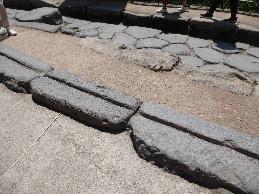 4. Die Strassen sind aus Vulkangestein, gross klobig mit Rillen auf beiden Seiten. Da fuhren die Sklaven mit den Wagen. Fussgängerstreifen waren für die Reichen erhöht, übrigens nix für Highheels. Dazwischen sind kleine weisse Steine eingebaut: die Strassenbeleuchtung in der Nacht.