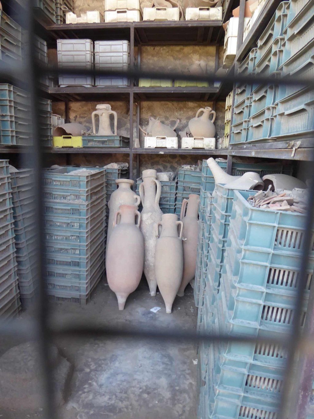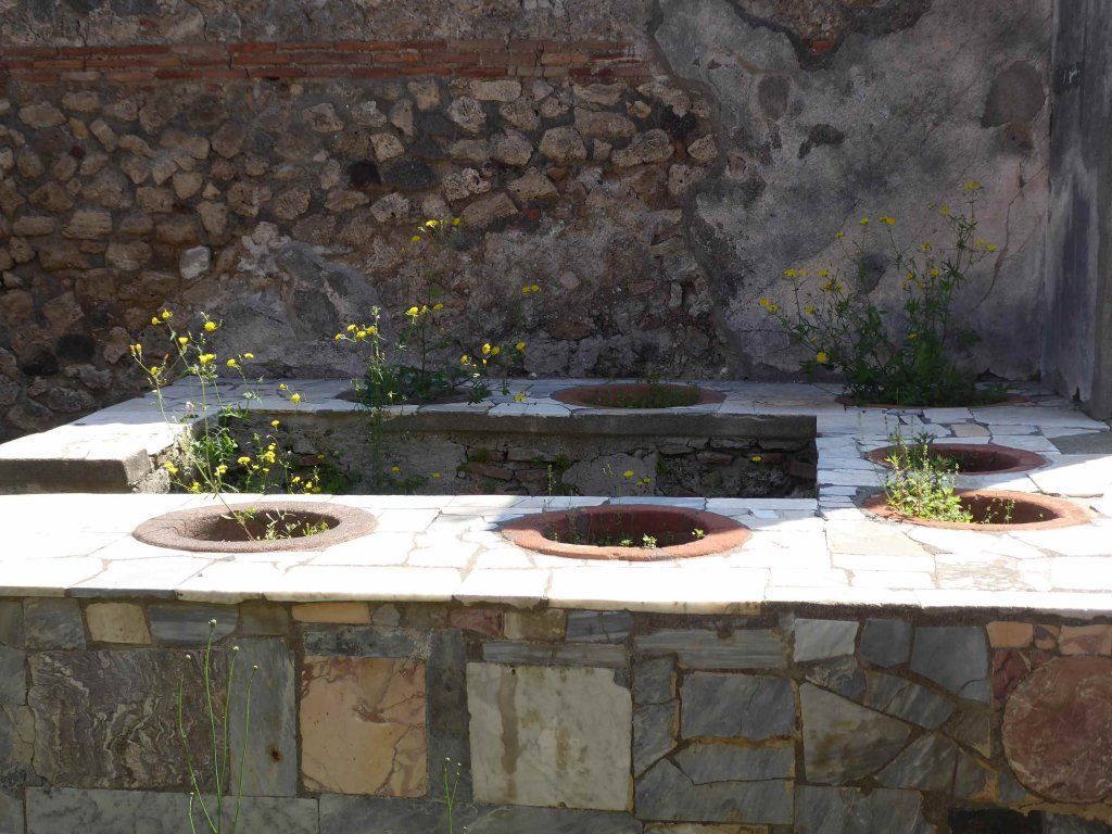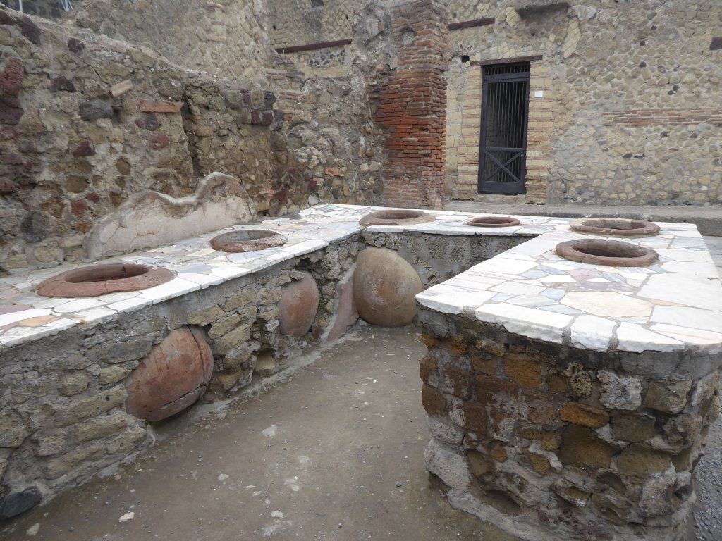 7. Geschäfte und Läden hatten eine Rille am Eingang. Da konnten sie mit Gittern geschlossen werden. Was wir als Küchen ansahen sind auch Läden. In den Vertiefungen ist das Verkaufsgut. Man fand bei den Ausgrabungen karbonisiertes Gemüse. Krüge und Amphoren wurden gebraucht um Wein, Öl und Lebensmittel aufzubewahren.