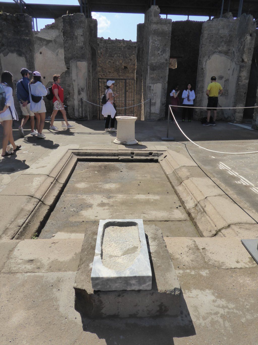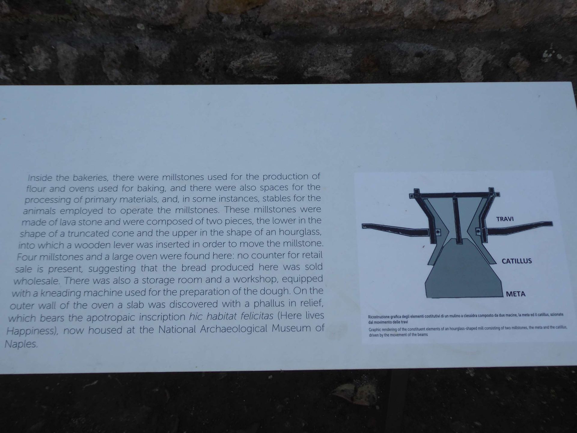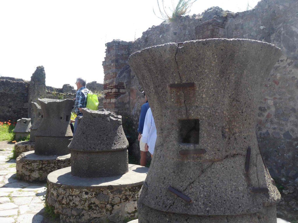 8. Wir sehen die Bäckerei von Modesto. Da sind die Mühlen für das Mehl aus Lavasteinen und ein grosser Pizzaofen. Es wurden sogar noch Brote gefunden.