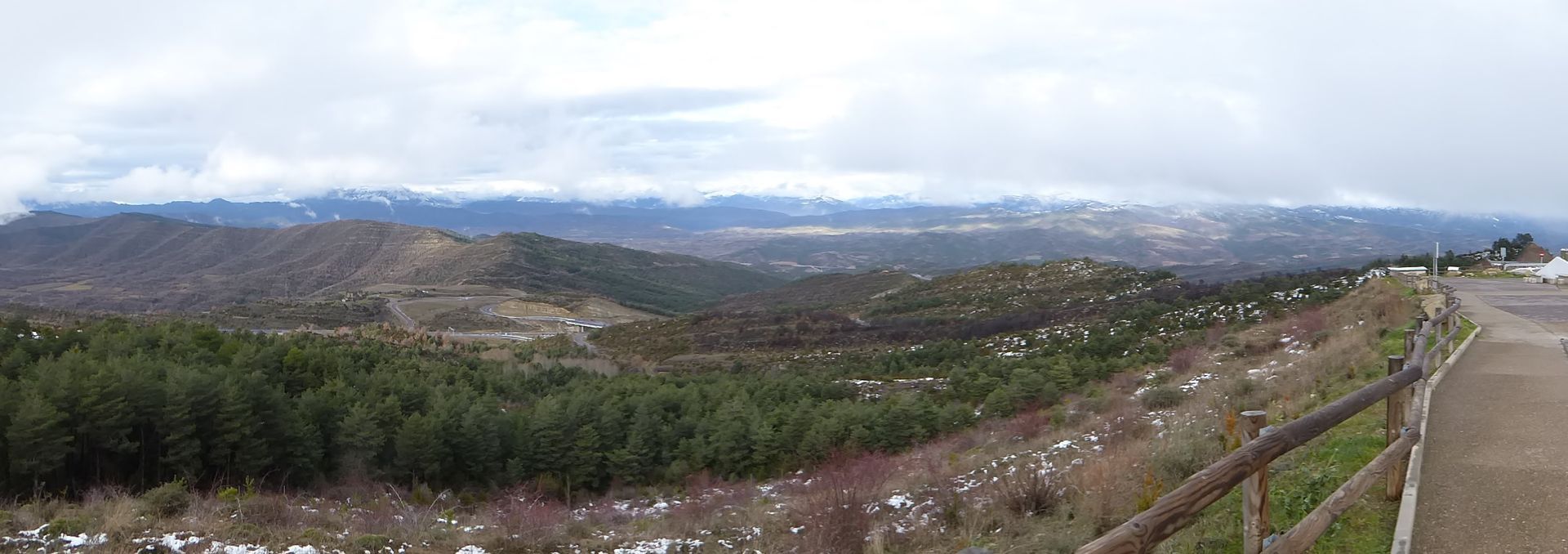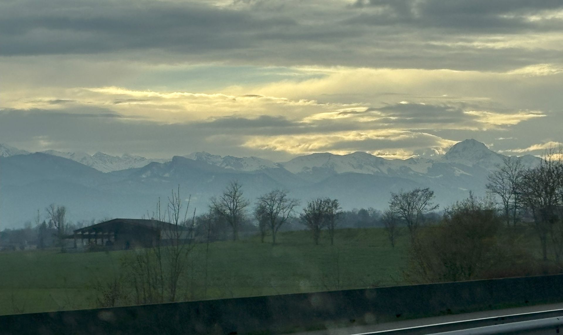 Beatrice kurvt auf engen Strassen über Hochebenen mit Schneeresten, Hans übernimmt die Autobahnen. Wir fahren bis an die Pyrenäen nach Toulouse und dem Gebirge entlang bis Pau. Dort finden wir eine wahre Aussichtsterrasse zum Übernachten.