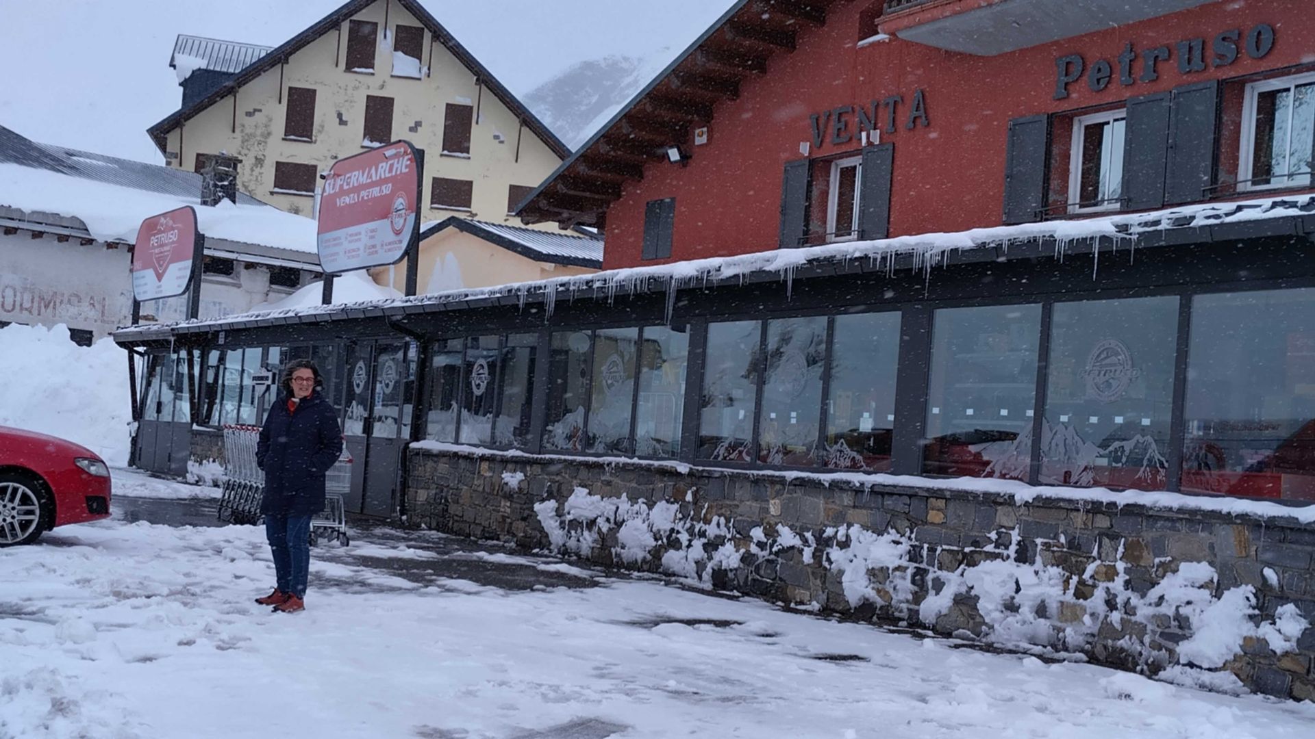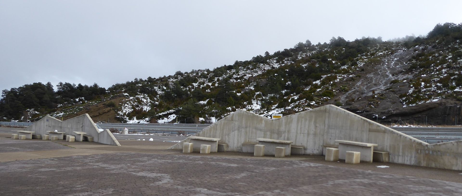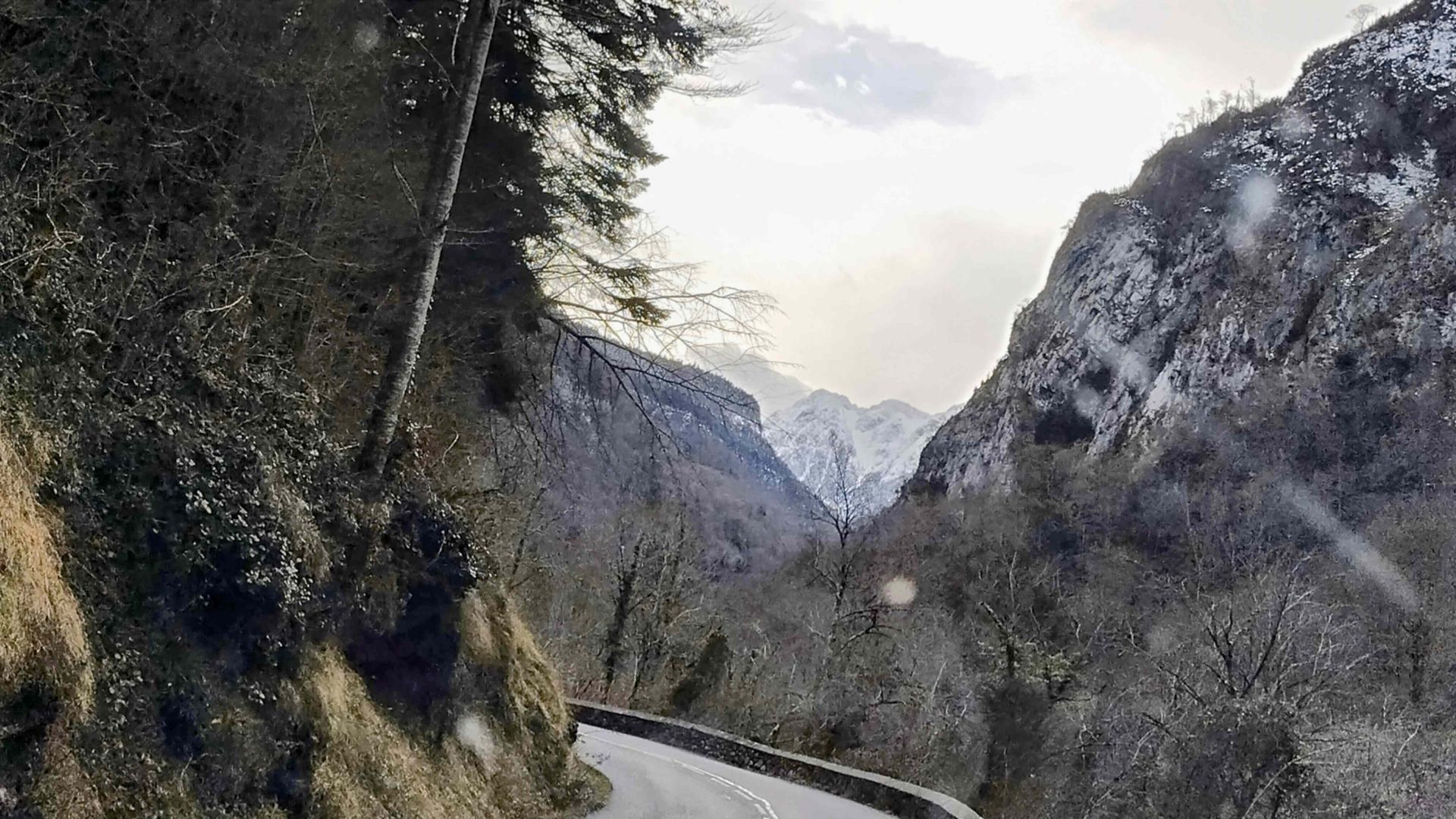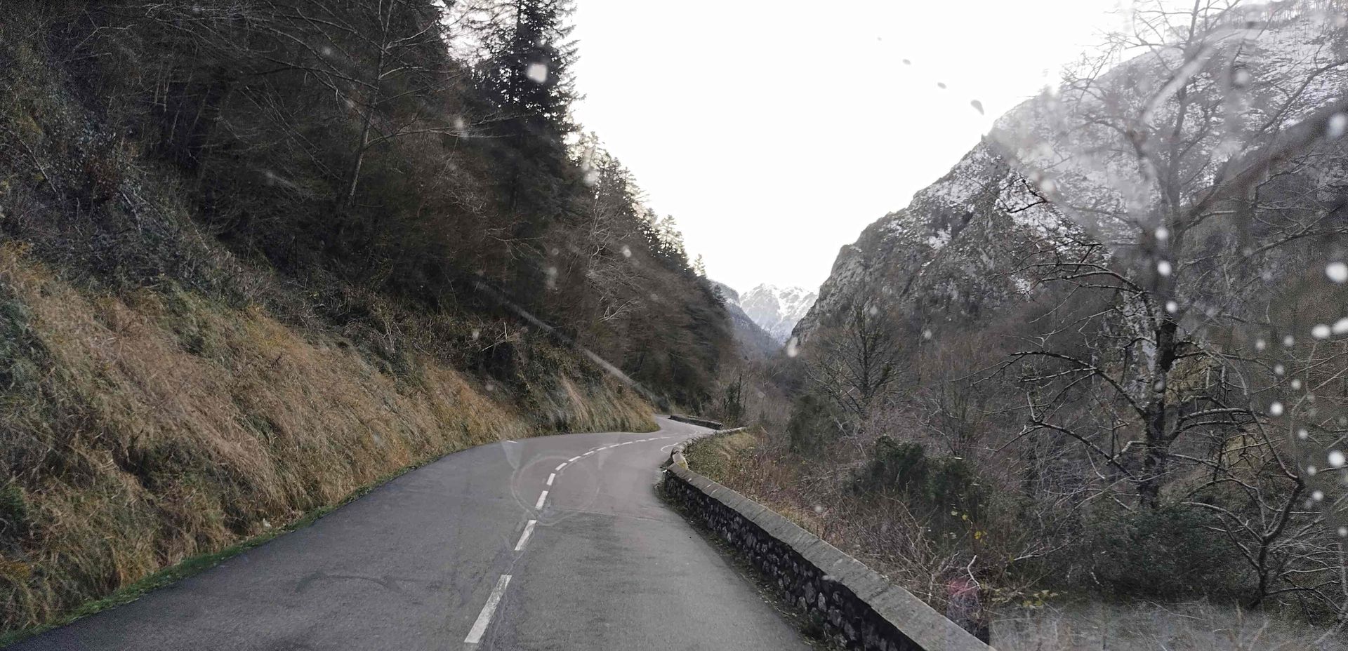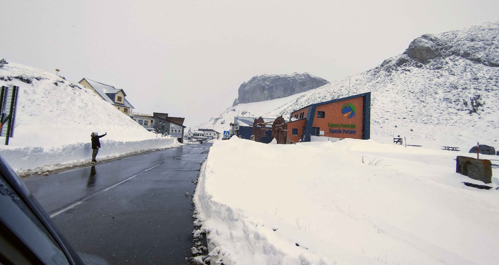 Der Pass mit dem Tunnel de Somport ist geschlossen und der nächste Übergang über die Pyrenäen ist der Pass de Pourtalet, 1794 m. Wir kurven ein enges Tal hinauf, überwinden 1400 m und oben auf dem Pass liegt Nassschnee und es schneit – schöner Empfang von Spanien.