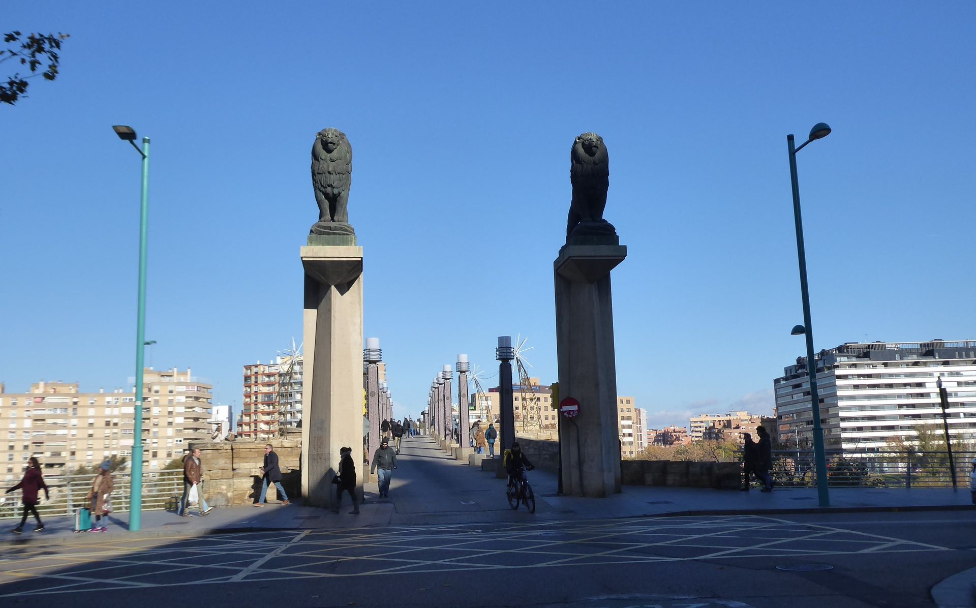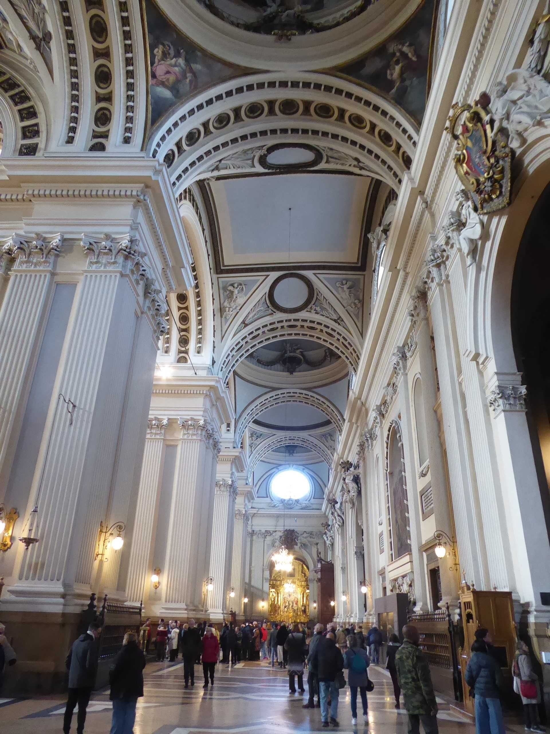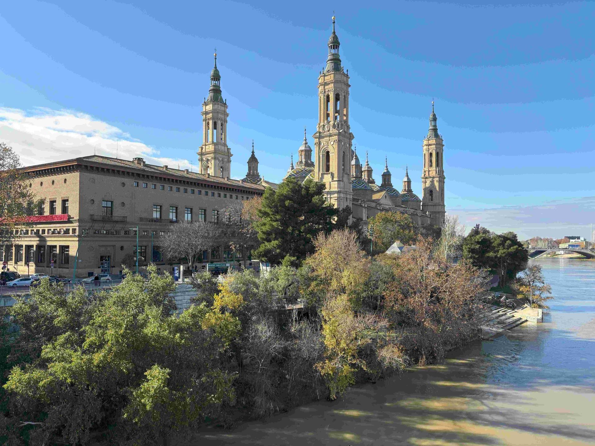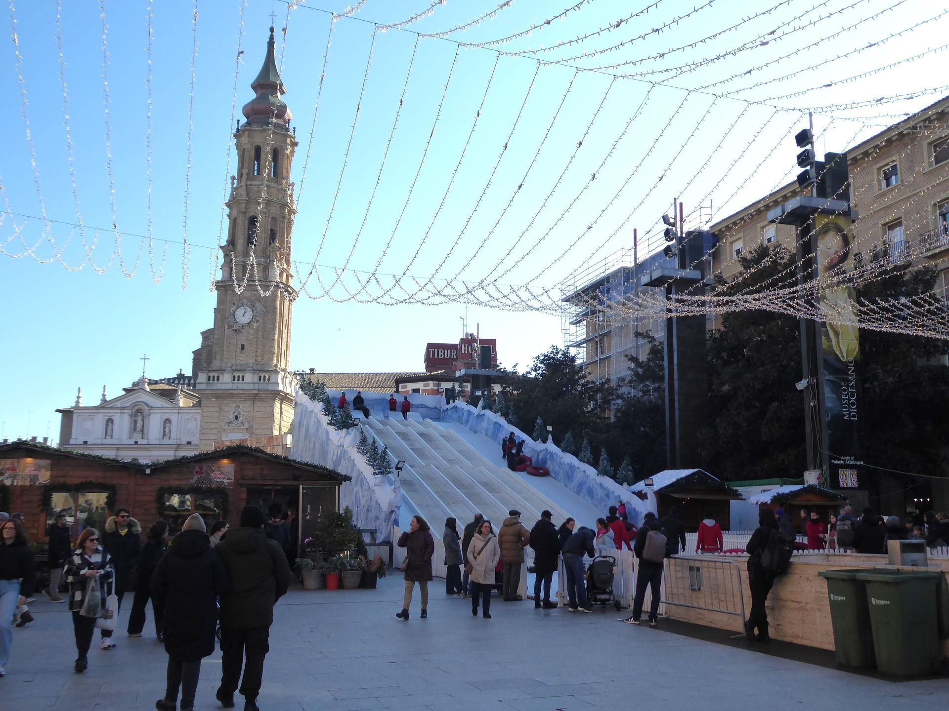 Nach drei Tagen Autofahren wollen wir in Spanien ankommen und stellen uns auf den Camping Municipal. Von da kommen wir mit dem Bus 41 in die Innenstadt. Die Sonne scheint aber es ist unspanisch kalt und die «Bise» bläst. Eine Altstadt haben wir nicht gefunden, dafür viele riesige Wohnsilos. Die Gassen sind schattig, sicher ein Vorteil im Sommer. Wir gehen bis zum Plaz del Pilar (= Säule). Dort ist ein grosser Weihnachtsmarkt, «Schneesport» für Kinder und ganz viele Leute. Es ist laut und eng. Auch in der Basilica de nuestra Senora del Pilar, da soll man zwar ruhig sein, aber in einer Kapelle werden viele Kinder getauft, deren Name über Lautsprecher ausgerufen werden. Wir bewundern das Bauwerk, die vielen Kapellen, das Gold und die festlich gekleideten Leute. Die Kathedrale del Salvador lassen wir aus, sie kostet 9 Euro Eintritt. Nach den ersten spanischen Tapas in einer lauten Bar fahren wir wieder in die Stille unseres Bänz.