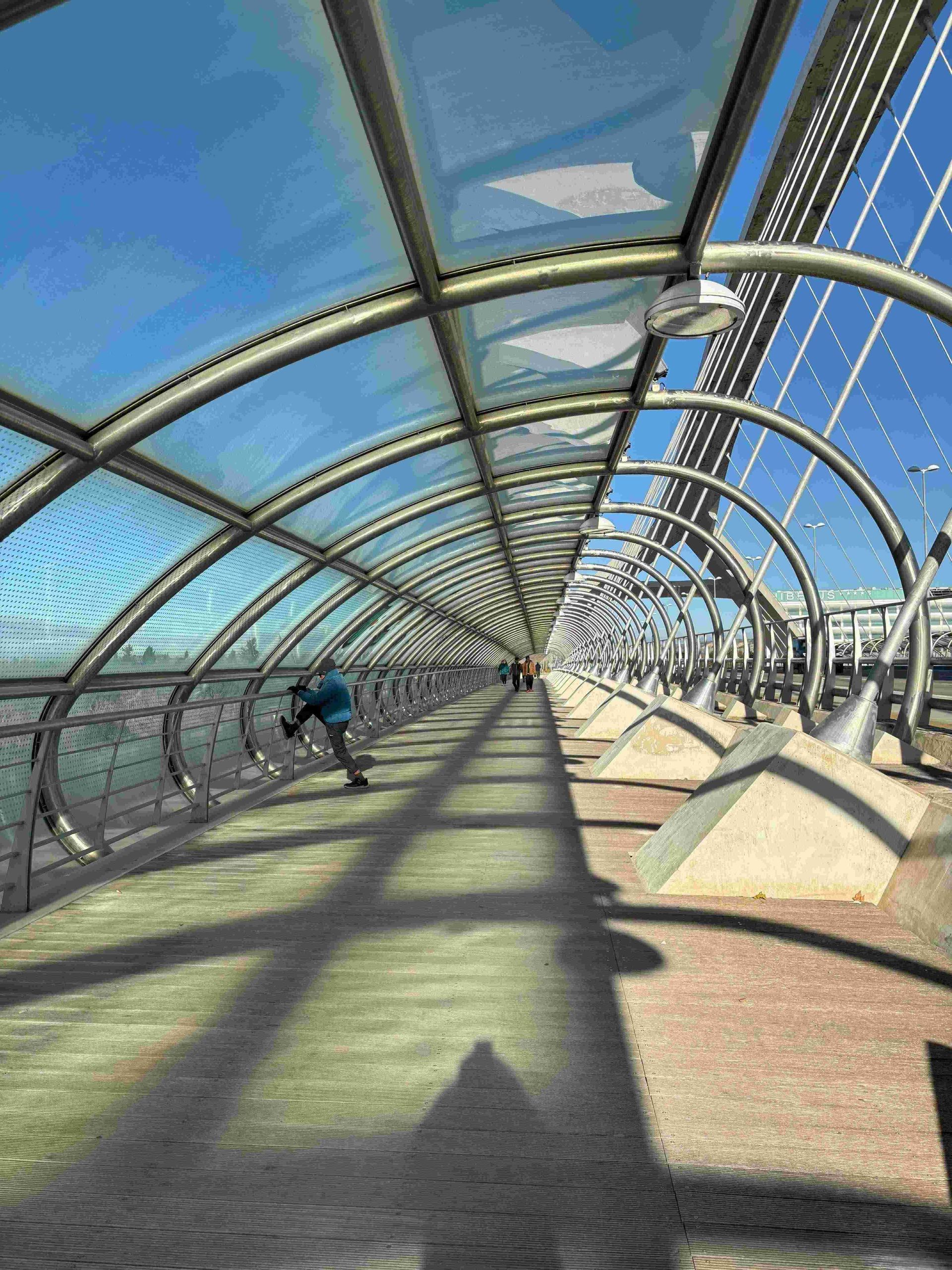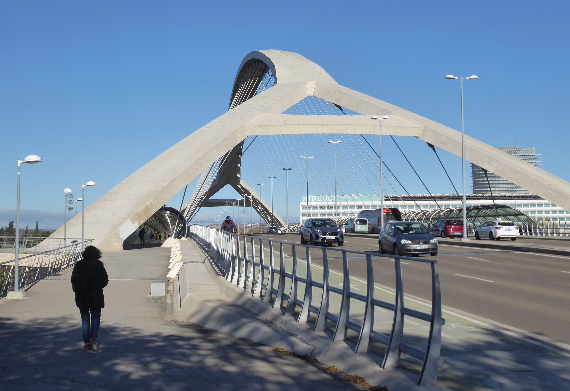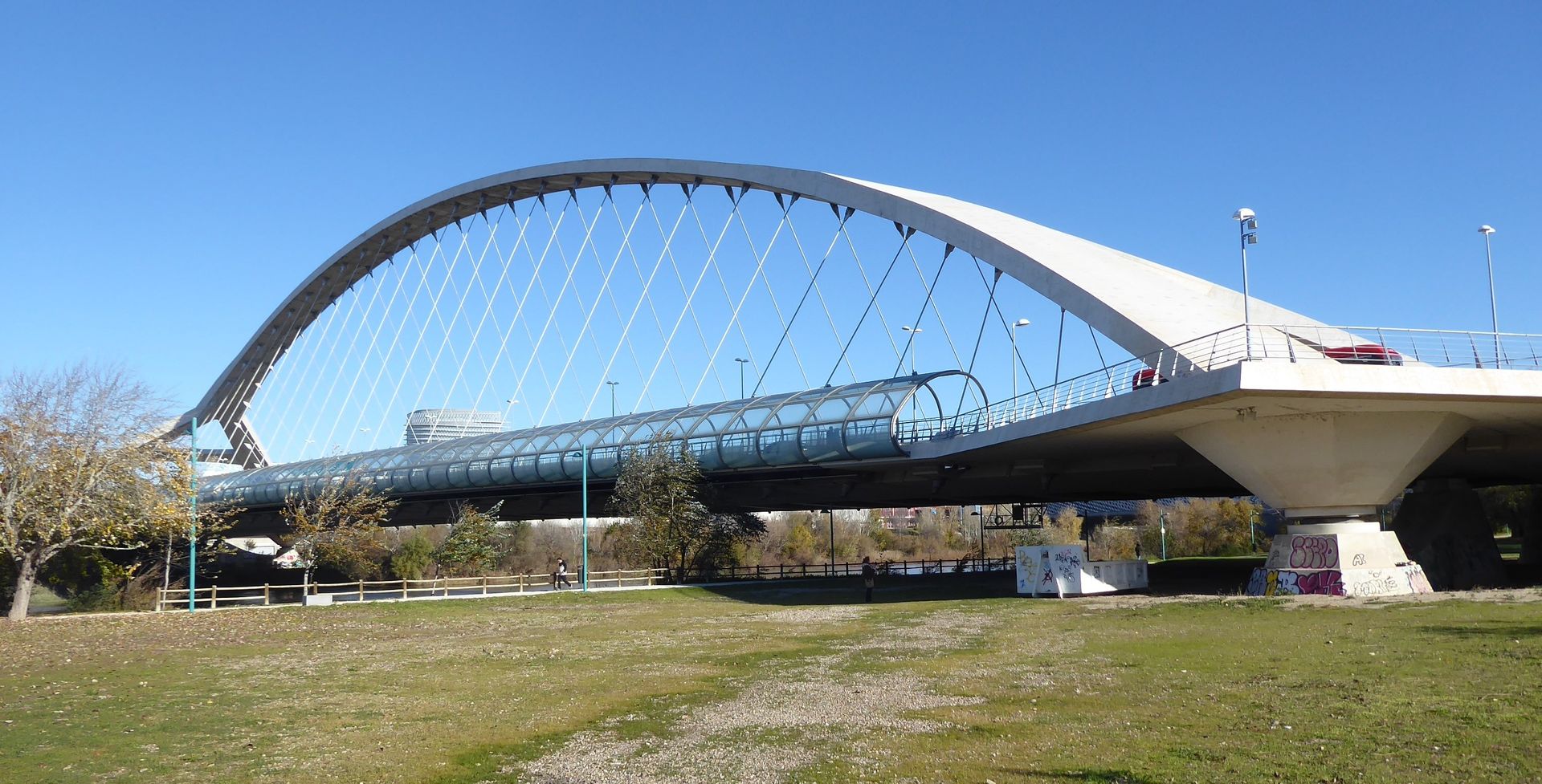 Am andern Morgen wollen wir die Brücke des dritten Jahrtausends sehen, die anlässlich der Weltausstellung 2008 in Zaragoza gebaut wurde. Es gibt drei Spuren in beide Richtungen: eine für Autos, eine für Velos und eine verglaste für FussgängerInnen. Es ist eine Hängebrücke an einem sehr eleganten Betonbogen. Davor gibt einen Parkplatz für 5000 Autos. Der ist zu zwei Dritteln voll, weil ein riesiger Markt stattfindet.
