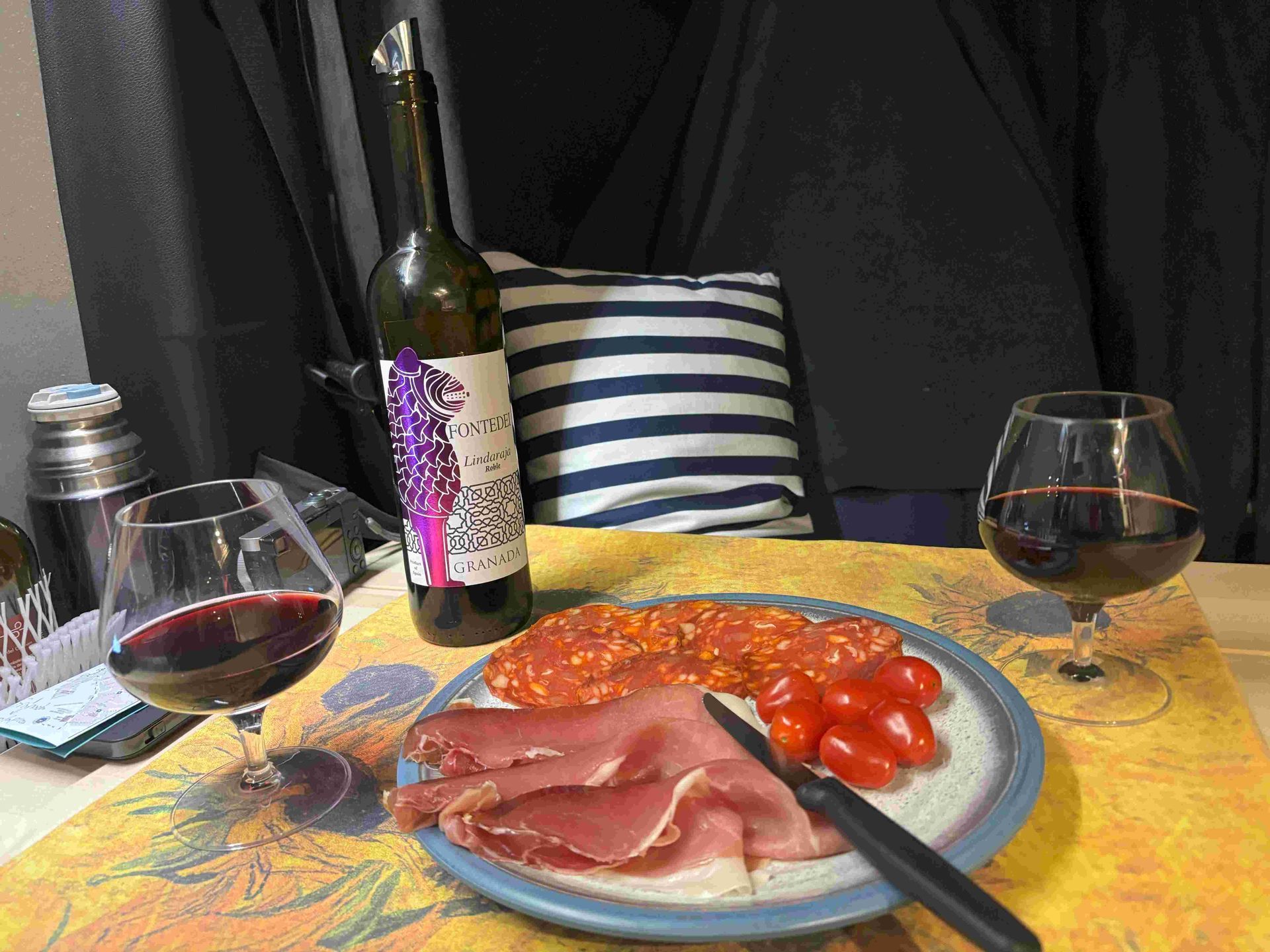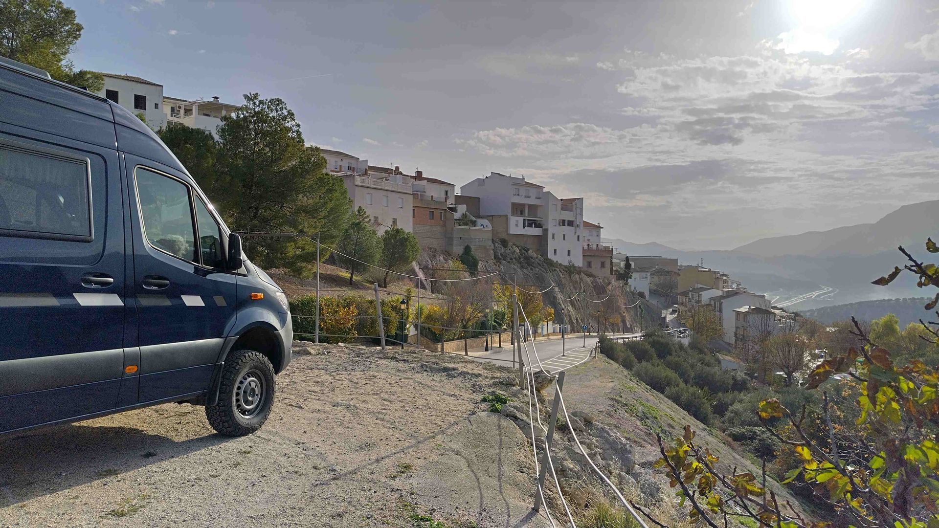 Es wird 18 Uhr und die Stadt wird lebendig. Scheinbar alle Leute gehen zum Apero. So auch wir. In einer Bar trinken wir ein Glas Wein und dazu gibt es einen kleinen Teller mit 4 Salamischeiben, ein paar Oliven und etwas Brot. Genau nach unserem Geschmack. Wir übernachten in La Guardia de Jaén auf einer Aussichtskanzel über dem Dorf.