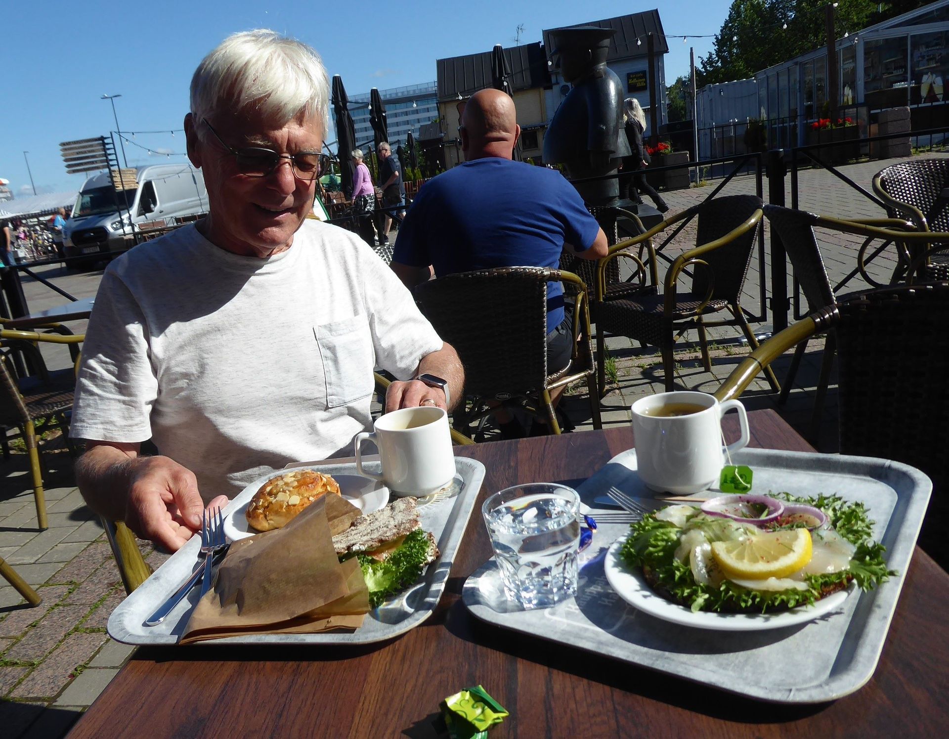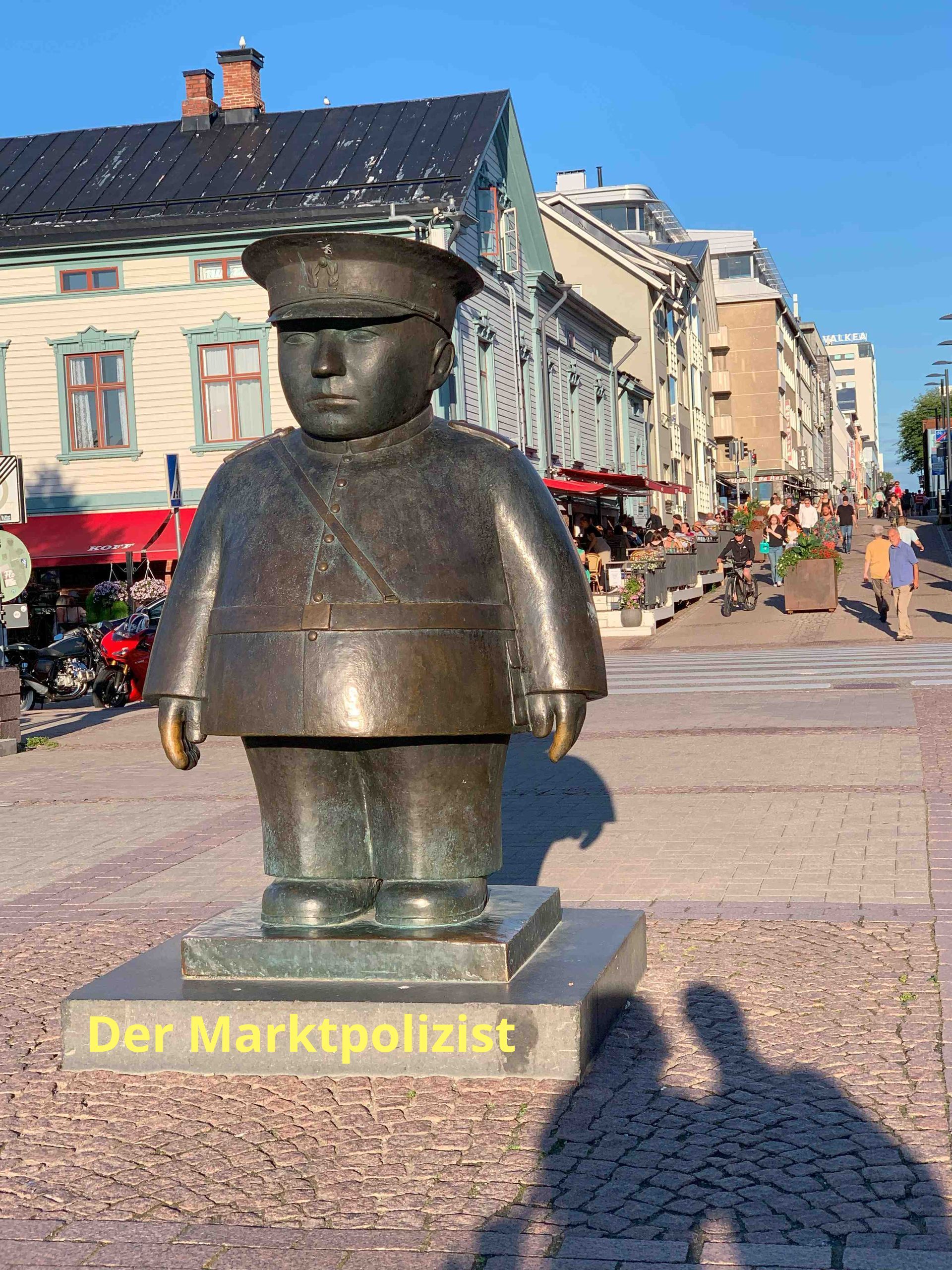 Wir möchten den Bänz waschen, weil er nach dem vielen Regen ziemlich braun ist. Leider finden wir keine Anlage für so hohe Autos. Zum Glück: Wir fahren auf ungeteerter Strasse nach Oulu am Meer. Dort stellen wir uns an einen Plaisirhafen nur 1 km vom Marktplatz entfernt. Wir erkunden die Innenstadt zu Fuss, lädelen etwas und am Schluss essen wir fein am Marktplatz im Rücken des Marktpolizisten. Am nächsten Morgen marschieren wir wieder auf den Markt zum Frühstück mit ausgezeichneten Fischbrötchen.