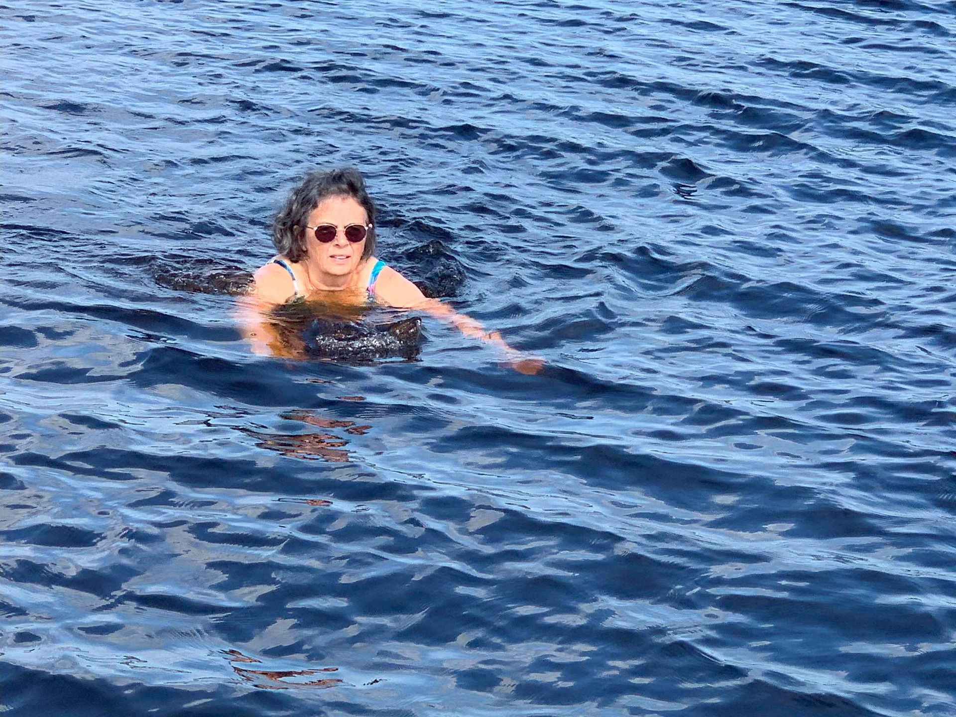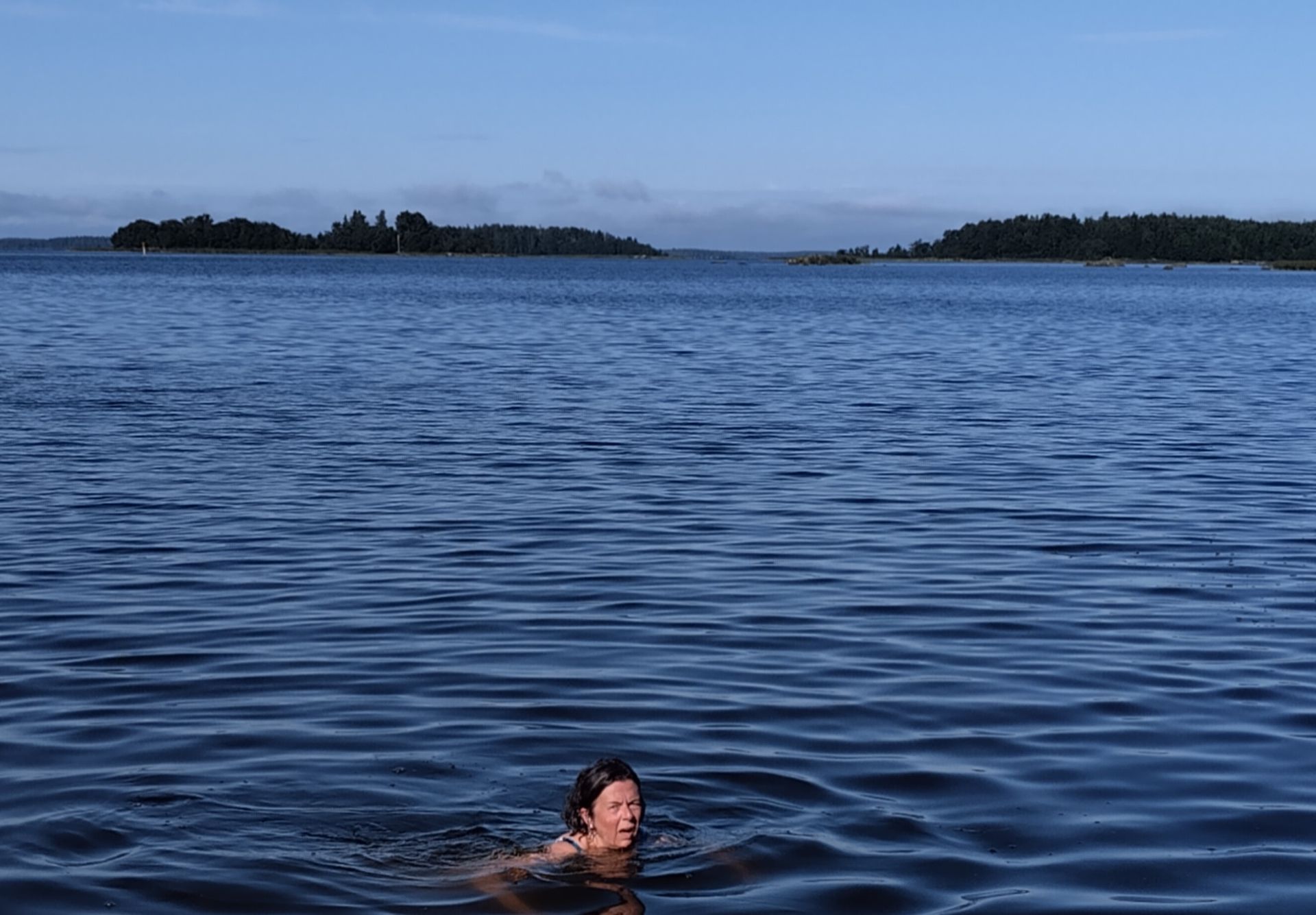 Die nächsten drei Tage verbringen wir in Överhörnäs mit Monica und Peter, die durch Schweden nach Süden reisen. Wir grillieren, essen feinen Kuchen von Monica und erleben gemütliche Stunden. Es ist sommerlich warm, darum kühlt sich Beatrice im Meer ab.