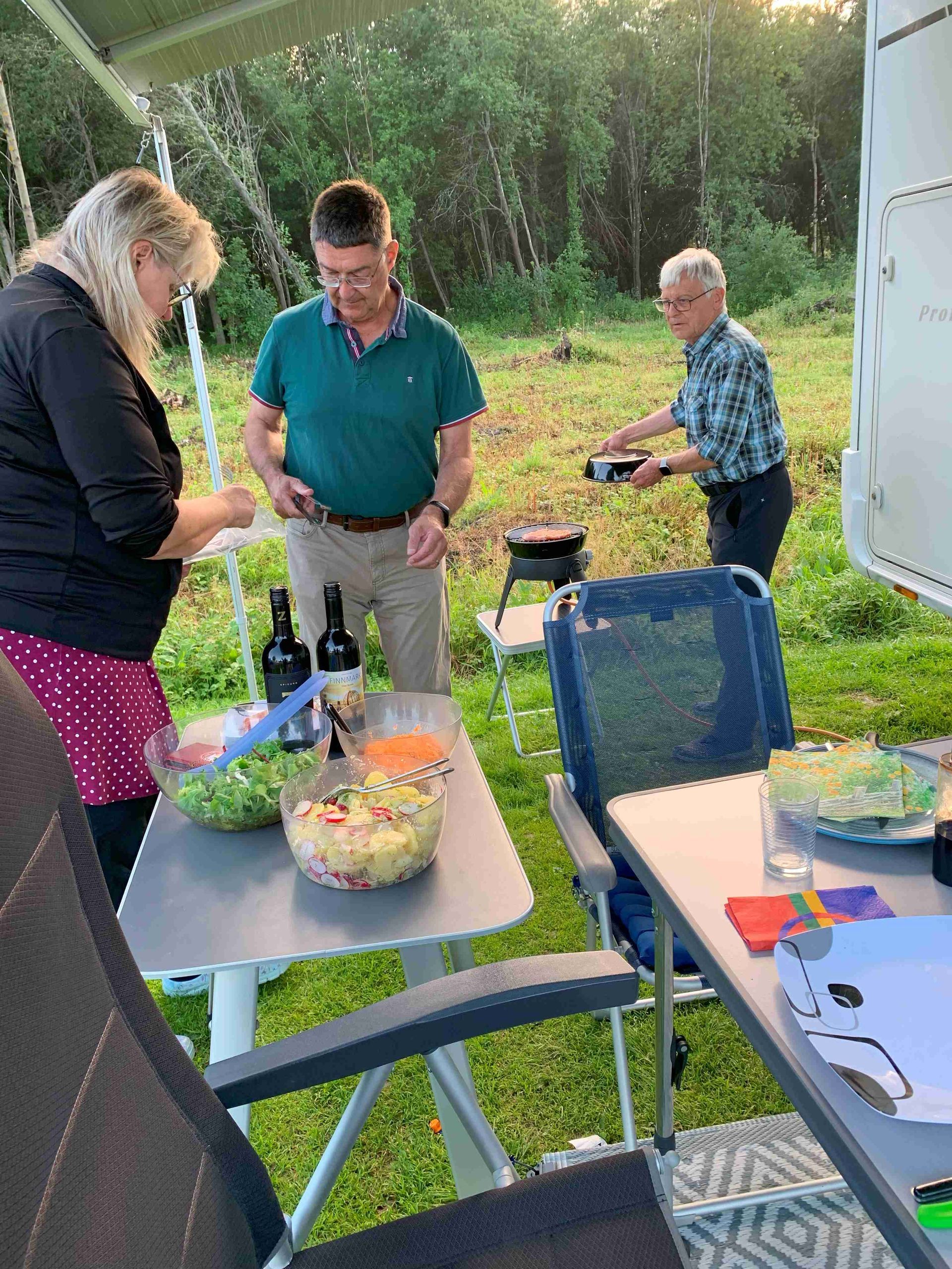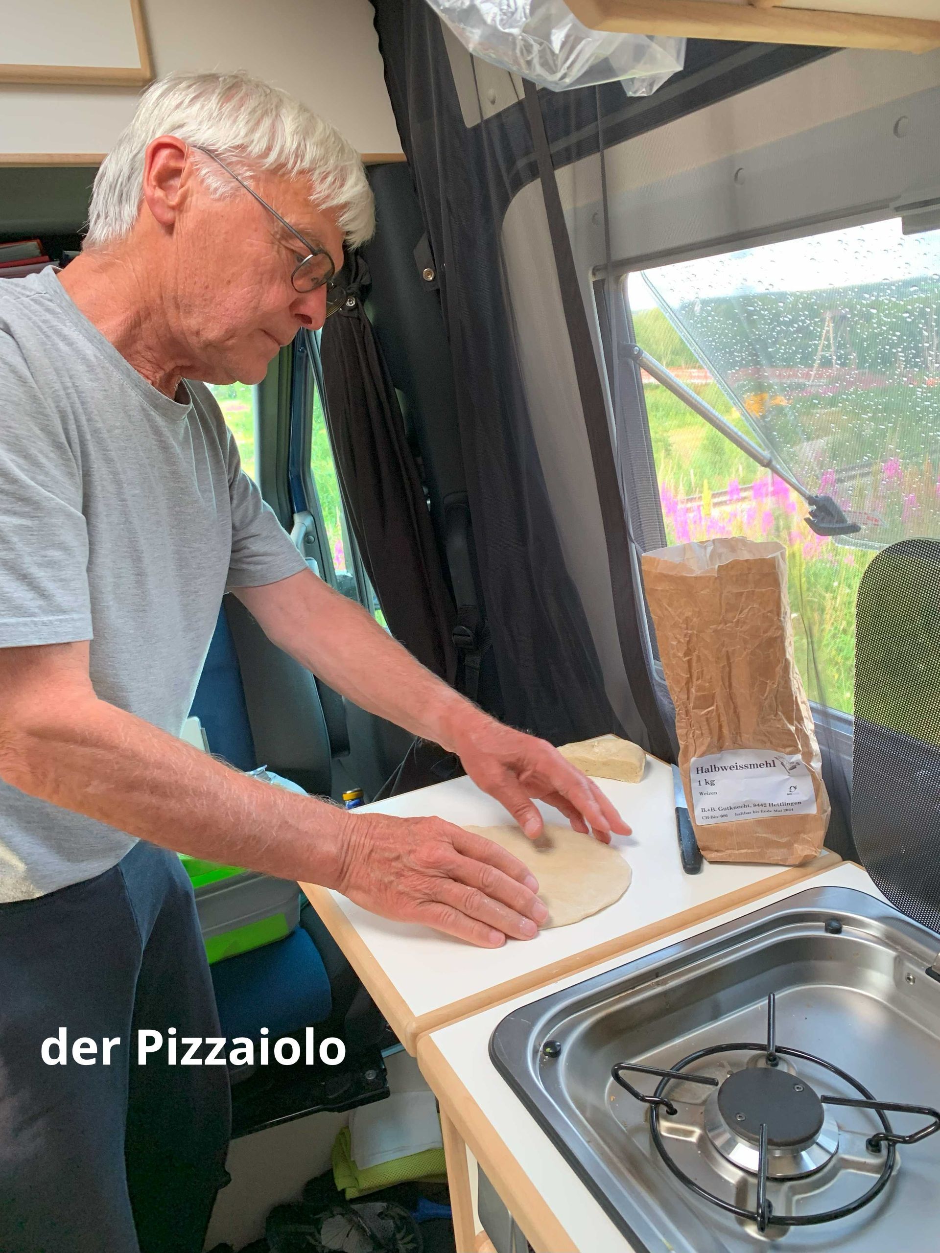 Wir fahren fast jede Tankstelle an und treffen dabei hilfsbereite Menschen und schöne Häuser. In Funäsdalen, einem Wintersportort auch mit Sommerbetrieb erhalten wir den entscheidenden Tipp: Gummi und Maskine in Röros. So verlassen wir Schweden wieder und nach zehn Minuten ist die Flasche gefüllt, kostet 16 Euro und wir können wieder kochen. Auf diesem Camping waren wir schon vor 2003 mit dem Zelt. Vor vier Jahren wurde die Wiese terrassiert für den Campingboom. Und wil wir wieder Gas haben, können wir wieder fein kochen: Hier der Pizzaiolo und sein Werk.