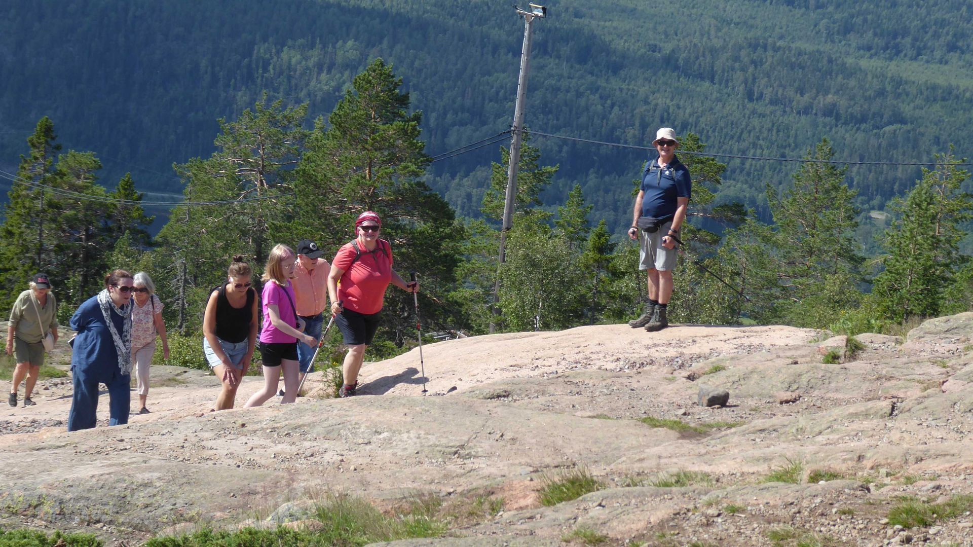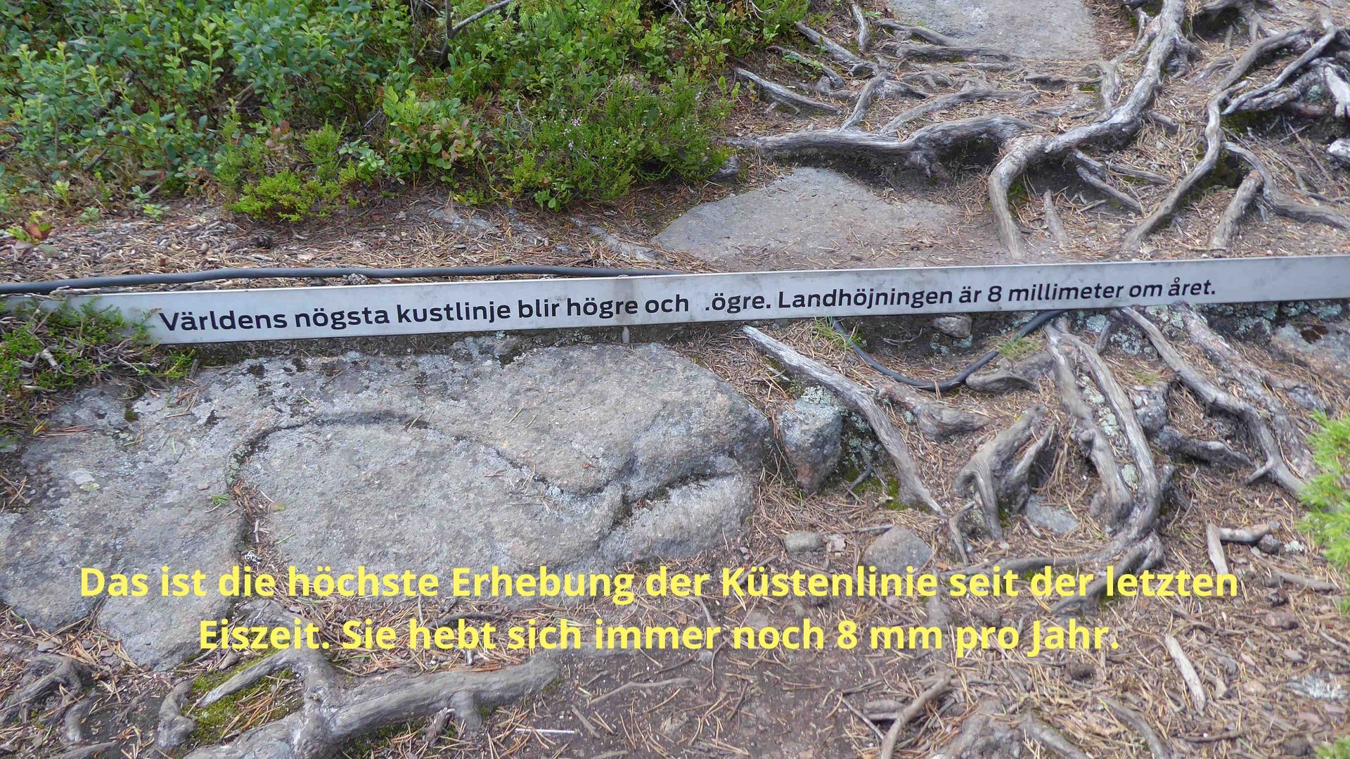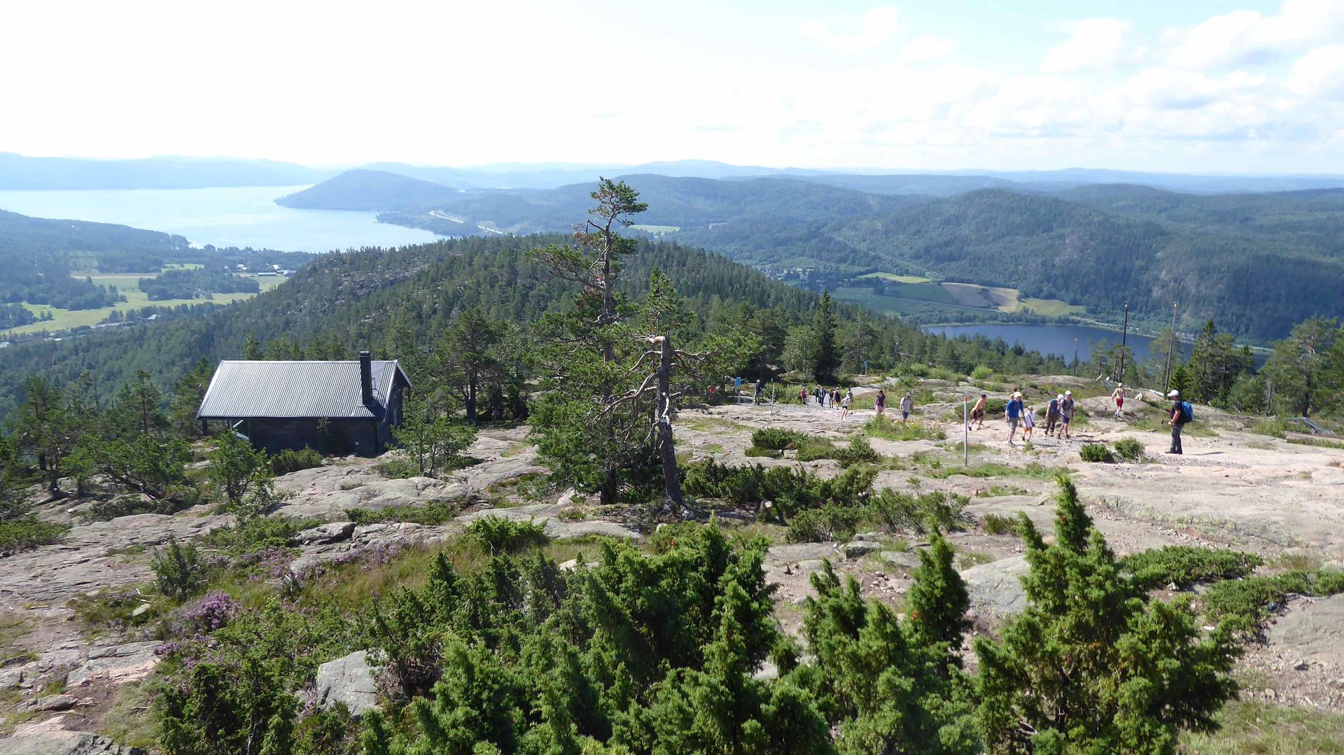Am Montag, 22. Juli erklimmen wir bei schönem und heissem Wetter den Skuleberget, 294 müM. Die Gegend war von Gletschern aus der Eiszeit ins Meer gedrückt worden. Als sie schmolzen spülte das Meer Pflanzen und Humus weg. Darum ist der Aufstieg sehr abwechslungsreich. Nach einem steilen Teil im Wald steigen wir über nackten Fels in Reibungstechnik. Die Sohlen halten gut. Es ist ein schweisstreibender Aufstieg und für Monica ein echter Erfolg, darum erhält sie oben einen Bergpreis. Wir umrunden auch die Gipfelregion und fahren dann mit einem seeehr langsamen Sessellift ins Tal. Peter hat schon einen Platz Lövvick am Meer erkundet, dort verbringen wir einen schönen Abend miteinander.
