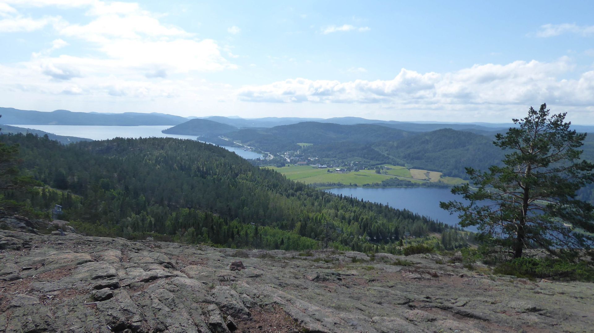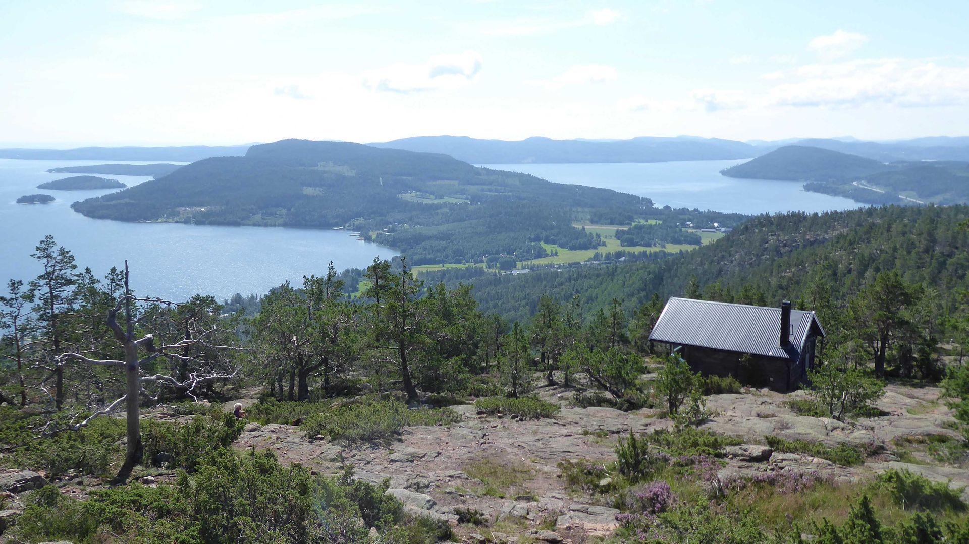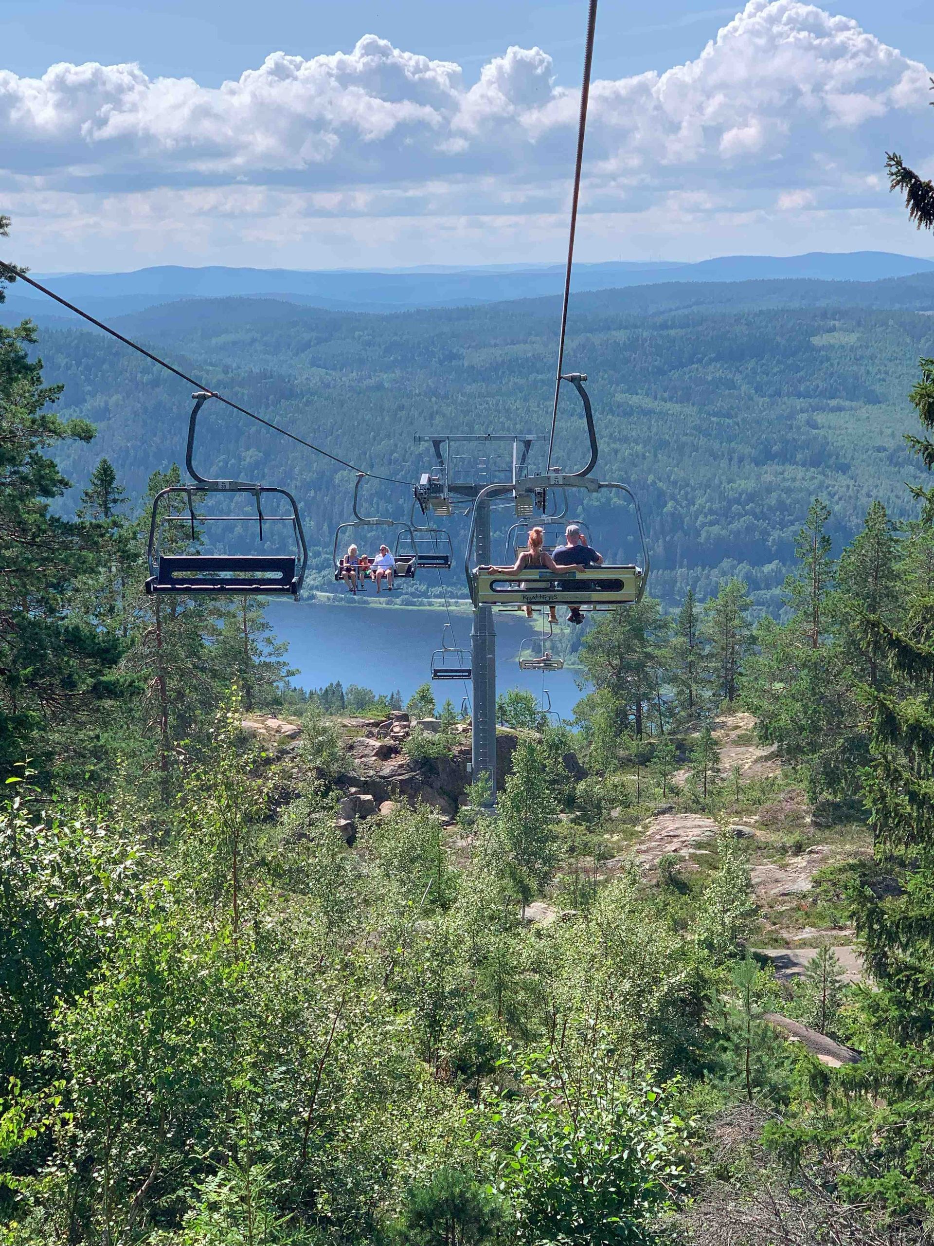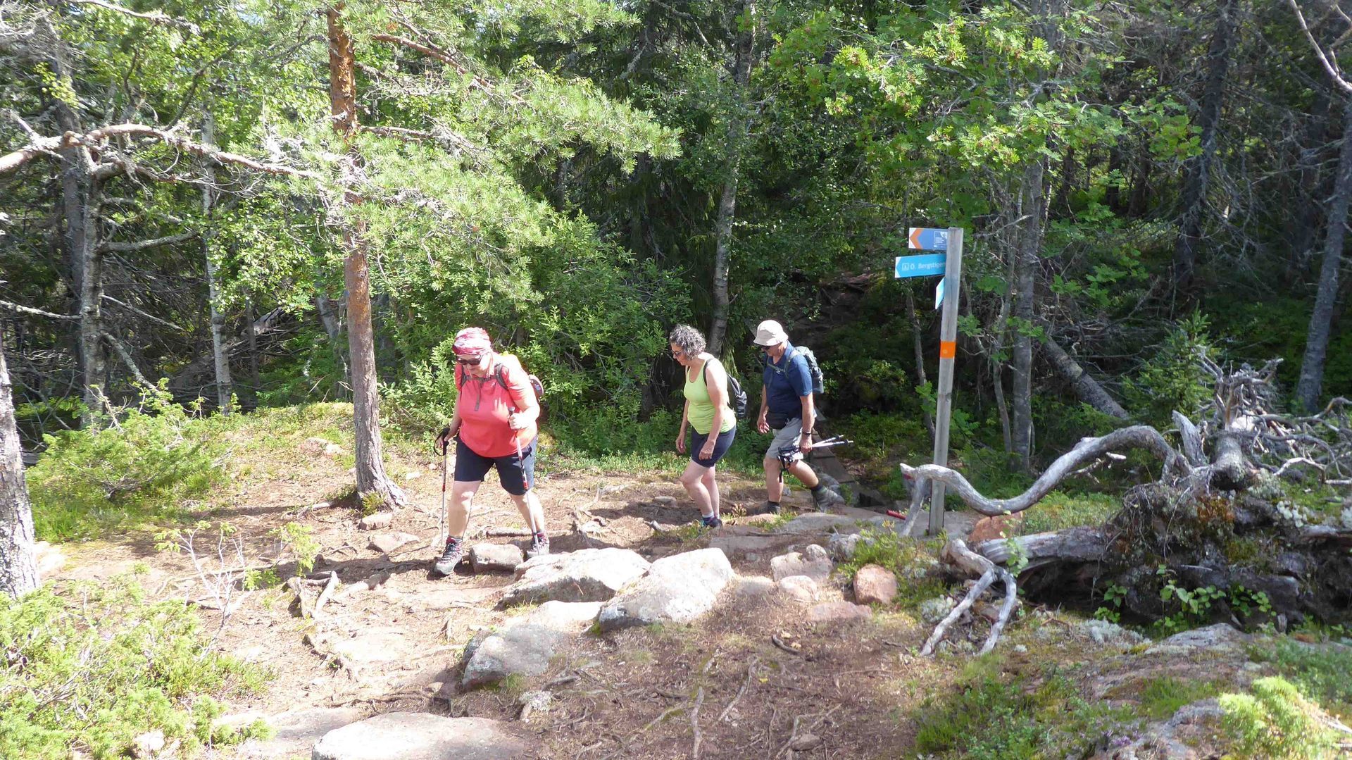 Am Montag, 22. Juli erklimmen wir bei schönem und heissem Wetter den Skuleberget, 294 müM. Die Gegend war von Gletschern aus der Eiszeit ins Meer gedrückt worden. Als sie schmolzen spülte das Meer Pflanzen und Humus weg. Darum ist der Aufstieg sehr abwechslungsreich. Nach einem steilen Teil im Wald steigen wir über nackten Fels in Reibungstechnik. Die Sohlen halten gut. Es ist ein schweisstreibender Aufstieg und für Monica ein echter Erfolg, darum erhält sie oben einen Bergpreis. Wir umrunden auch die Gipfelregion und fahren dann mit einem seeehr langsamen Sessellift ins Tal. Peter hat schon einen Platz Lövvick am Meer erkundet, dort verbringen wir einen schönen Abend miteinander.