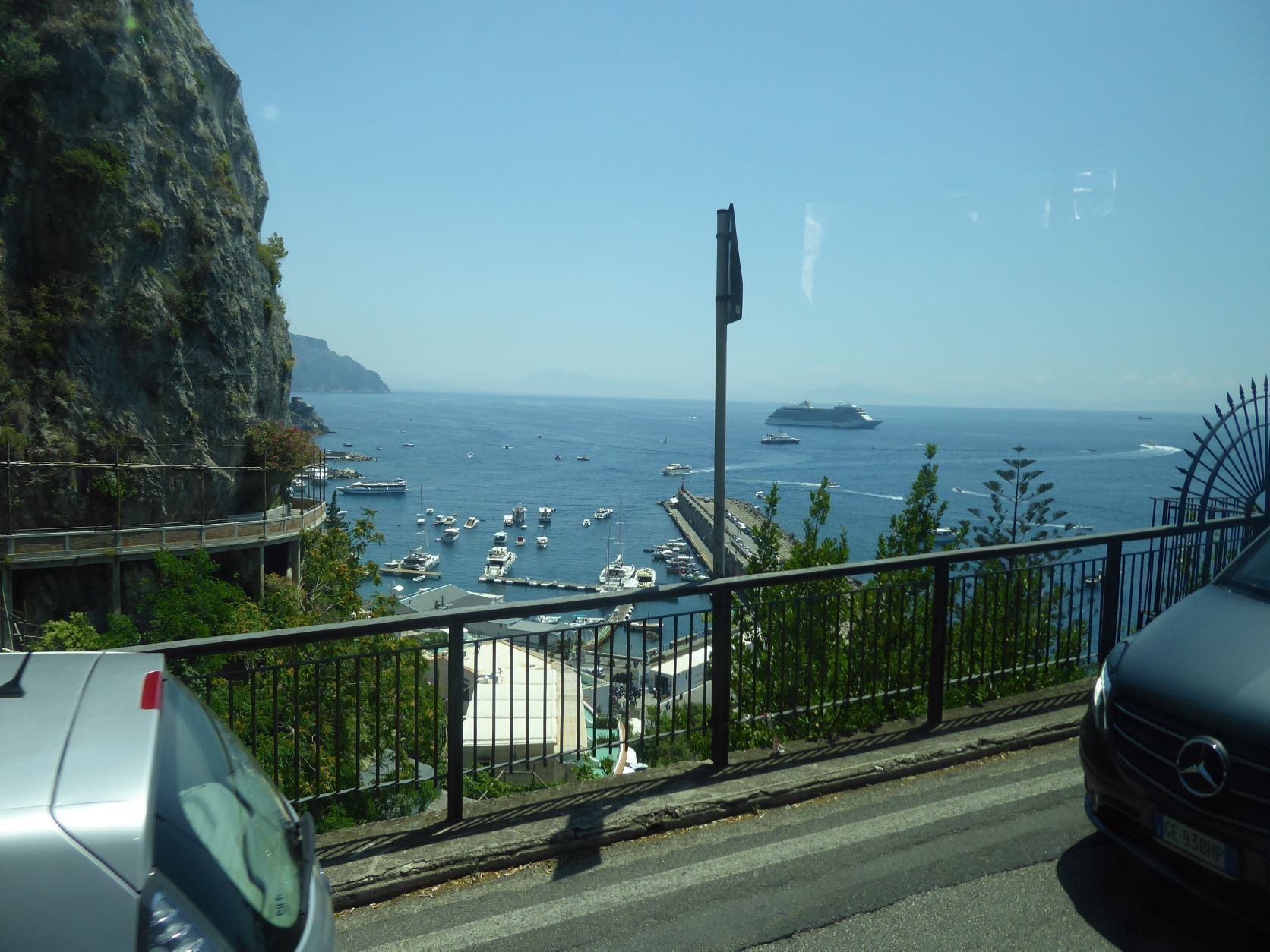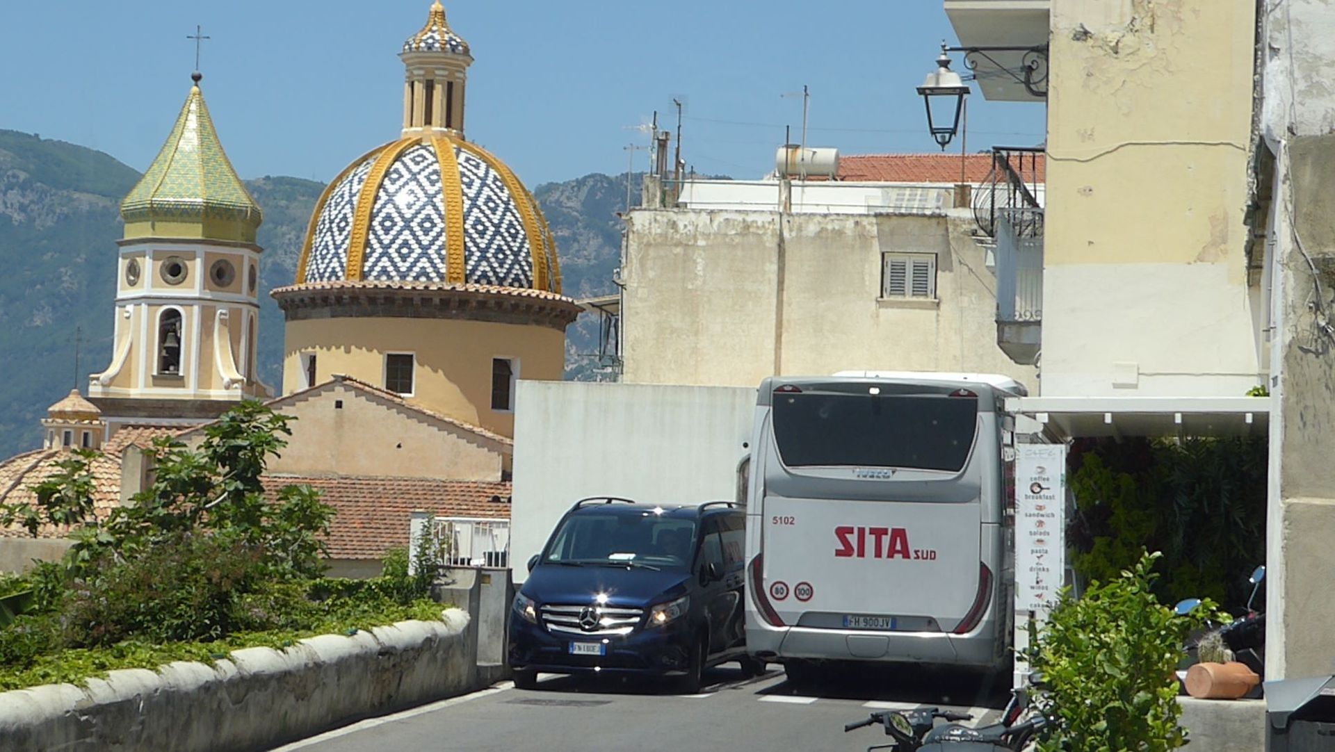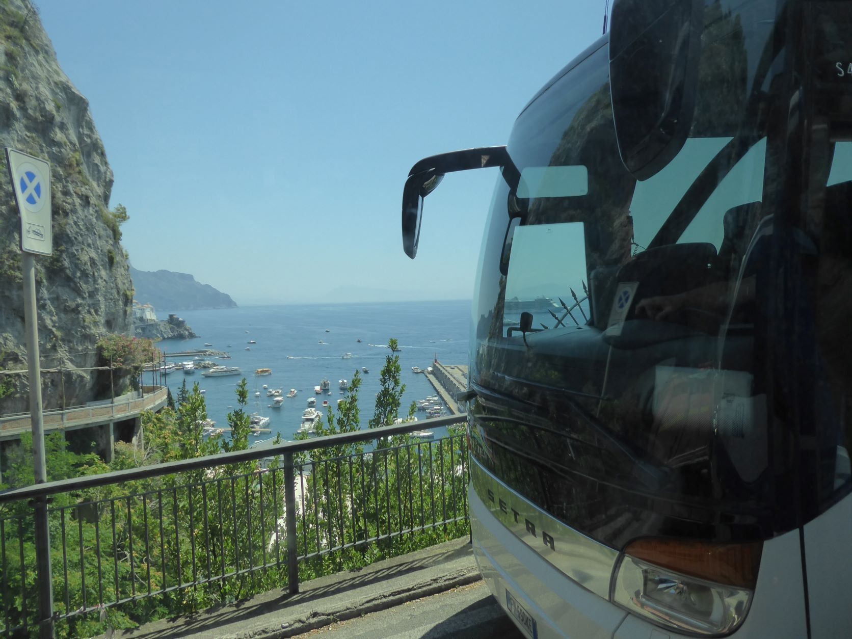 Auf Tipp meines Bruders wollen wir an die Amalfiküste. Und zwar, auch wie er vorgeschlagen hat mit den ÖV. Der Campingbesitzer bringt uns zur Endstation der Metro, einer sehr langsamen Bahn bis ins Zentrum von Salerno. Dort steigen wir in den Bus, aber diese Idee haben noch viele andere, wir müssen stehen und uns sehr festhalten. Die Strasse ist eng, kurvenreich und unübersichtlich und dazu hat es sooo viel Verkehr, Autos, Cars, Busse und Lastwagen. Beim Kreuzen geht es oft um Millimeter. Zum Glück werden vorne zwei Plätze frei, sodass wir die Manöver sehen und bewundern können, wie bei den Postautochauffeuren in unseren Bergtälern. Echt, es ist eine wahre Kunst.