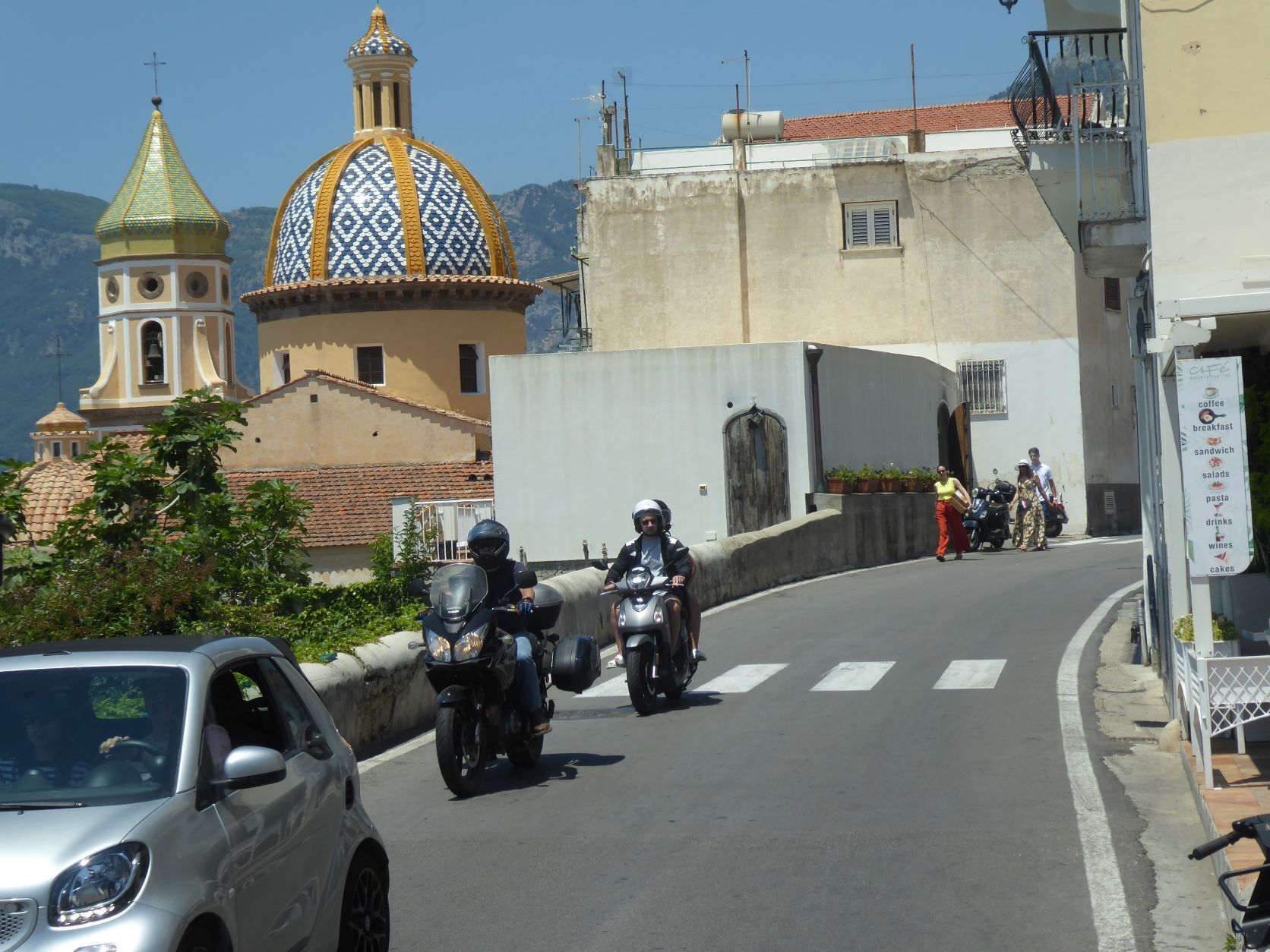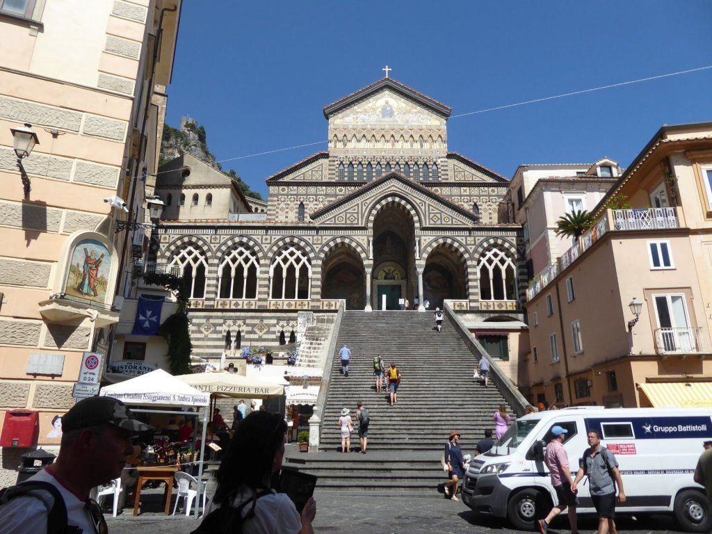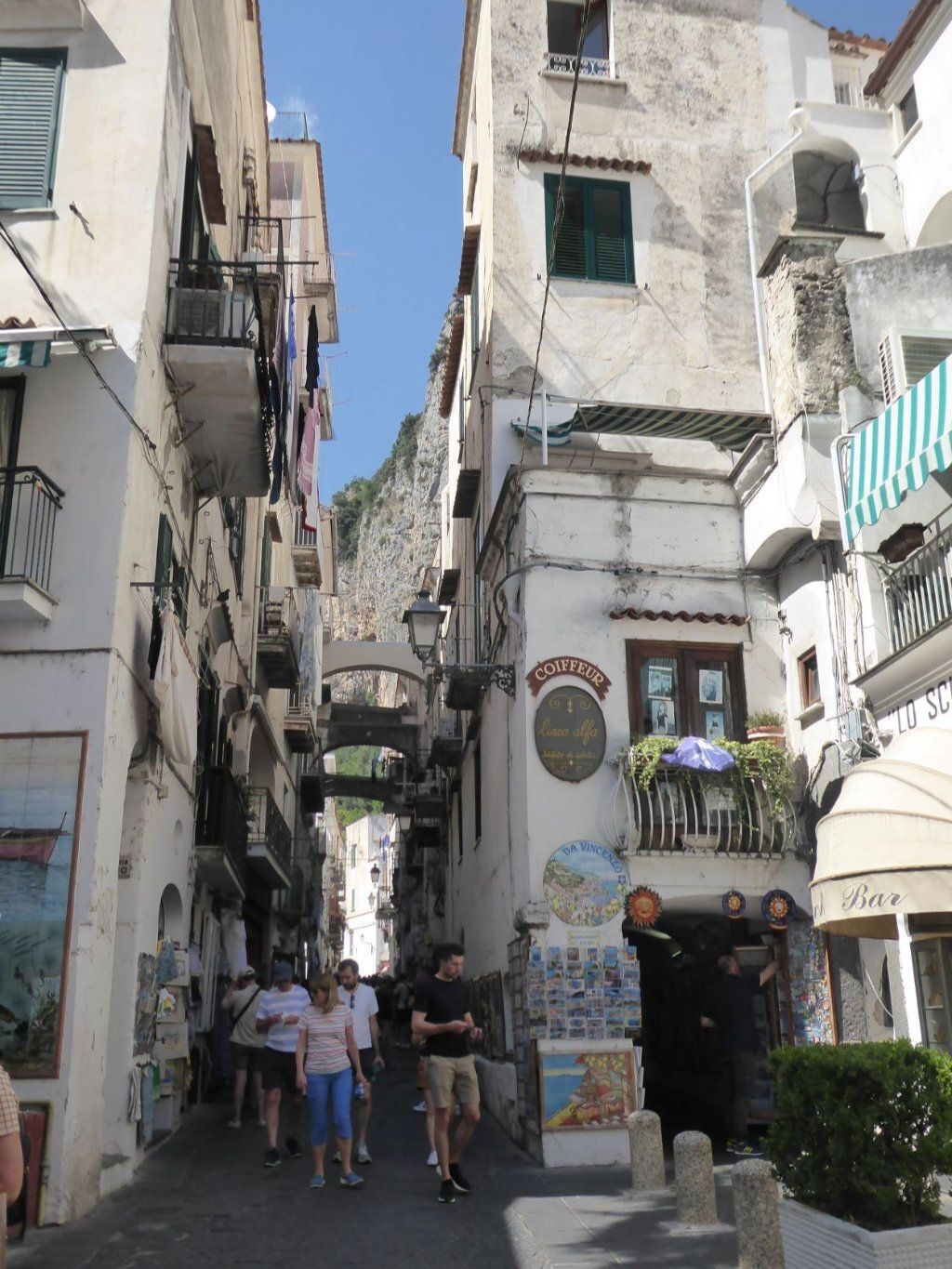 Auf Tipp meines Bruders wollen wir an die Amalfiküste. Und zwar, auch wie er vorgeschlagen hat mit den ÖV. Der Campingbesitzer bringt uns zur Endstation der Metro, einer sehr langsamen Bahn bis ins Zentrum von Salerno. Dort steigen wir in den Bus, aber diese Idee haben noch viele andere, wir müssen stehen und uns sehr festhalten. Die Strasse ist eng, kurvenreich und unübersichtlich und dazu hat es sooo viel Verkehr, Autos, Cars, Busse und Lastwagen. Beim Kreuzen geht es oft um Millimeter. Zum Glück werden vorne zwei Plätze frei, sodass wir die Manöver sehen und bewundern können, wie bei den Postautochauffeuren in unseren Bergtälern. Echt, es ist eine wahre Kunst.
