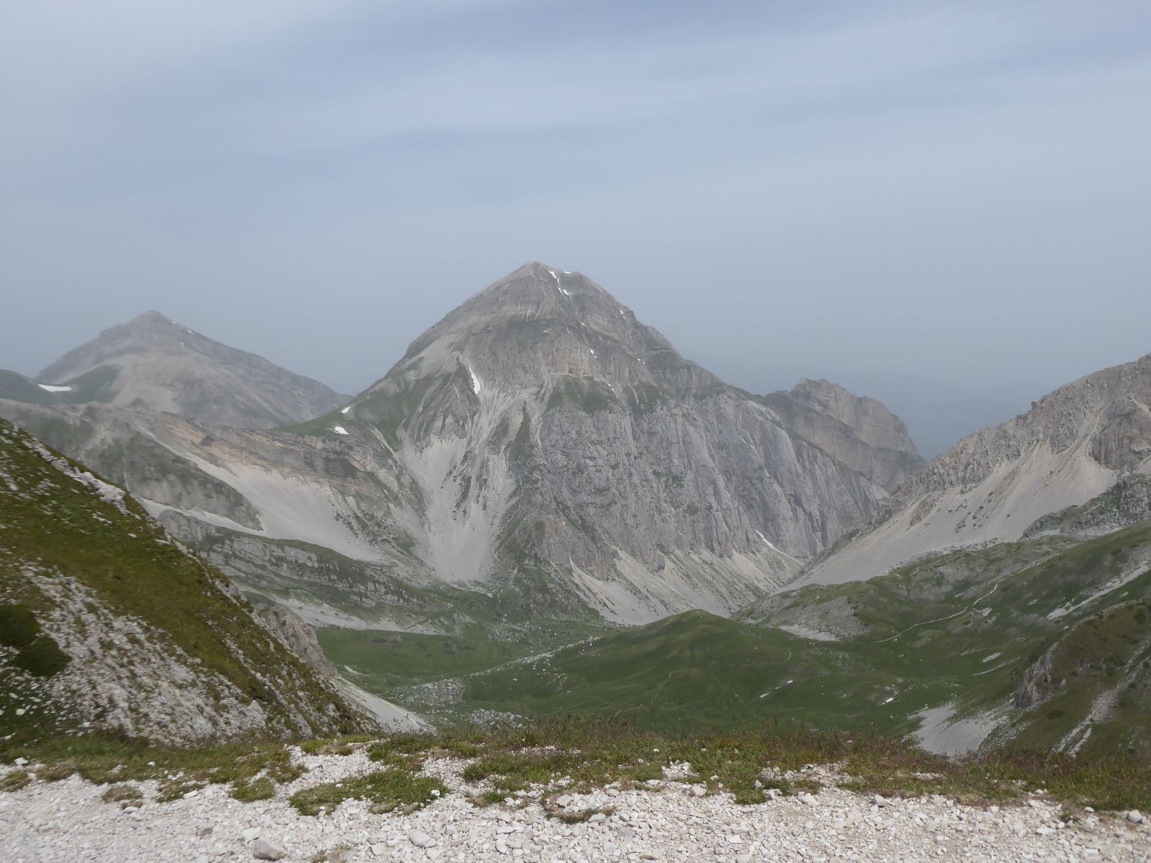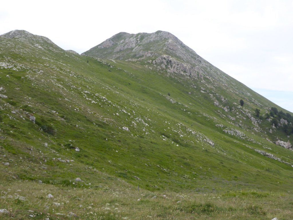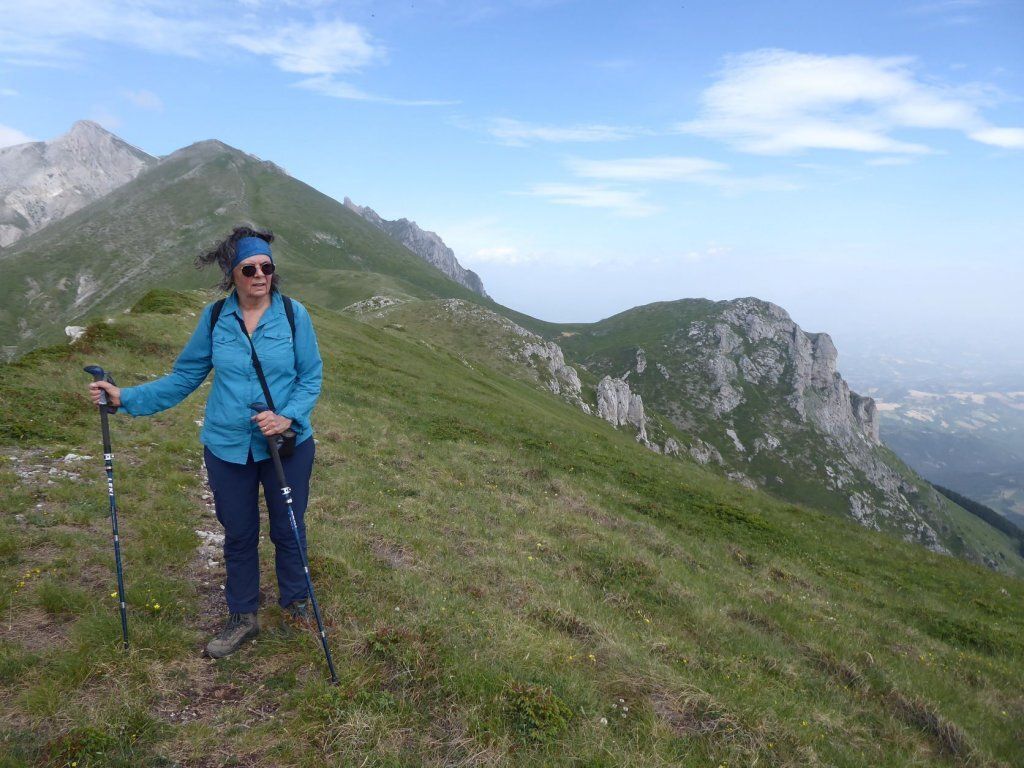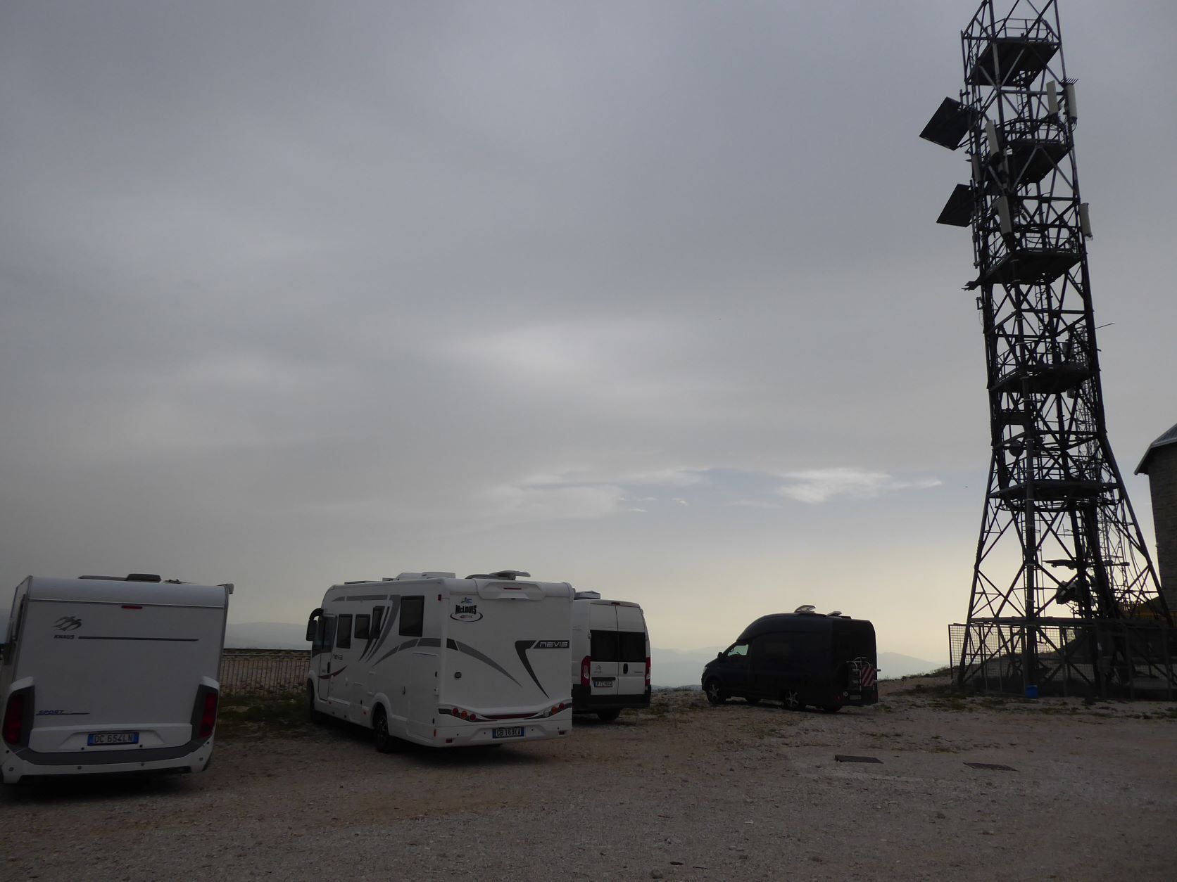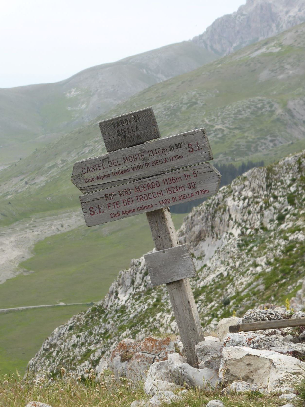 Die nächste Nacht stehen wir fast ganz allein beim Parkplatz Fonte Vetica. Freitag, 24. Juni ist Wandertag. Um 8 Uhr steigen wir los auf den Monte Siella, 2027m. Zuerst geht es steil aufwärts in einer Rinne. Wir kommen auf eine Hochebene mit Kühen in einer kleinen Senke. Der Wind bläst uns fast vom breiten Grat aber wir kämpfen uns unverdrossen weiter bis zum Gipfel. Das Abenteuer fängt erst im Abstieg an. Bei einer Felsstufe ist der Weg unsichtbar und der Wind sehr steif. Das will mir mein liebster Wanderleiter nicht zumuten und schlägt einen seitlichen Abstieg zwischen Gras, Wurzeln und Steinen vor, steil, aber von oben gesehen machbar. Wir begegnen einer Gämse. Hat sie Angst oder warnt sie? Wir steigen sorgfältig ab, immer den Wurzeln ausweichend, die sind glitschig wie Schmierseife. Dann traversieren wir auf dem sicher 40 Grad steilen Gelände. So weichen wir den Felsrippen aus. Es dauert lange – die Angst gar nicht hochkommen lassend und irgendwelches Drama schon in Gedanken vermeidend. Es gilt weiter zu gehen und nur das. Wir kommen zu einem weniger steilen Rücken und vermuten dort den Weg. Wir steigen schräg an und tatsächlich: laut Mapy.cz sind wir auf dem Weg. Langsam sehen wir auch die unsorgfältig gebauten Steinmänner und kommen zum Pass Vado di Siella. Nachdem ich mich versichert habe, dass ein richtiger Wanderweg weitergeht, gönnen wir uns eine Pause. Nach dem Abstieg geht es sicher noch eine heisse halbe Stunde über eine Wiese zum Wigwam hinauf. Wir sind ko, durstig und hungrig, aber ganz fröhlich, dass das Abenteuer gelungen ist. Wir kurven noch weiter bis zum Lago Campotosto, einem Stausee. Rundherum ist Stellplatz, die Wiesenplätze sind gemäht und es stehen schon viele italienische Camper da. In der Nacht sinkt die Temperatur auf 21 Grad, sehr angenehm für einen tiefen Schlaf.