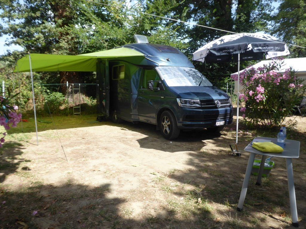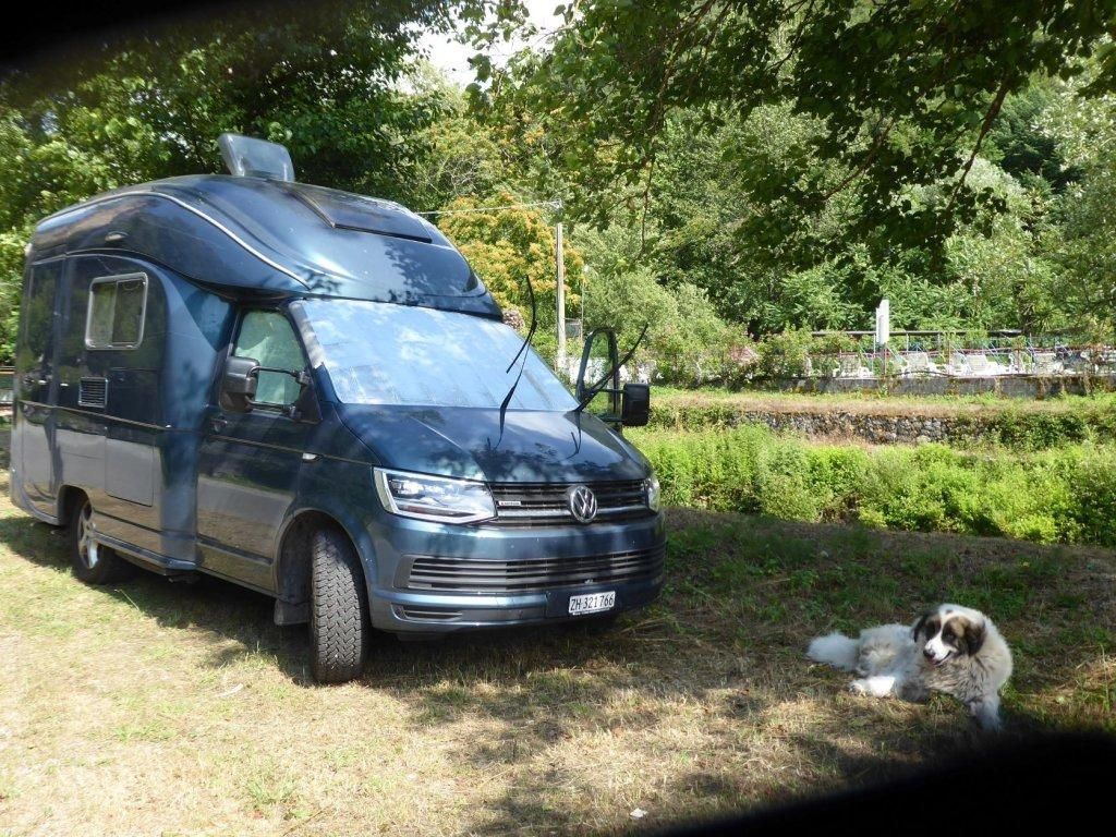 Dann fahren wir ins Brentagebiet, nach Pinzolo, etwa 800m, vor Madonna di Campiglio. Es ist ein herrlicher Platz mit Bachrauschen und schönem Alpenpanorama. Nach dem zweiten Regen auf unserer ganzen Reise wird es angenehm kühl. Wir sind sehr froh.
