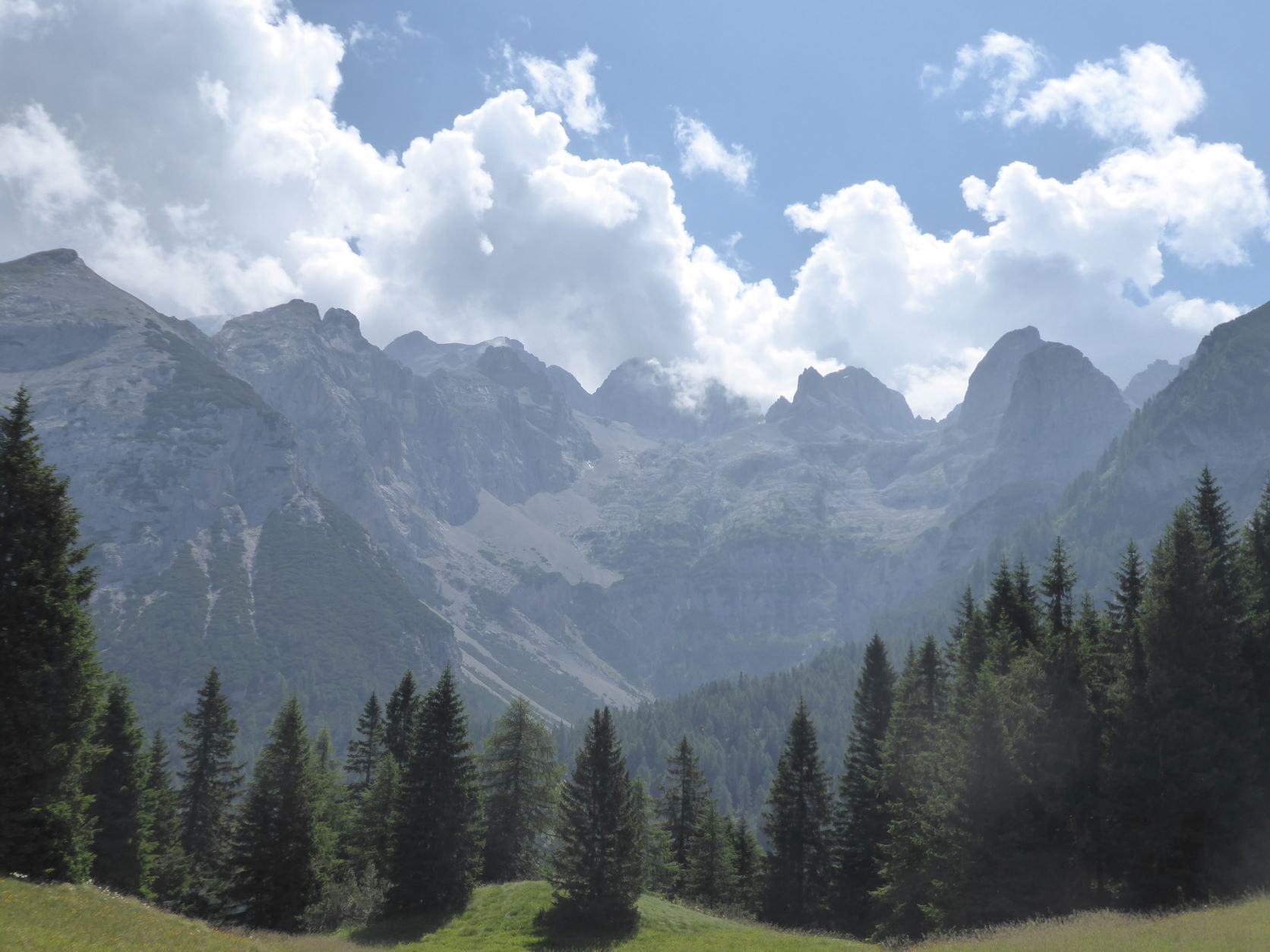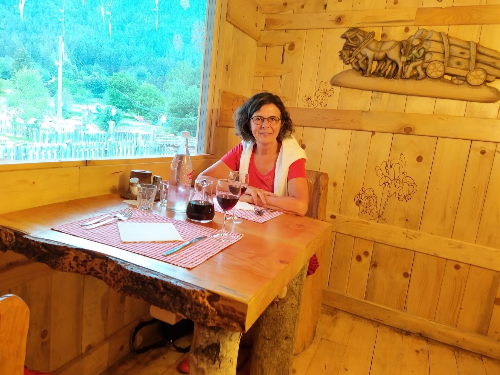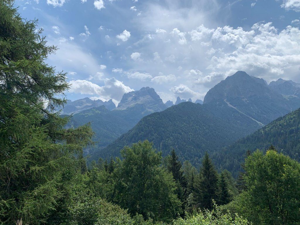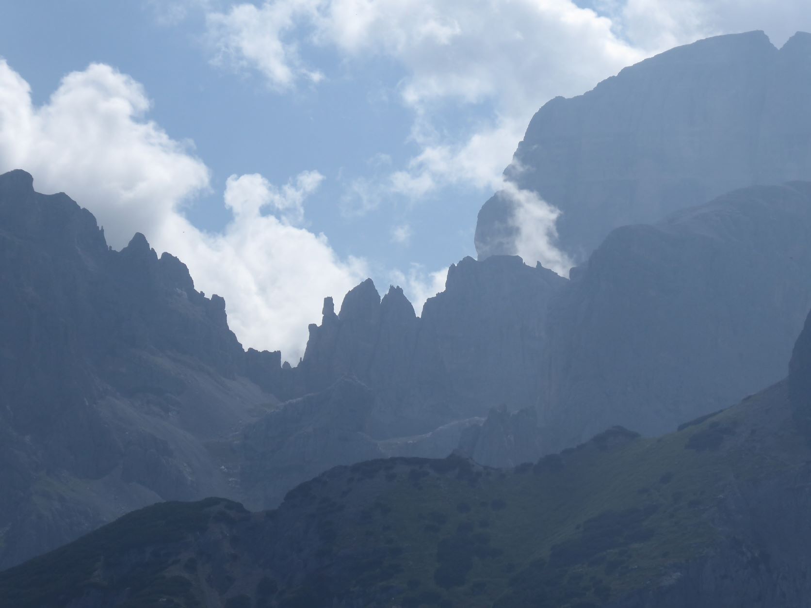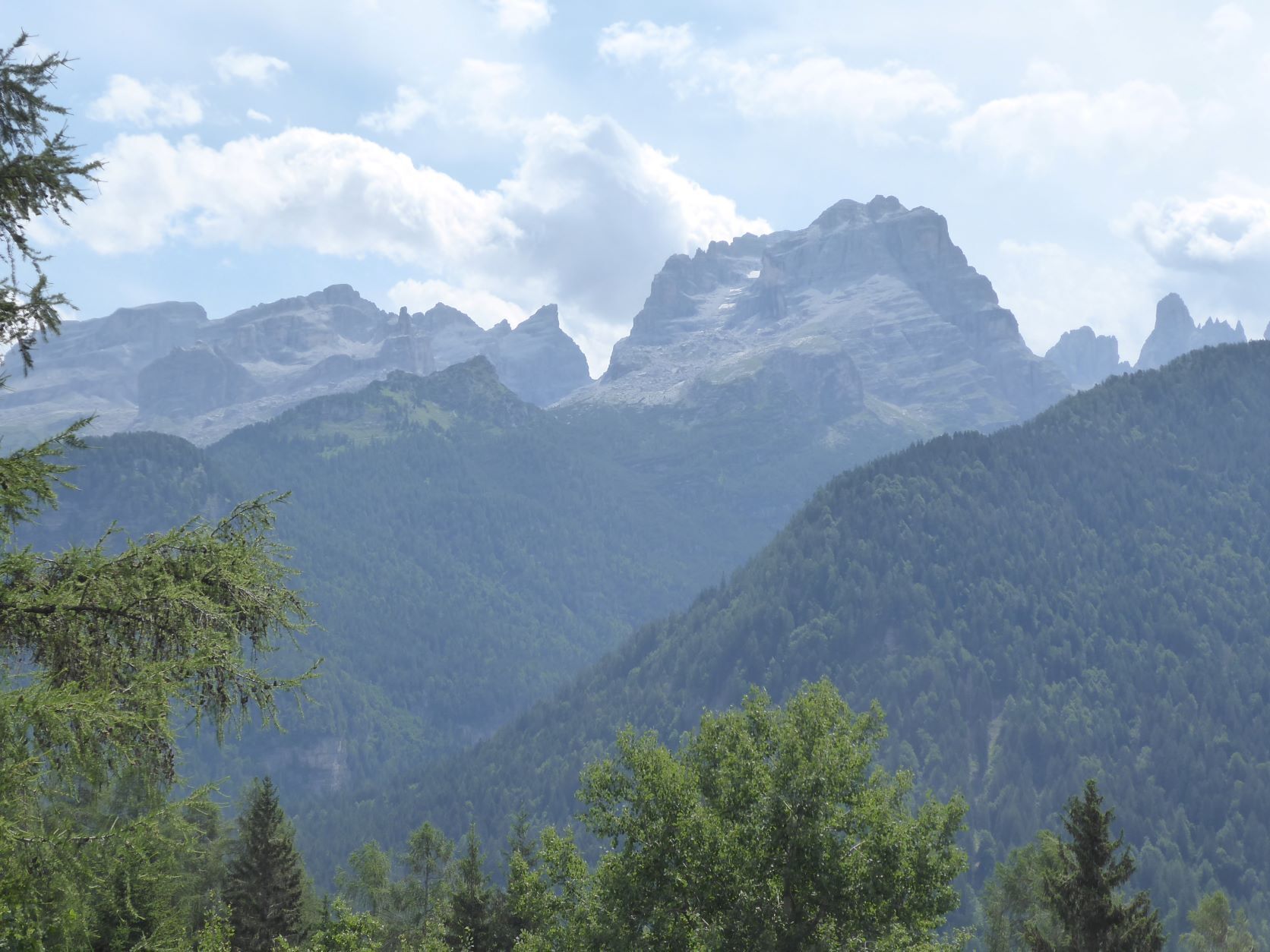 Das Wetter ist jetzt etwas unstabil, hin und wieder ein kleiner Regen und um die Berge türmen sich die Wolken. Am letzten Junitag nehmen wir das Bähnli auf den Dos de Sabion. Eigentlich meinte ich bis zur Mittelstation fahren, dann 500 Hm hochwandern und mit dem Sesselbähnli zurück. Aber Hans wollte doch die Brenta sehen und die Wolken ziehen schon zusammen, also steigen wir doch ab zu Mittelstation. Das Nachtessen geniessen wir im Restaurant Mangabo, im Separée. Es ist romantisch und fein