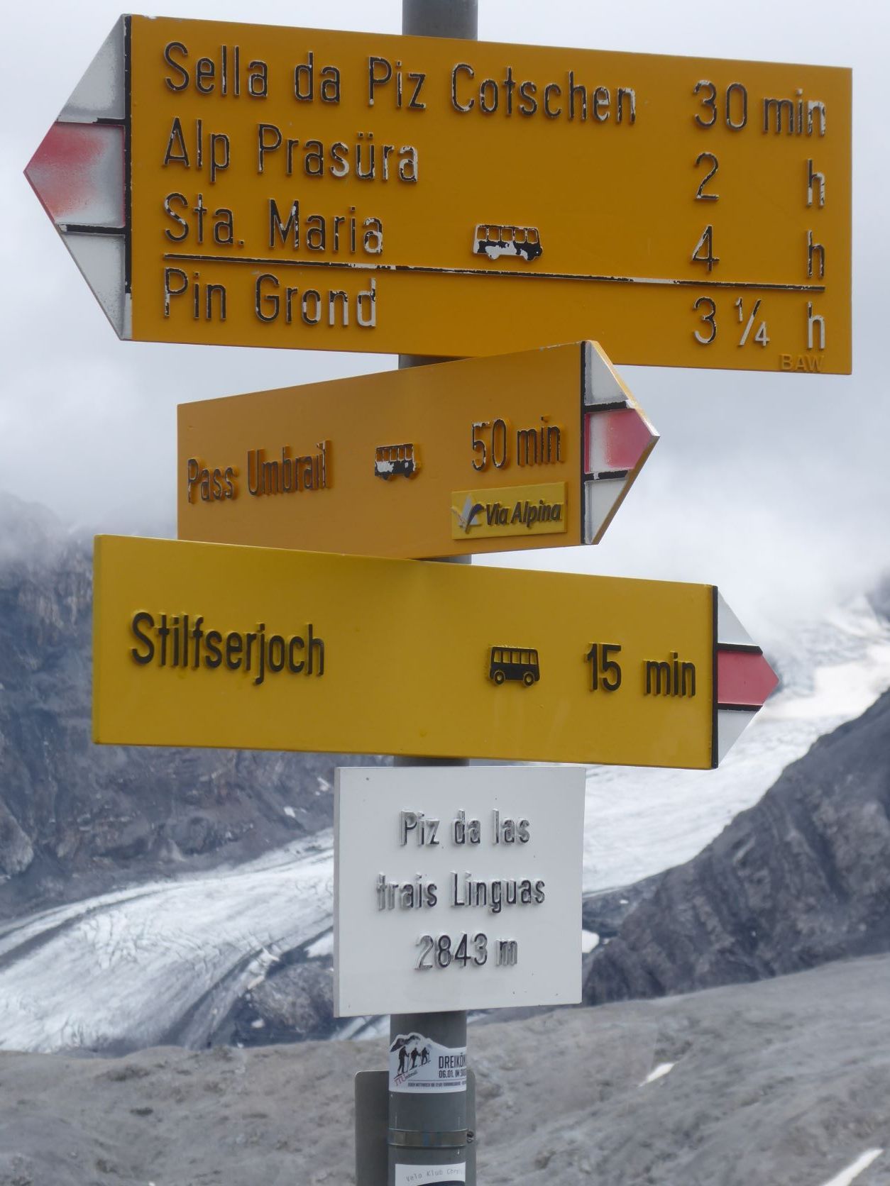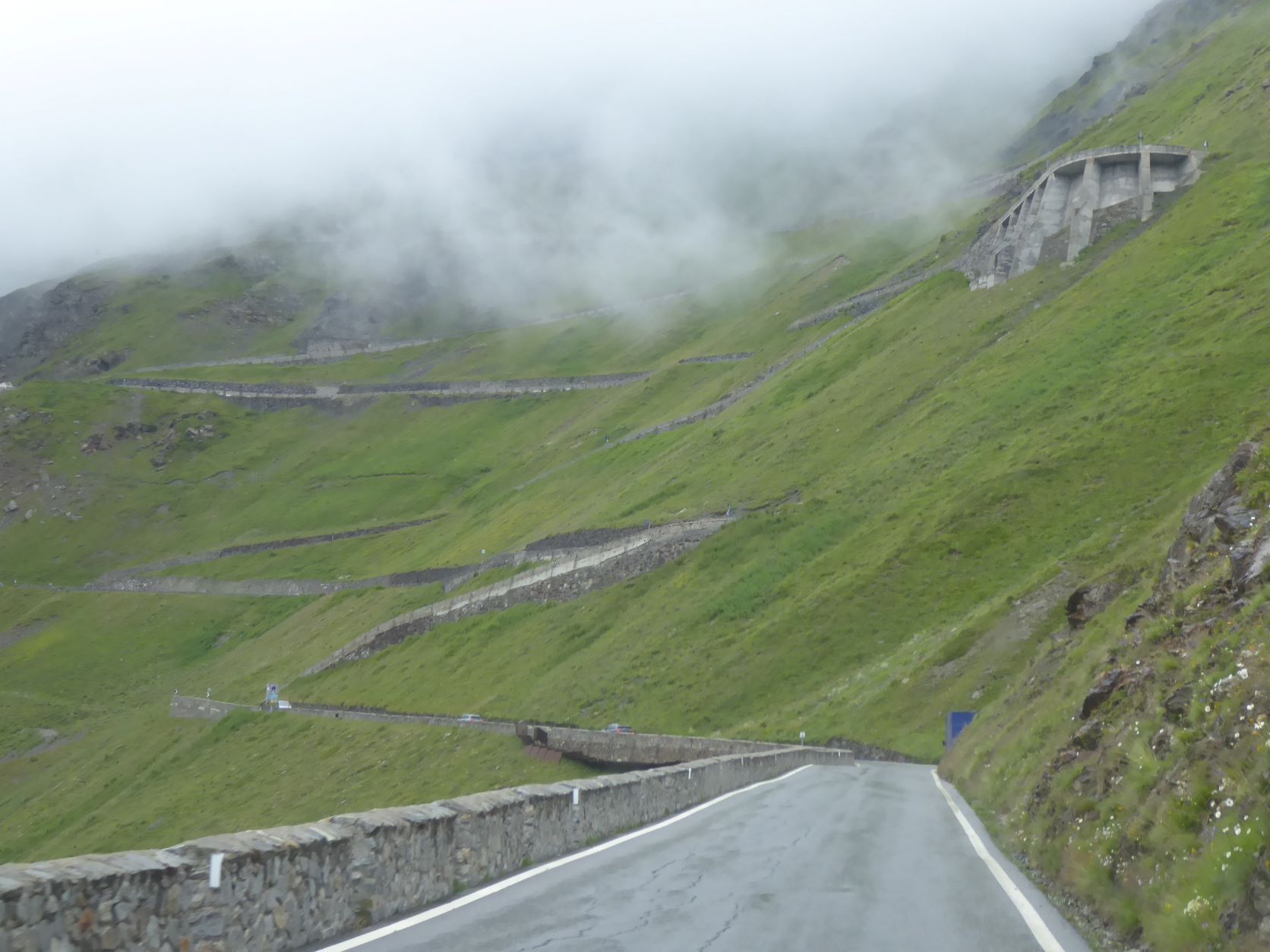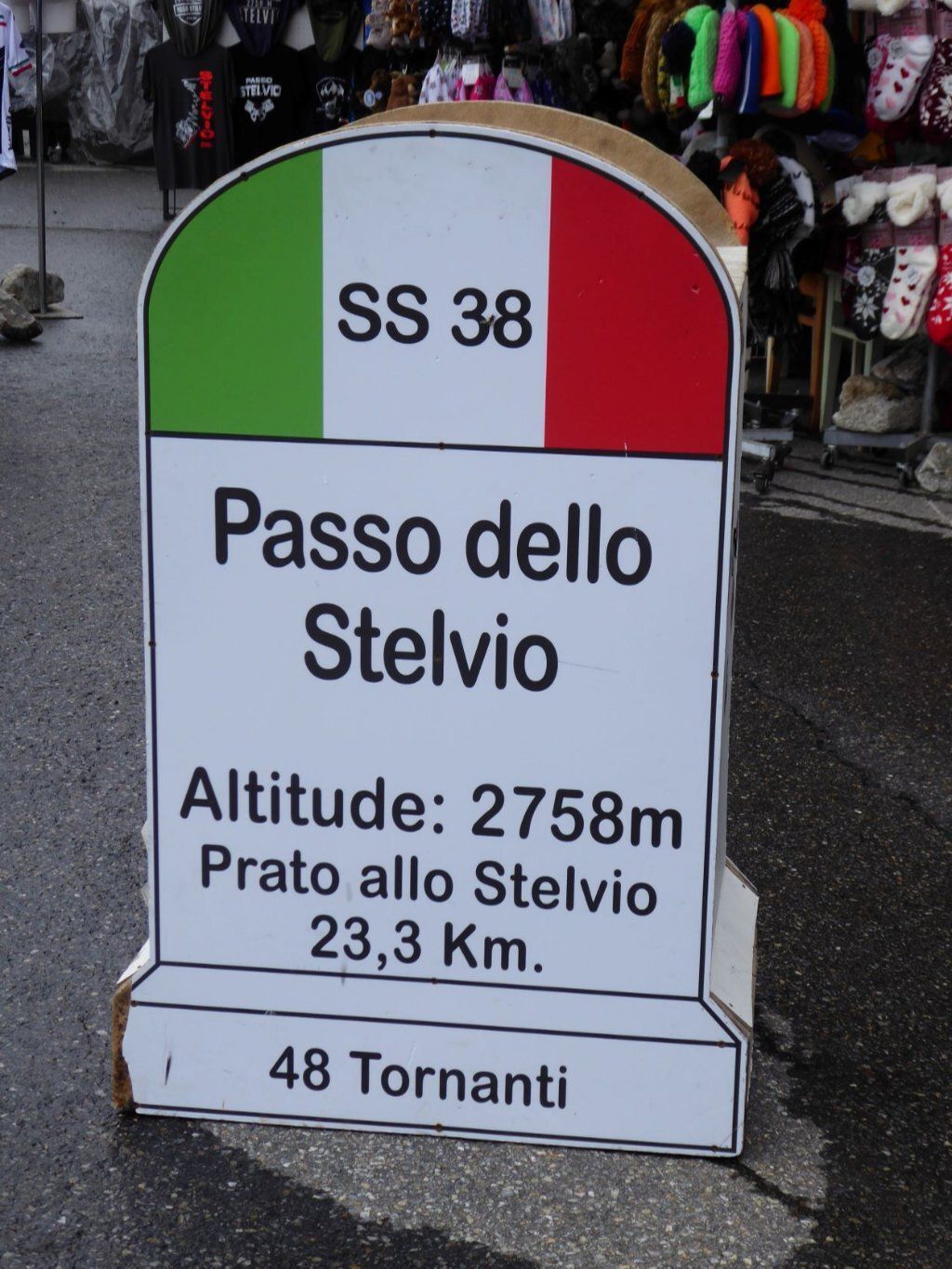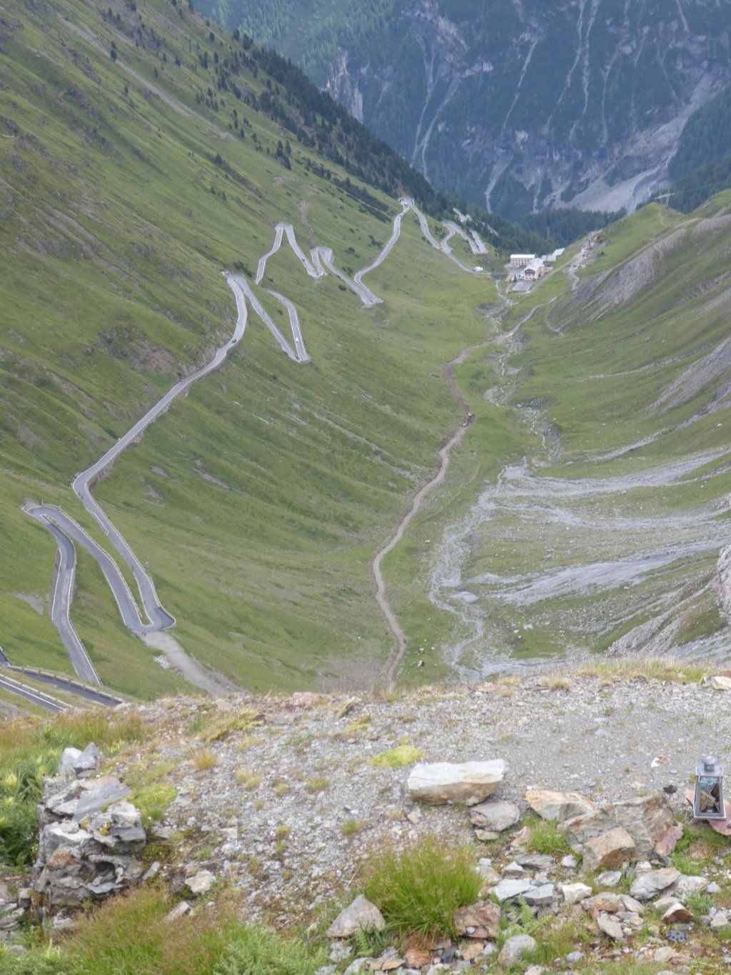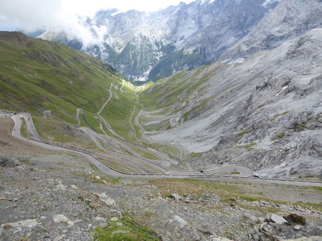 Übers Stilfserjoch führen eine Menge Haarnadelkurven. Von Prad aus sind es 48 enge und steile. Wir überholen 109 Velofahrer, die meistens ohne Motor da hochstrampeln. Auf dem Pass ist es kalt und der Bär ist los. Die Velofahrer feiern und dokumentieren ihren Erfolg. Wir steigen zur Grenze empor und lesen über die Stellungen im 1. Weltkrieg. Nach Bormio hinunter drehen wir 37 Kurven durch eine enge Schlucht.