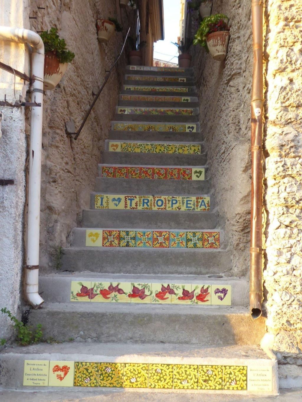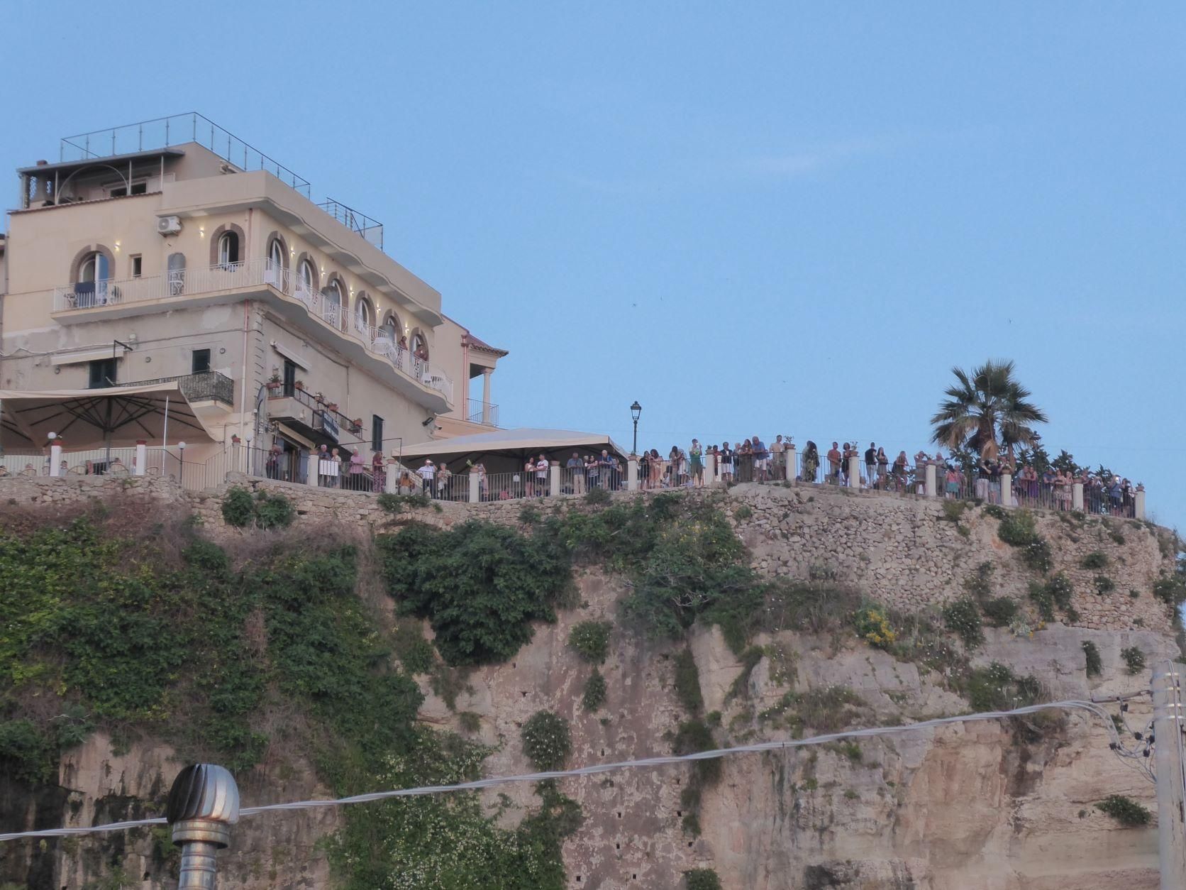 Unser nächstes Ziel heisst Tropea. Schon die Anfahrt ist ein Abenteuer und zum Glück bleiben wir nicht in einer Gasse stecken. Bei Da Ciccio erhalten wir einen Platz unter den Bäumen. Es wird jeden Tag heisser und ohne Schatten geht es nicht mehr. Tropea ist ein Touristenort wie Zermatt oder Saas Fee, steil an einen Felsen gebaut mit vielen Läden, Autos und noch mehr Leuten. Bekannt ist vor allem der Felsen mit dem Santuario Santa Maria dell`Isola. Es war ein Kloster und gilt immer noch als geheiligter Ort mit strengen Kleidervorschriften, keine Shorts, ärmellose T-Shirts, usw., wie es auf Tafeln heisst. Aber eben, was bedeuten sie schon? Die Aussicht ist traumhaft. Auf dem Campingplatz kommt morgens zuerst der Bäcker, dann der Fischer und dann der Früchte- und Gemüsehändler, also Rundumversorgung. Wir steigen die steile Treppe hinauf, streifen durch die Gassen und essen abends fein in einem Innenhof. Trotz Schatten sind die Nächte heiss und nicht erholsam.