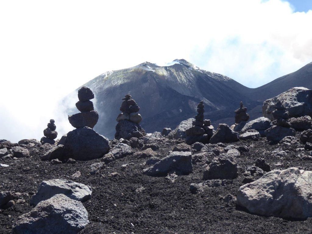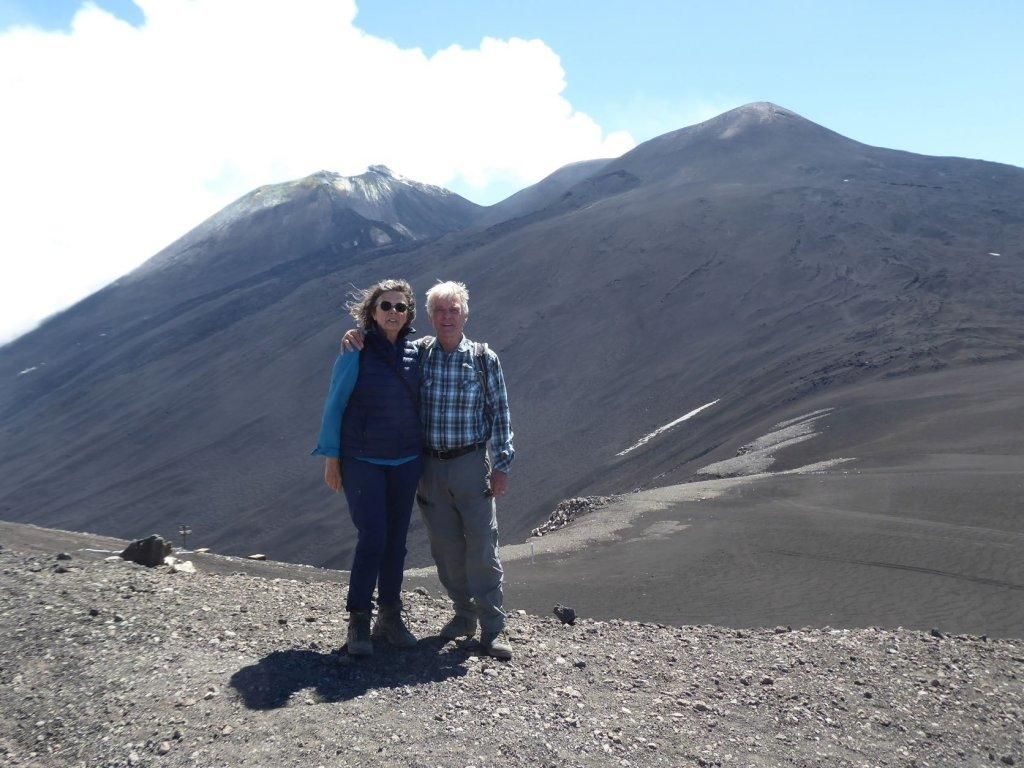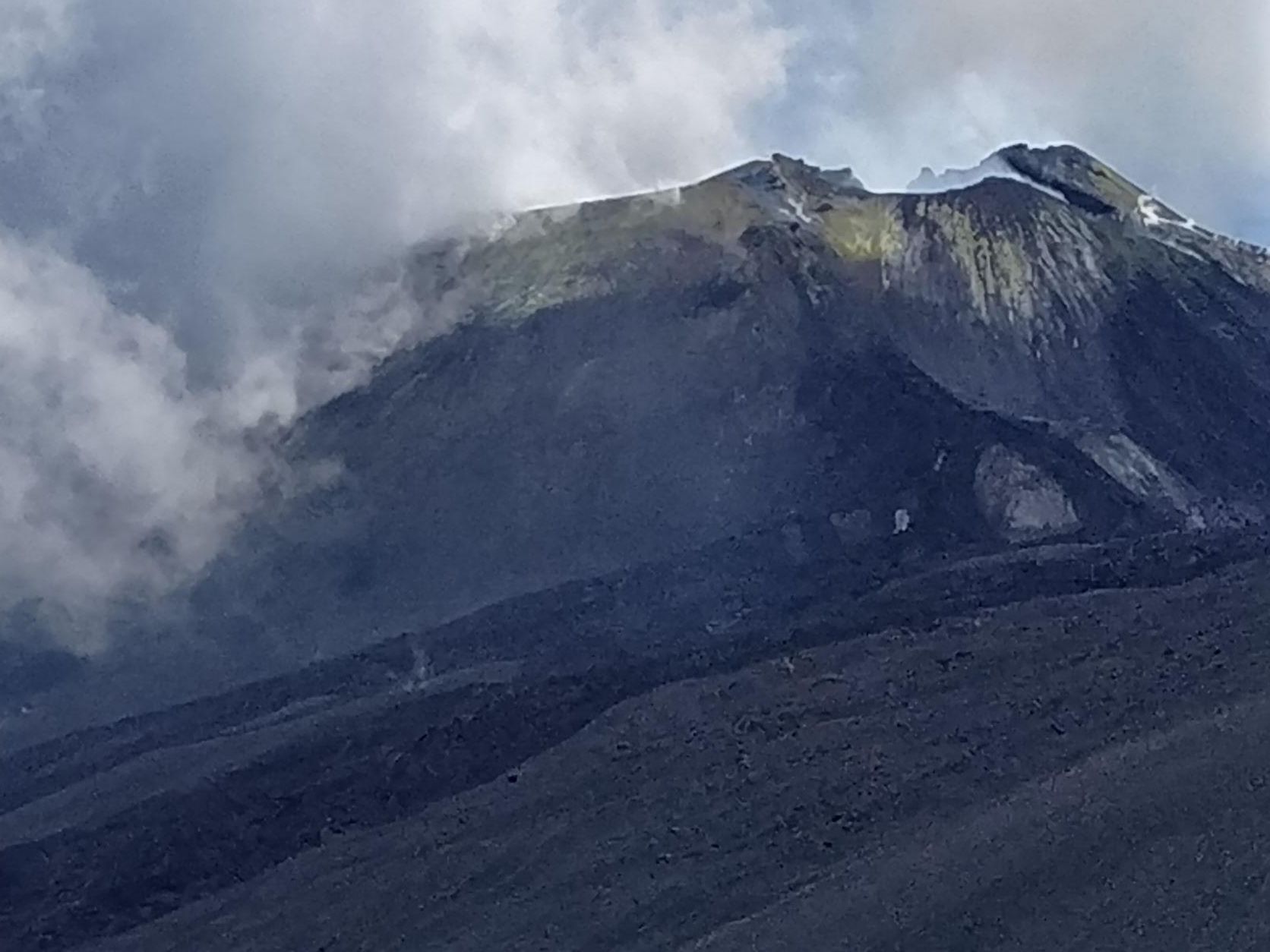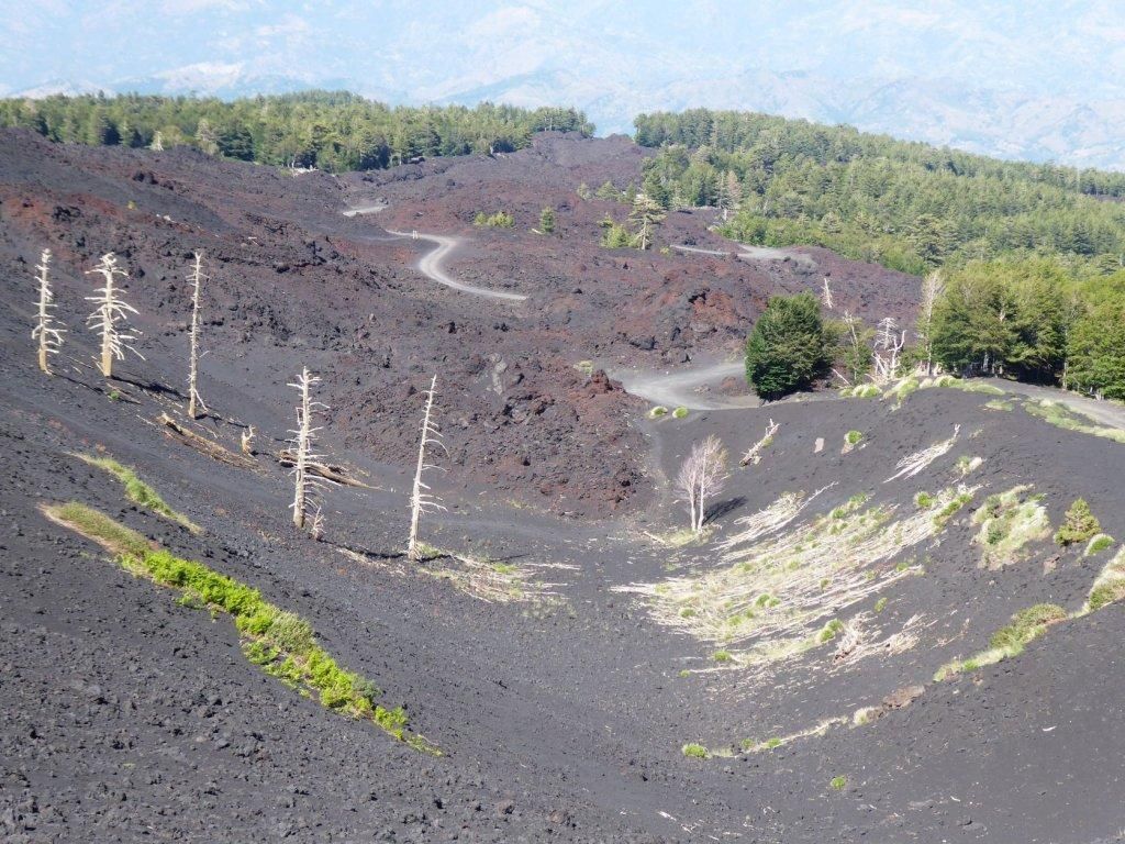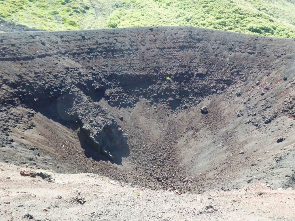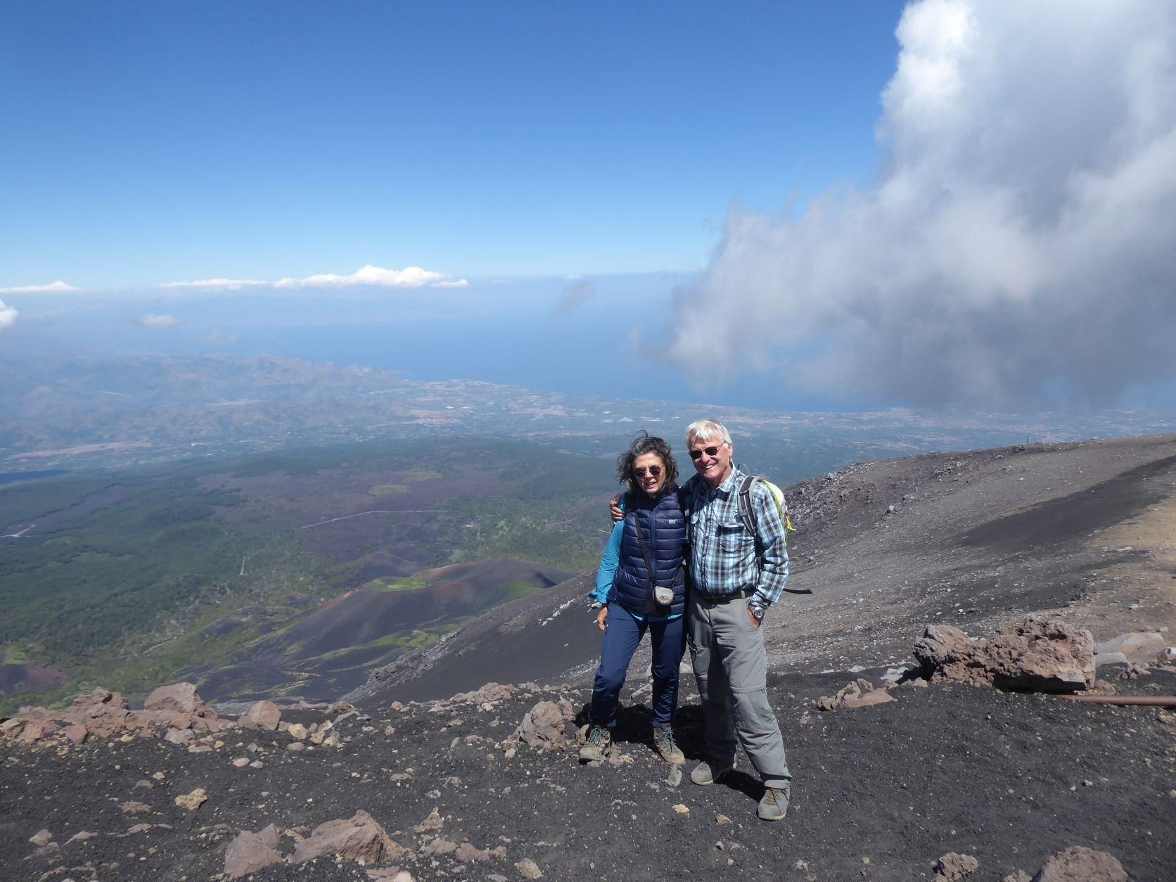 Am Montag, 13. Juni fahren wir wieder zum Aetna und zwar auf die Nordseite. Wir werden zuerst enttäuscht, keine Aussicht, schräger Platz, kaum offene Läden und Bars oder ein Informationsbüro. Während wir die Parkgebühren zahlen, kommt Giuseppe daher und preist uns die letzten beiden Plätze auf einer Tour zum Observatorium an. Die nehmen wir kurz entschlossen für 68 Euro. Mit einem Mercedes Sprinter werden wir sehr holprig auf den Vulkan gefahren bis zum Pizzo Deneri auf 2850m. Hier oben sind wir nahe am Geschehen. Die fliessende Lava, die wir nachts gesehen haben, ist erkaltet. Wir lernen viel über Vulkanismus. Bei einem Ausbruch gibt es zuerst einen Riss in die Erde, dann folgen die Explosionen. Die Lava verhärtet sich wieder, dann gibt es neue Explosionen. Lava fliesst auch unten beim Riss ab. Im Krater sind diese Stufen zu sehen. Noch frische Lava ist ganz weich und knirscht unter den Füssen und eisenhaltige ist rot. Nach etwa 4 Stunden sind wir zurück beim Wigwam. Und weil der Platz ja nicht sehr einladend ist, kurven wir bis zu einem sehr kleinen Camping in der Alcantaraschlucht. Es ist ein ruhiger Platz mit einer Freiluftdusche und einer, die nicht abschliessbar ist. Dafür haben wir eine Wiese für uns allein.