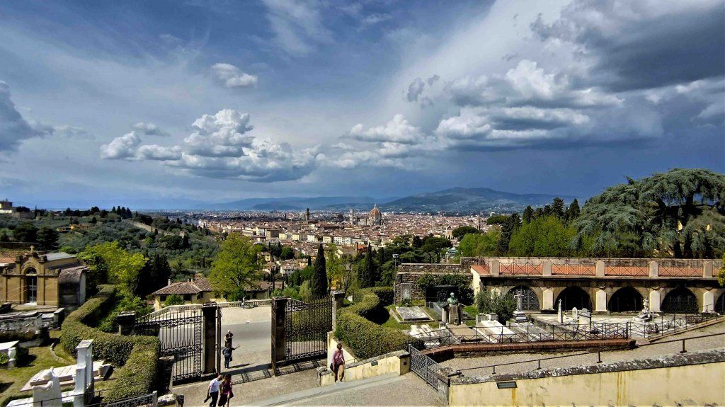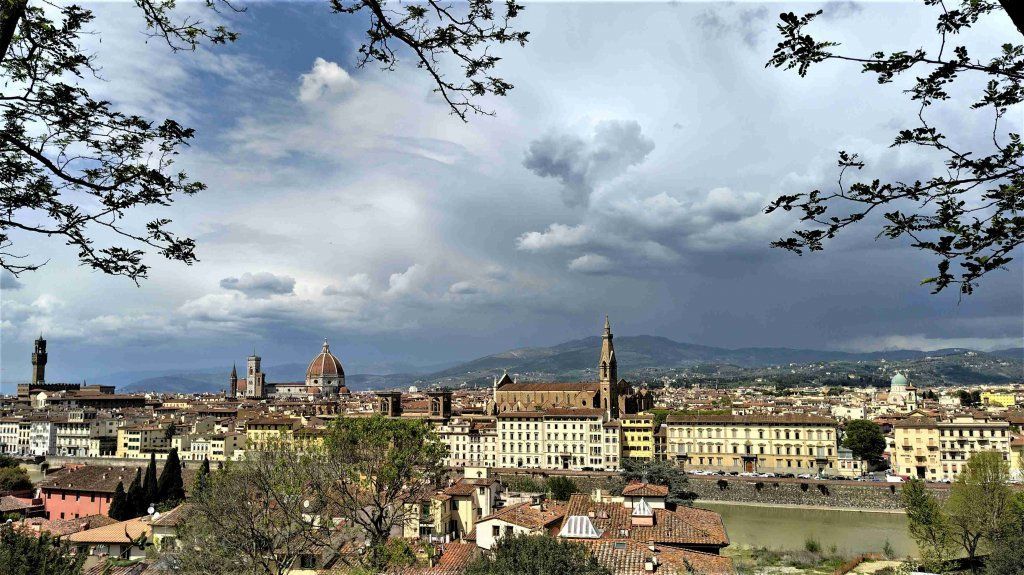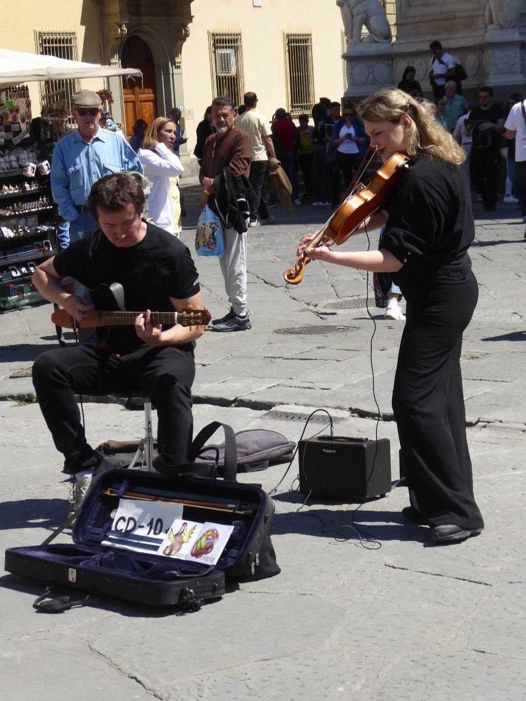 Wir entscheiden uns für Kunst von aussen. Hans hat drei Touren durch die Stadt gefunden, die an den berühmten Bauwerken vorbeiführen und wir zahlen keine Eintritte für Kirchen! Anstatt auf die Kuppel steigen wir zur Kirche San Miniato hinauf und sehen über die Stadt. Wir bestaunen Häuser und Gassen, kommen wieder in den Touristenstrom, schieben uns eine Zeit mit, zum Beispiel über den Ponte Vecchio, schlendern dem Arno entlang. Es hat viele Musiker und Musikerinnen in der Stadt. Wir hören ihnen zu und freuen uns.