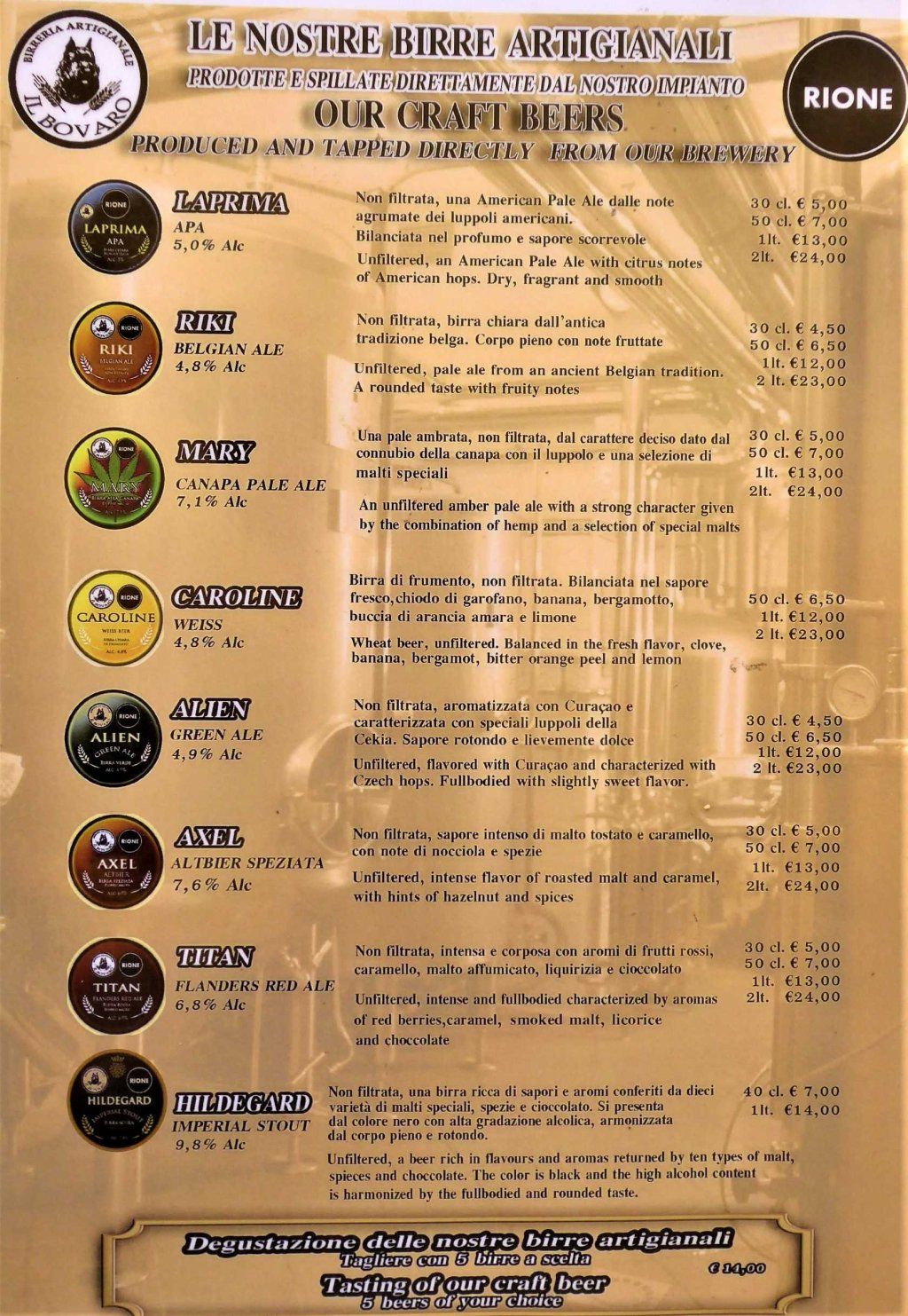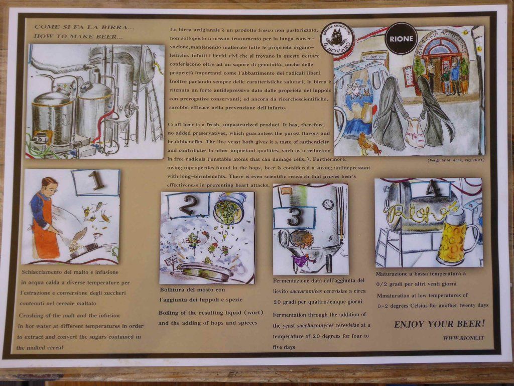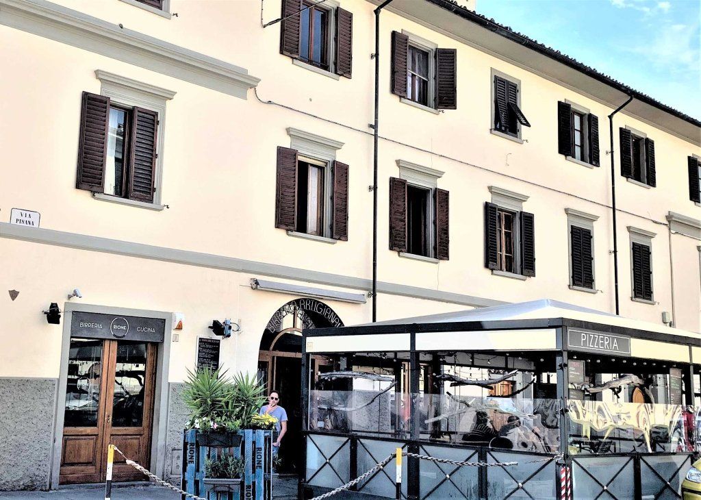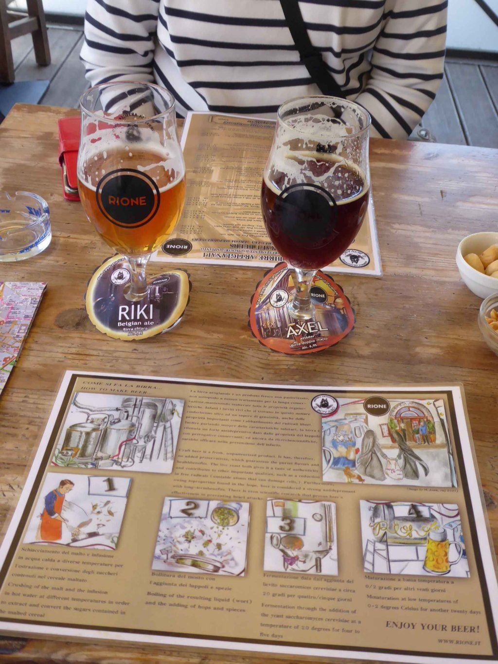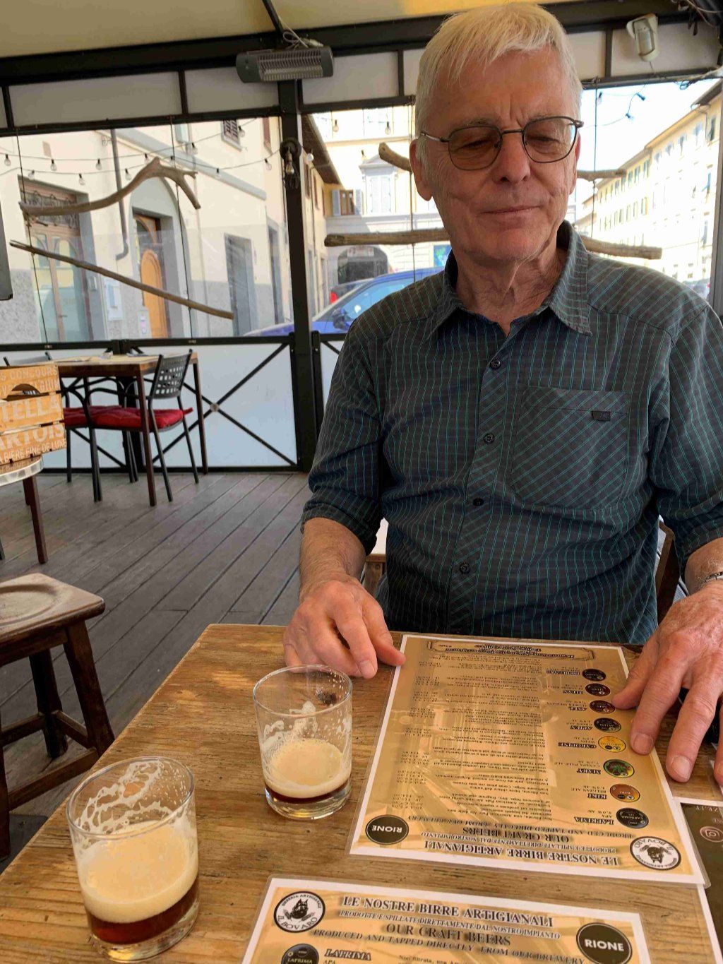 Am Samstag besuchen wir zuerst den Mercato Centrale. Schon rundherum sind ganze Strassenzüge mit Ständen von Lederwaren. Ein kleines Zögern ein etwas längerer Blick und schon sind die asiatischen Verkäufer zur Stelle und wollen uns ins Verkaufsgespräch verwickeln. Auf dem Markt sehen wir viele Leckerbissen, leider hatten wir schon Zmorge. Wir schlendern durch noch unbekannte Gassen und dem Arno entlang bis zu Stadtmauer und Stadttor San Frediano. Die höheren eisernen Ringe waren für die Fackeln, die die Stadt erhellt haben. Dort entdecken wir doch tatsächlich eine Bierbrauerei, die einzige in Florenz. Wir lassen uns beraten und trinken je ein feines Bier.
