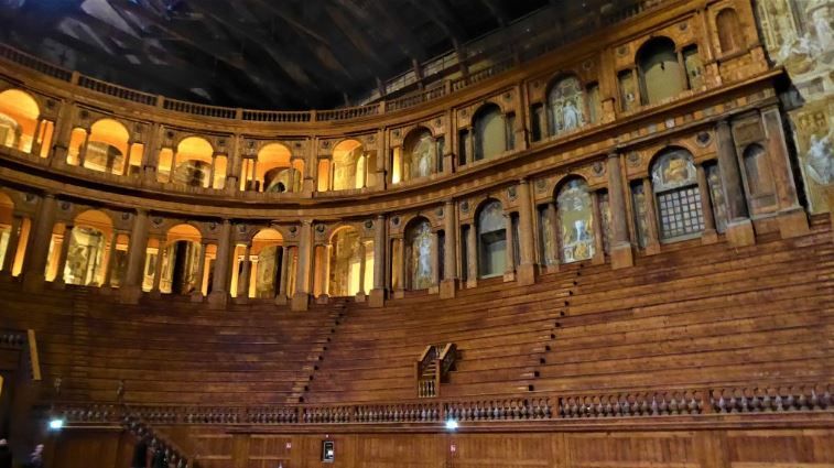 Als wir herauskommen, weht uns eisiger Wind entgegen und die Wolken sind drohend schwarz. Also nix wie hinein ins nächste Museum, Pilotta. Wir bewundern das Theater Fornese ganz aus Holz gebaut, das genau 19 Mal gebraucht wurde und dann stillgelegt als Museum wegen hoher Feuergefahr. Aus dem Museum kommt man nur, wenn man auch noch die Nationalgalerie abmarschiert ist. Ein solche Fülle an Bildern über- und untereinander aufgehängt ist einfach eine Überforderung und wir haben auch nicht so einen Kunstblick. Aber die Spuren der Geschosse vom 2. Weltkrieg beachten wir schon. Den „Kunsttag“ beschliessen wir mit echt toskanischem Essen in der Osteria dell Teatro.