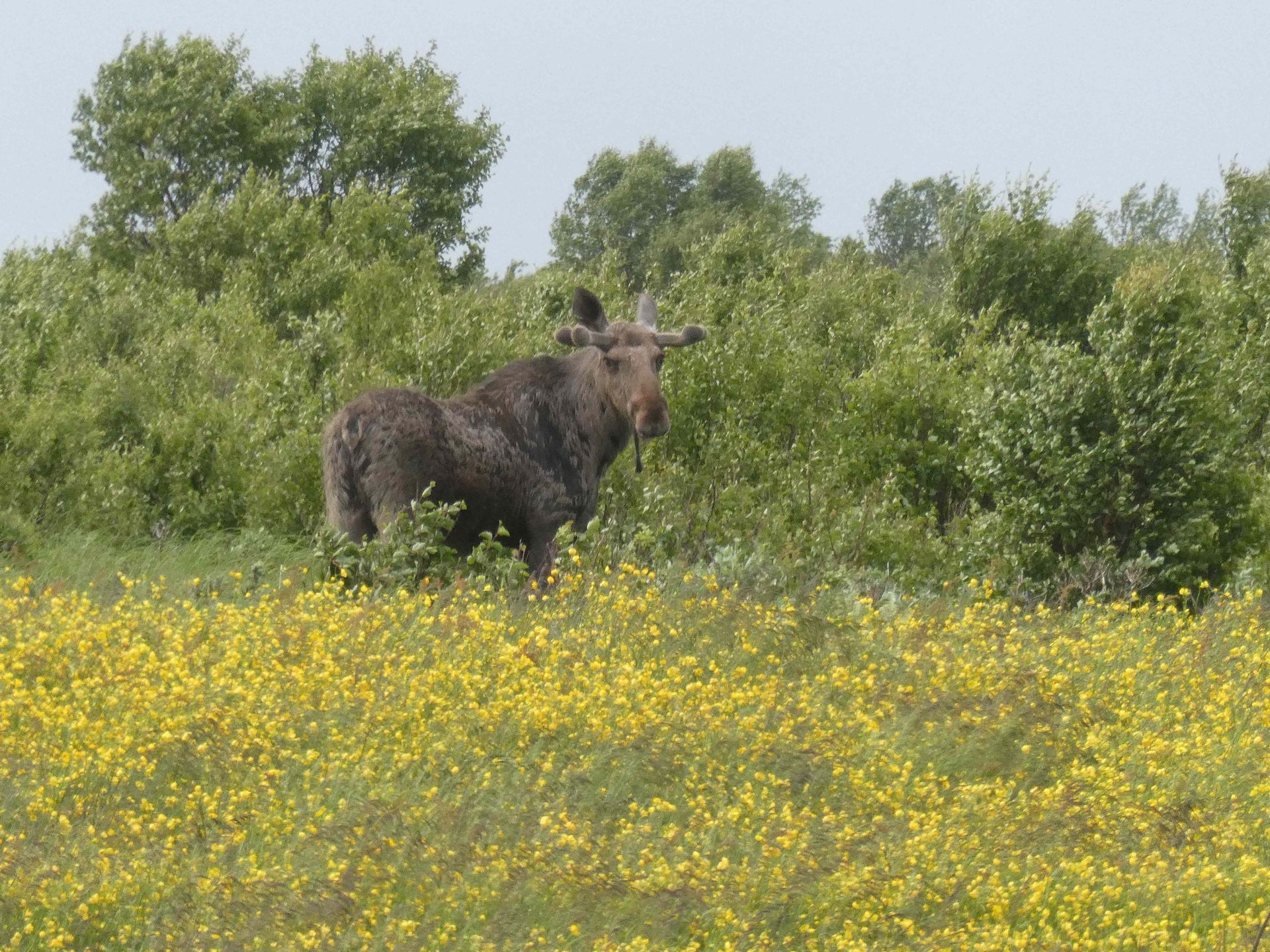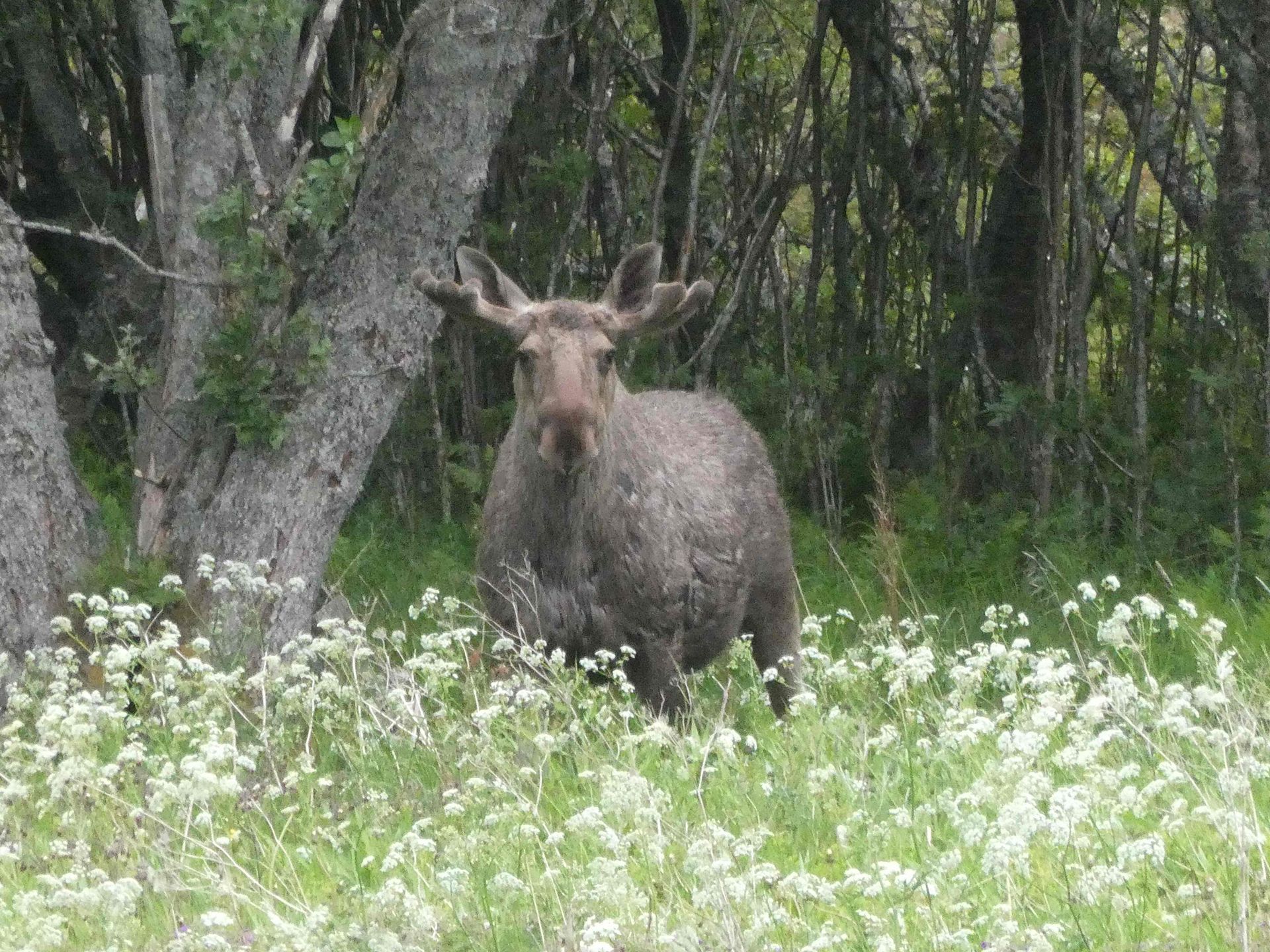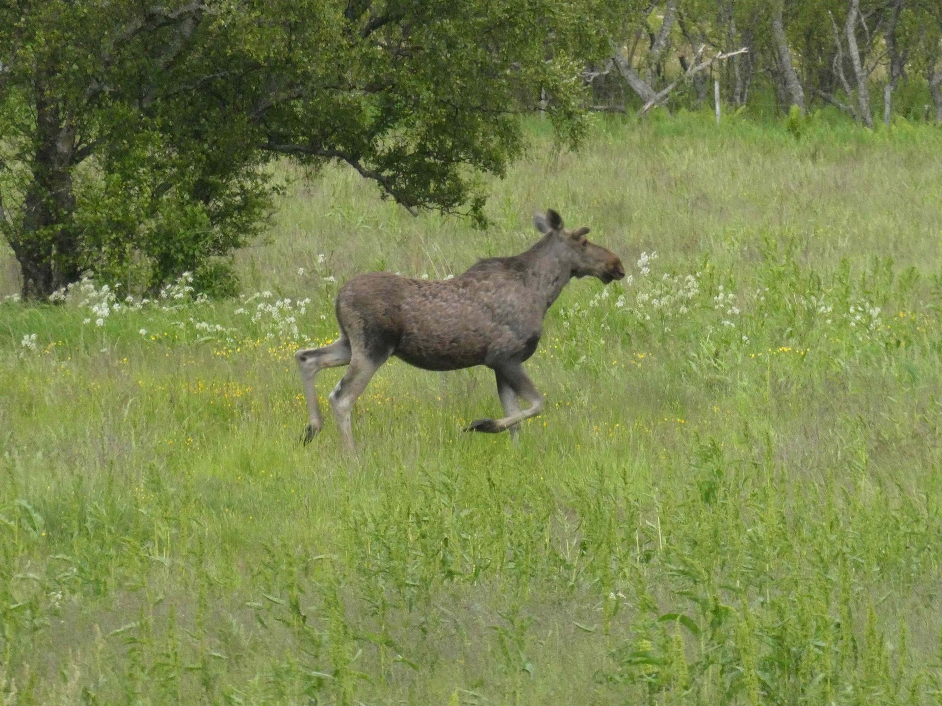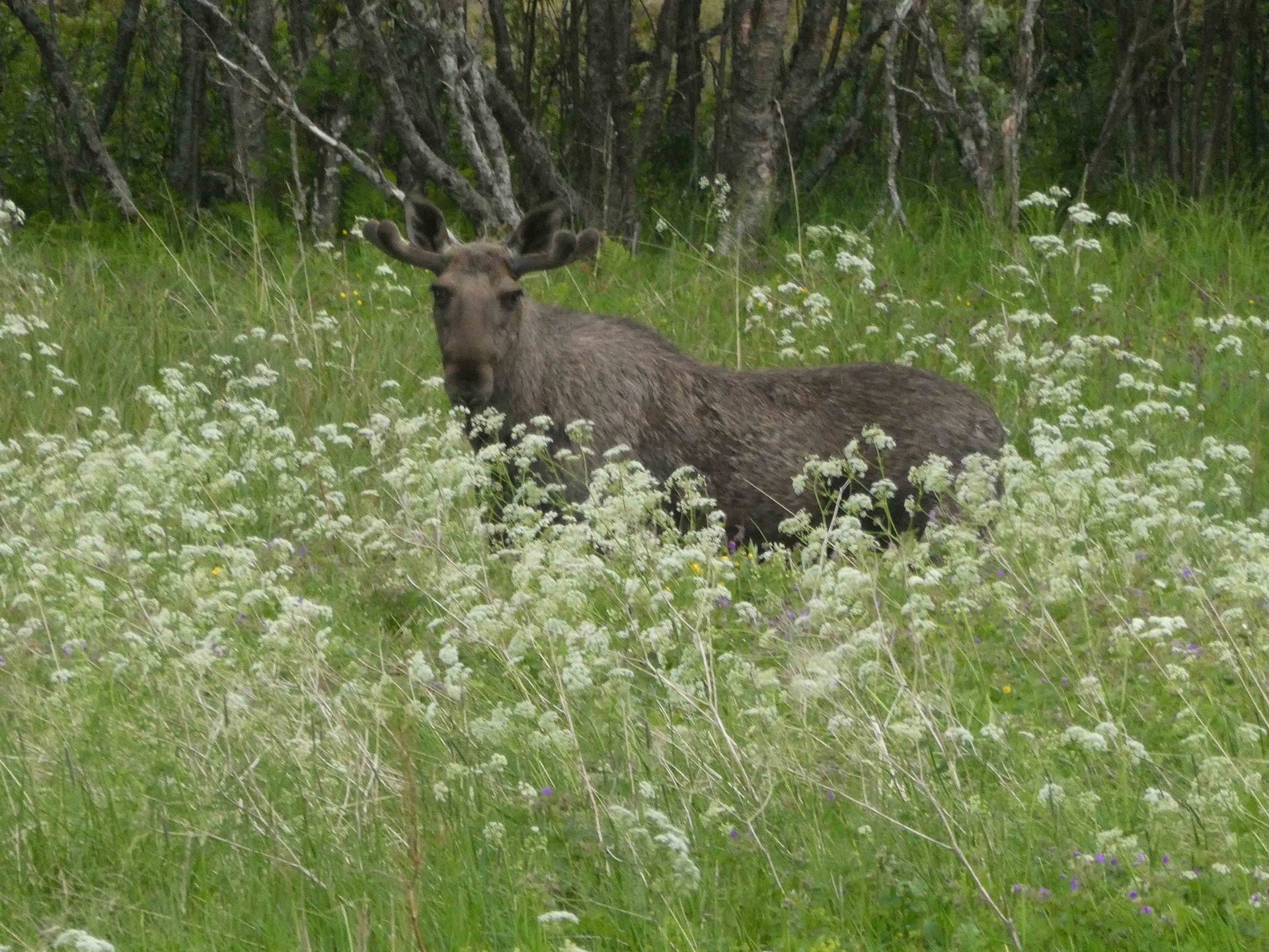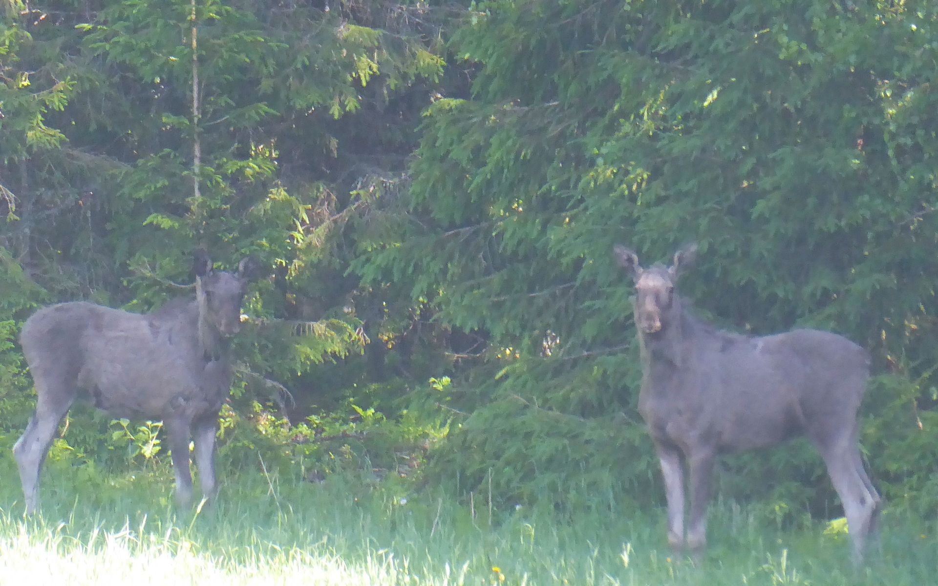 Abends um 19.30 Uhr holt uns Jens ab. Und fährt uns an Elchplätze. Wir sehen im Ganzen 9 Tiere an 5 verschiedenen Plätzen. Sie haben ein gutes Gehör und einen scharfen Geruchssinn, aber sie sehen nicht so gut. Sie stehen darum ganz steif und starr und hoffen, dass wir sie nicht sehen. Mit etwas Zeit gewöhnen sie sich wohl an das Bild mit Menschen, sie fressen dann weiter oder verschwinden eleganten Schrittes in den Wald. Nach drei Stunden sind wir wieder zurück. Hans holt noch Trinkwasser. Leider hält der Deckel nicht und drei Liter Wasser fliessen in den Bänz. Ein Fluch, auftrocknen und dann fallen wir endlich ins Bett.