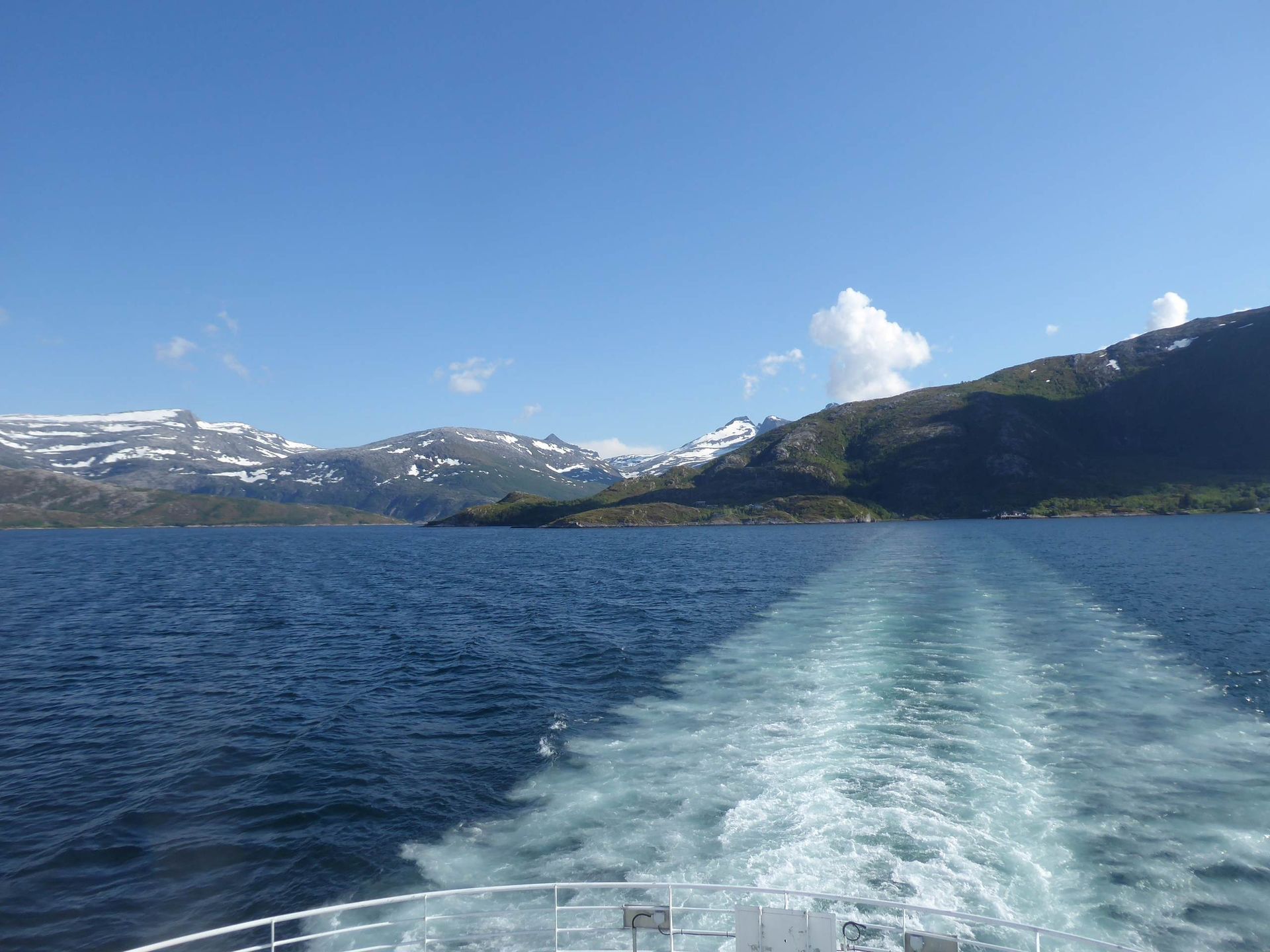 Bei der nächsten Fähre nach Nesna warten wir zwei Stunden, eine Fähre fällt aus und wissen nicht weshalb. Etwas später fahren wir mit einer Fähre über den nördlichen Polarkreis, 66 Grad N.
