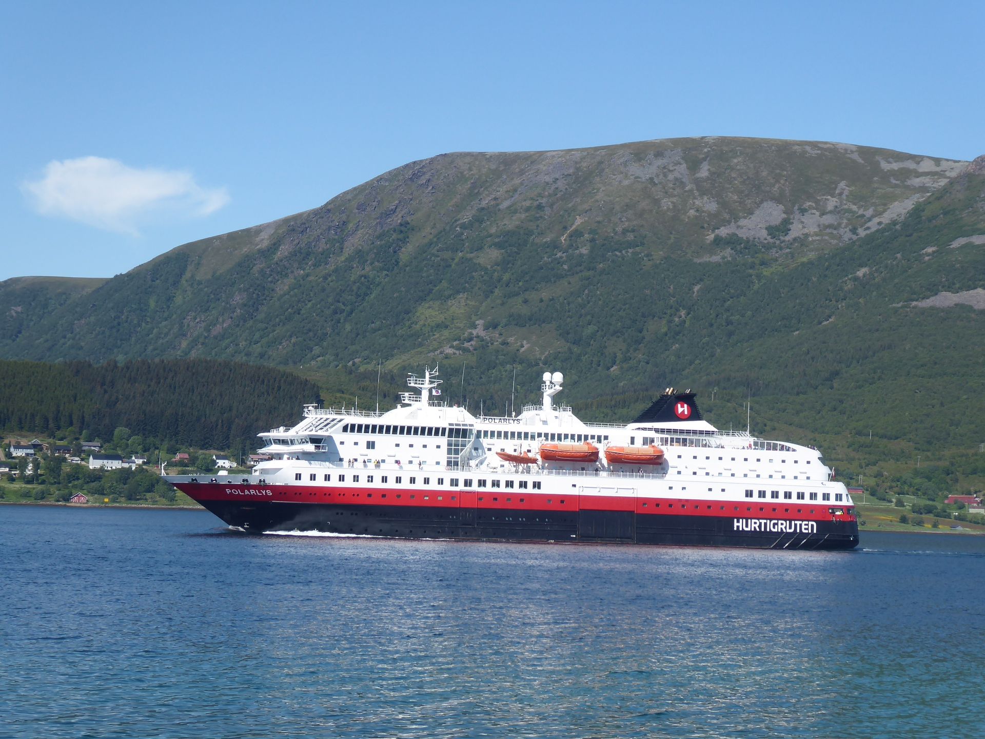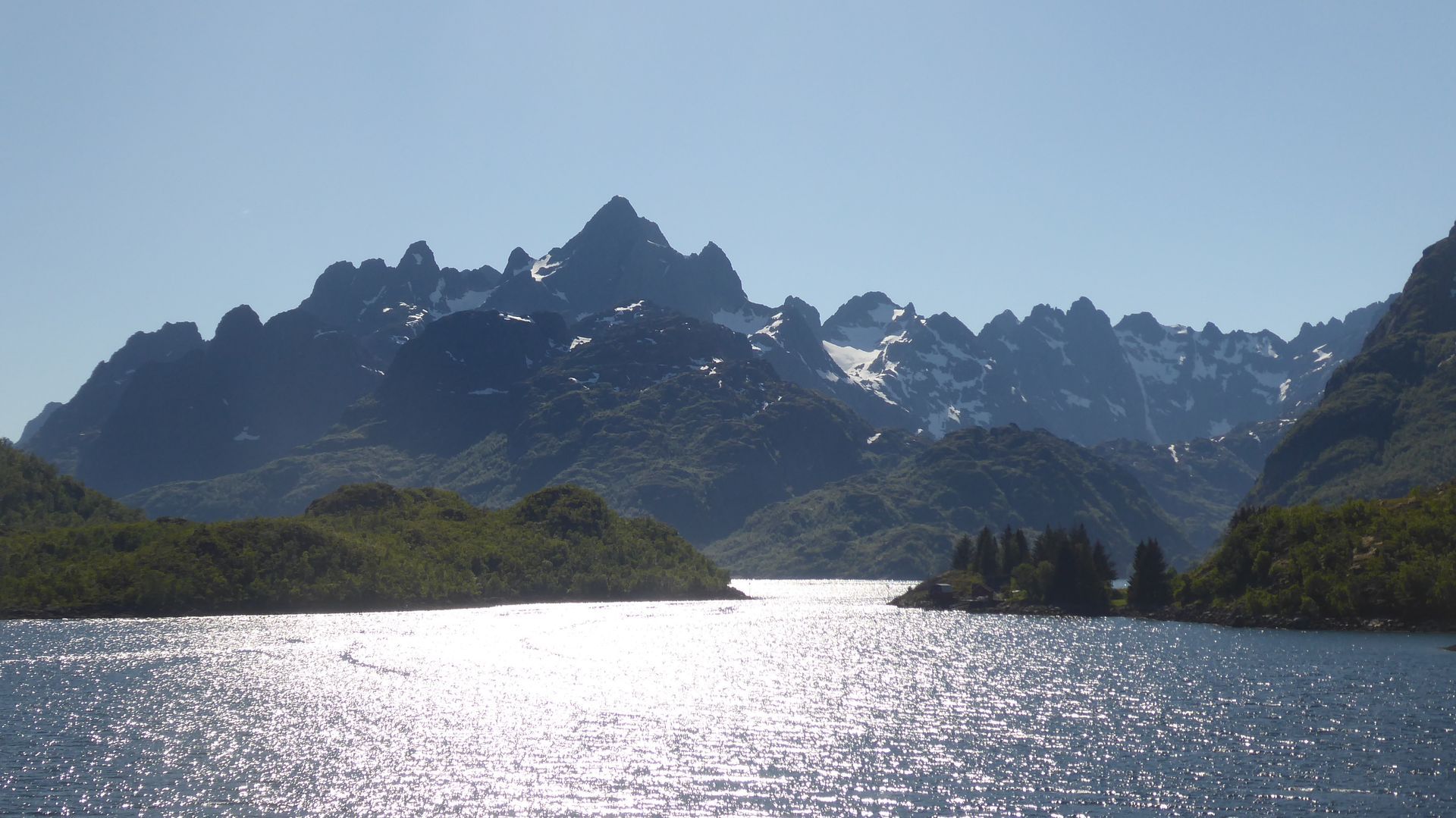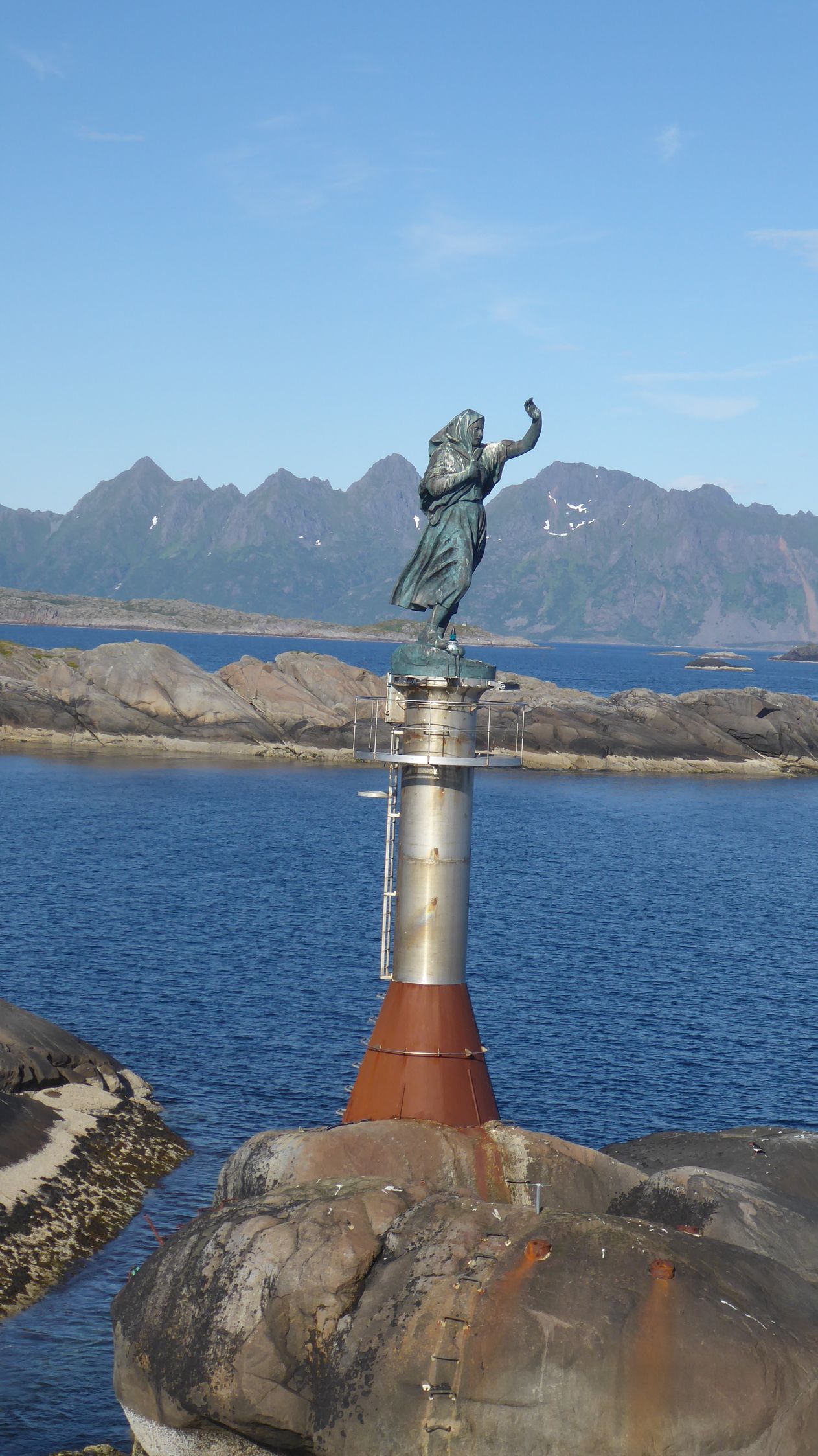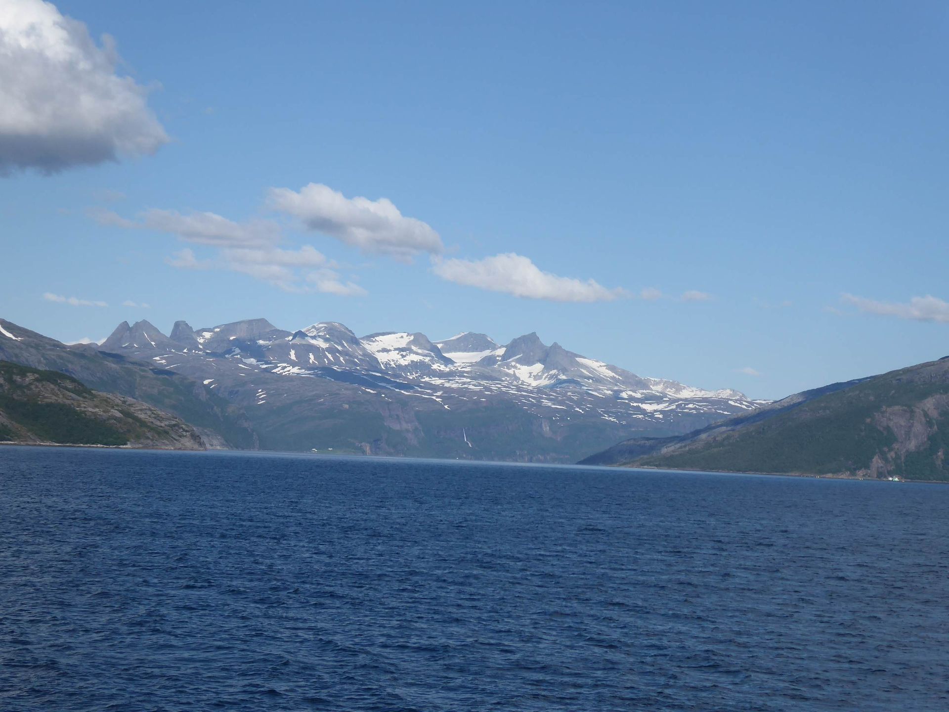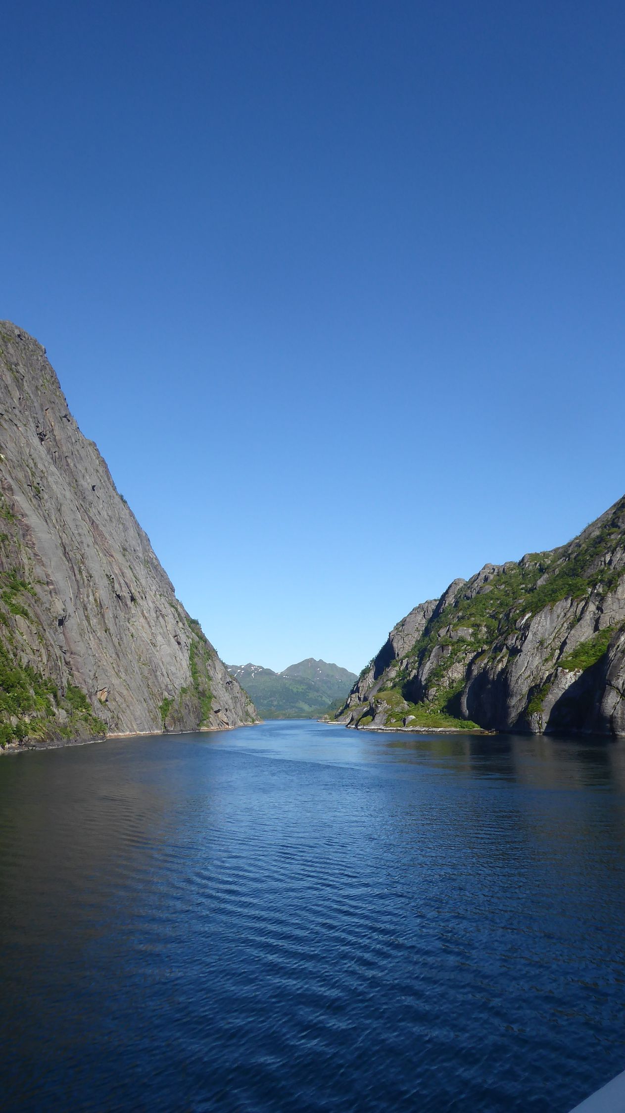 Am Sonntag, 16. Juni fährt ein Camper mit Schweizer BE Nummer an. Ich wünsche fröhlich: «Einen schönen guten Tag.» Sofort kommen wir mit Deddy und Monique ins Gespräch. Sie erzählen von einem Hurtigrutenausflug auf die Lofoten nach Svolvaer. Hui, das gefällt mir! Ich begeistere Hans dafür. Wir können keine Billette mehr buchen, darum bleibt die Aufregung, ob wir mitkommen können. Aber es ist wie bei uns in Tram und Zug ... das Billett wird am Eingang gelöst. Um 15.15 Uhr fährt die Polarlys mit Nebelhorn und uns aus dem Hafen. Das Schiff steuert durch den Raftsund, einen engen Fjord. Auf beiden Seiten hohe Felsen, da echot das Nebelhorn wunderbar und der Kapitän hat sichtlich Freude daran. Aber dann, der Trollfjord ist noch enger, die Felsen mit den Trollgesichtern sind zum Greifen nah. Und hinten, der Fjord hat keinen Ausgang, dreht der Kapitän eine doppelte Pirouette – wir sind begeistert.