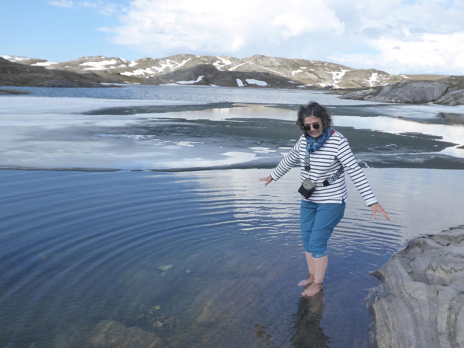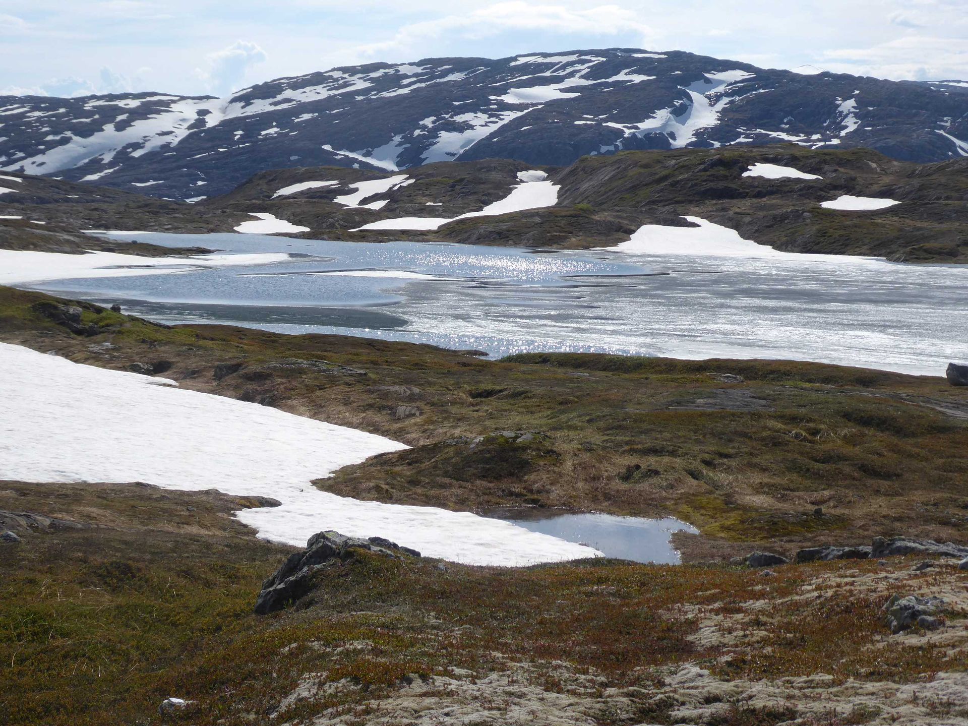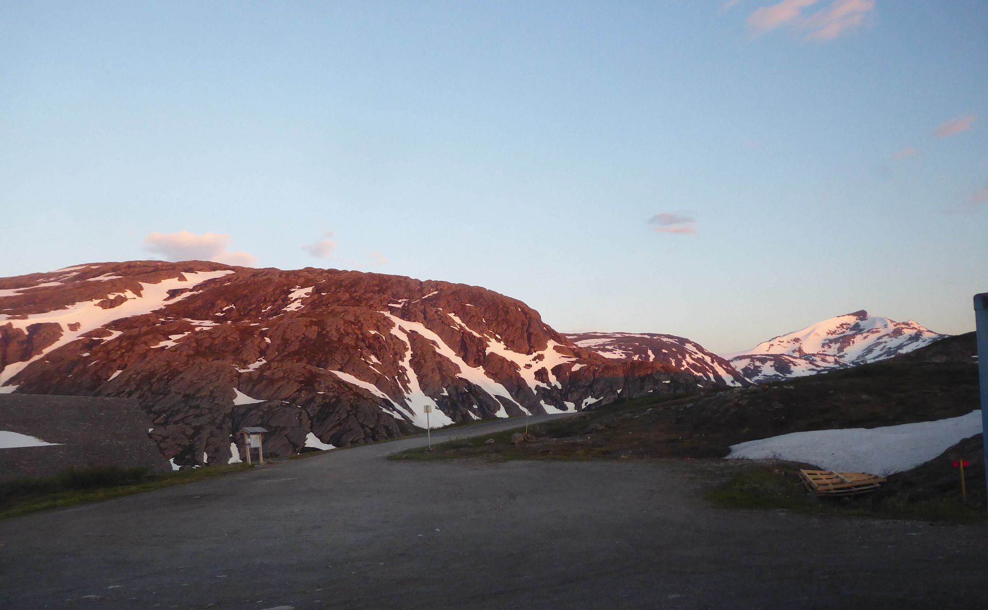 Von Glomfjord aus machen wir einen Abstecher zum Svartisengletscher. Leider hat es noch zuviel Schnee, dass wir vom Bänz aus den Gletscher nur ganz klein sehen. Wir wandern über das Fjell und in einem der vielen Eisseen gönne ich mir ein Fussbad. Es ist schon die ganze Nacht hell, morgens um 2 Uhr sind die Berge rosa beleuchtet. Am Morgen treffen wir einen Mann, der in seinem VW Caddy übernachtet hat. Er komme schon seit 30 Jahren hierher und sei 87 Jahre alt – da können wir noch lange!