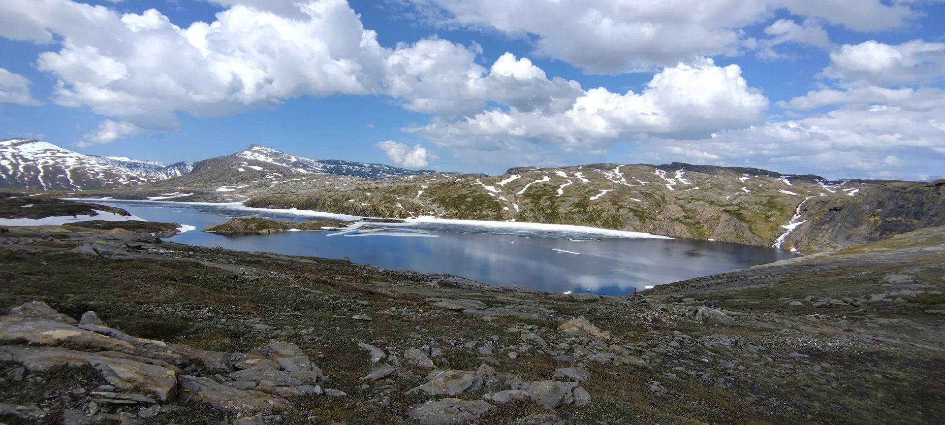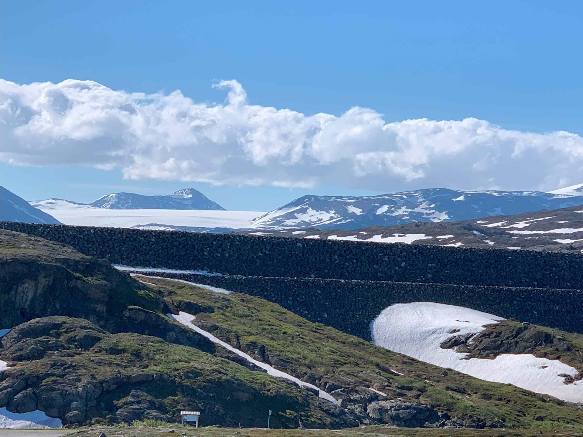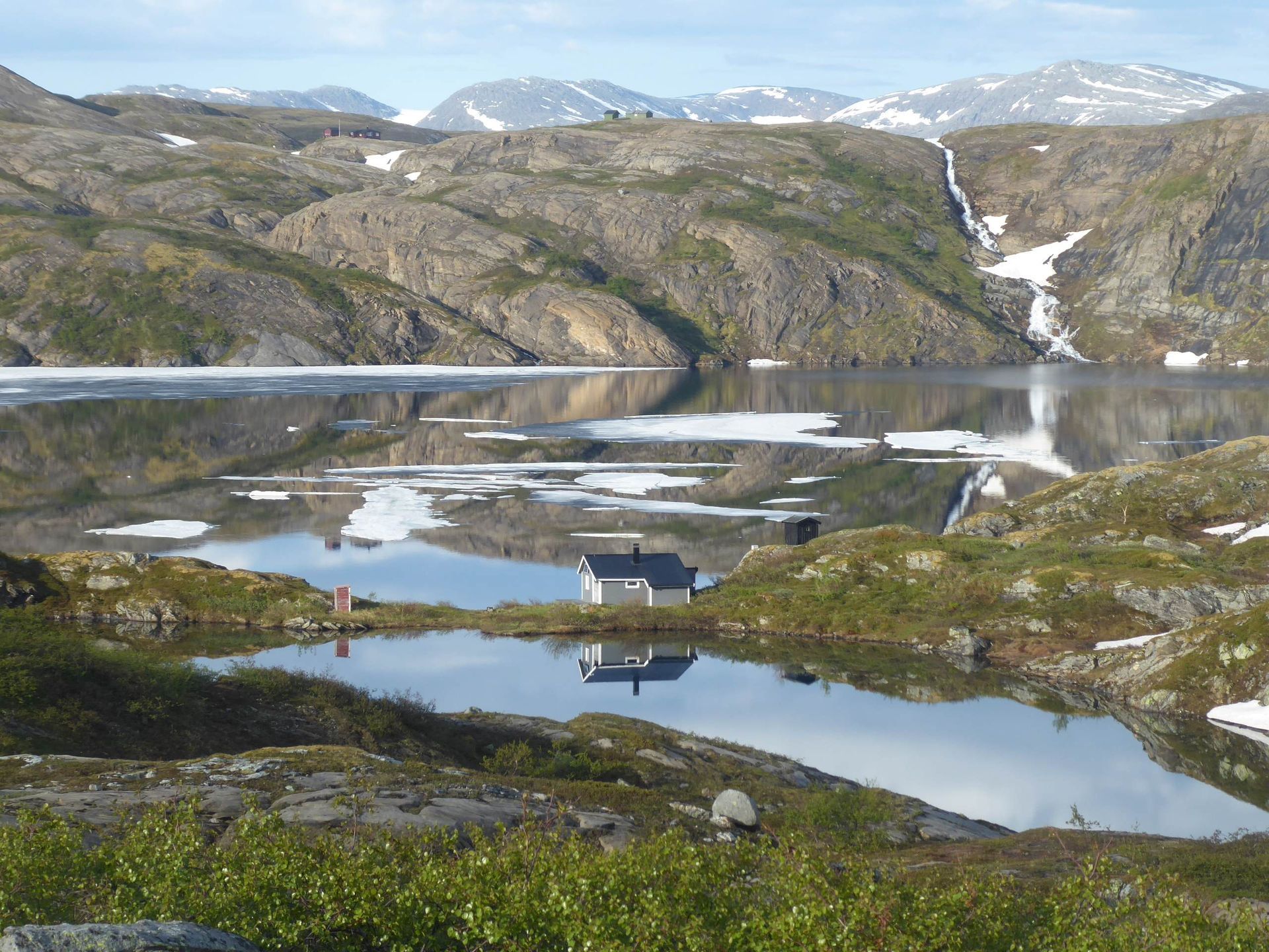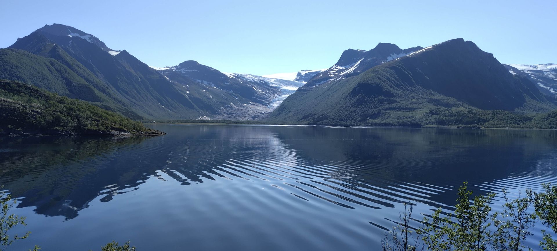 Von Glomfjord aus machen wir einen Abstecher zum Svartisengletscher. Leider hat es noch zuviel Schnee, dass wir vom Bänz aus den Gletscher nur ganz klein sehen. Wir wandern über das Fjell und in einem der vielen Eisseen gönne ich mir ein Fussbad. Es ist schon die ganze Nacht hell, morgens um 2 Uhr sind die Berge rosa beleuchtet. Am Morgen treffen wir einen Mann, der in seinem VW Caddy übernachtet hat. Er komme schon seit 30 Jahren hierher und sei 87 Jahre alt – da können wir noch lange!