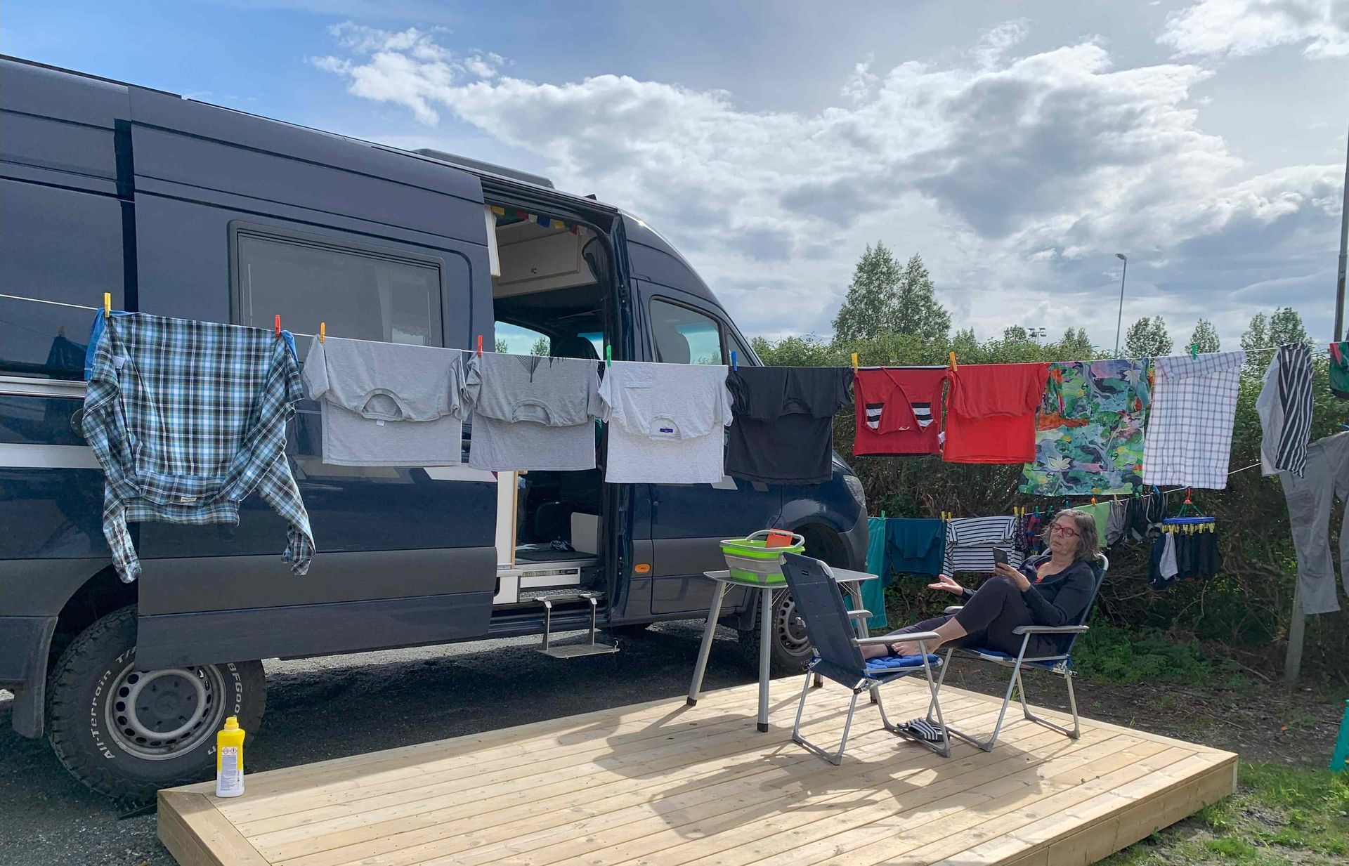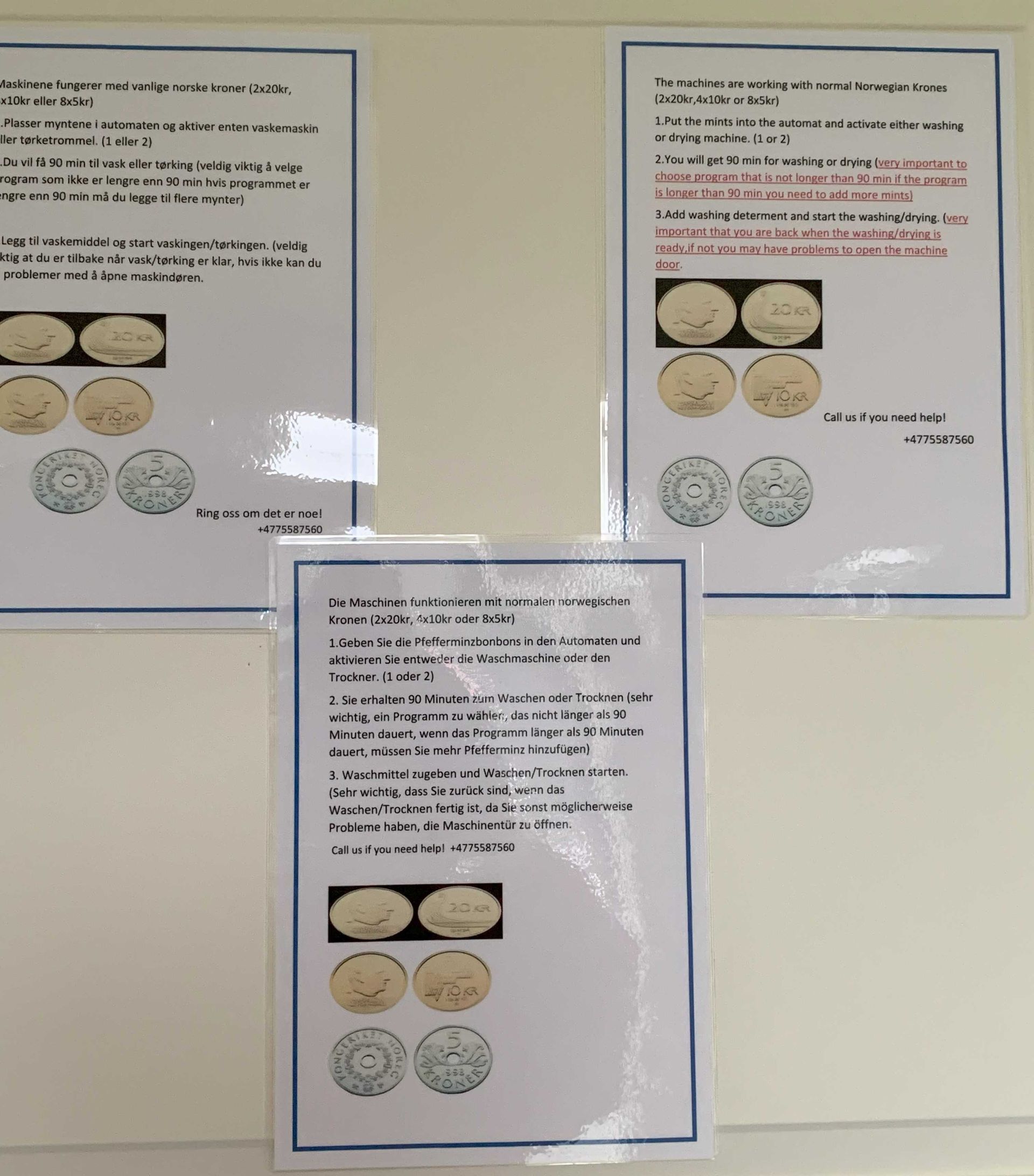 Wir bleiben einen Tag länger um zu waschen und umzuräumen. Also wirklich, dass die Wäsche auch mit Pfefferminz sauber wird, hätte ich nie gedacht: mynter = mints = Pfefferminz. Die Wäsche trocknet vor dem grossen Regen.