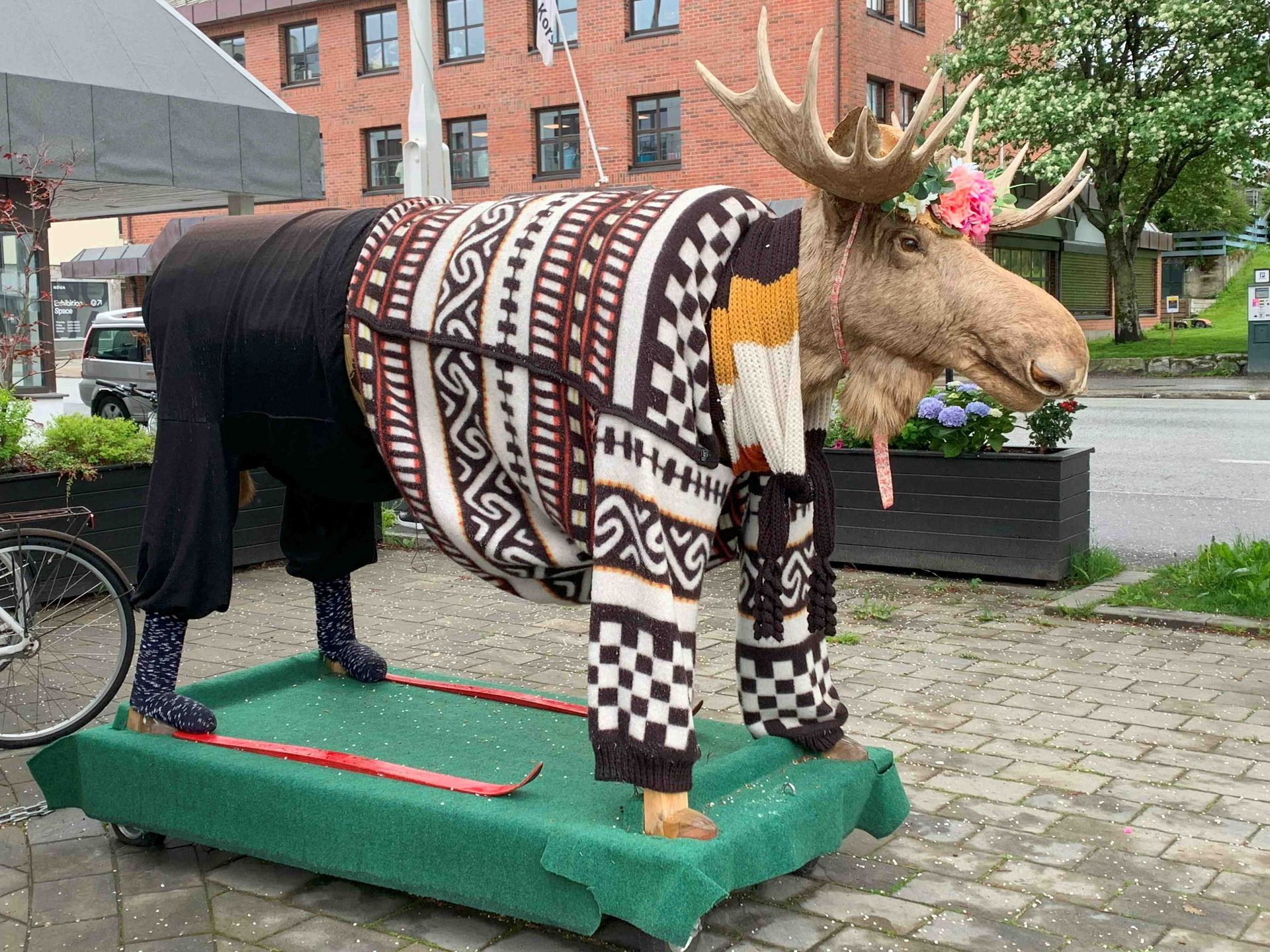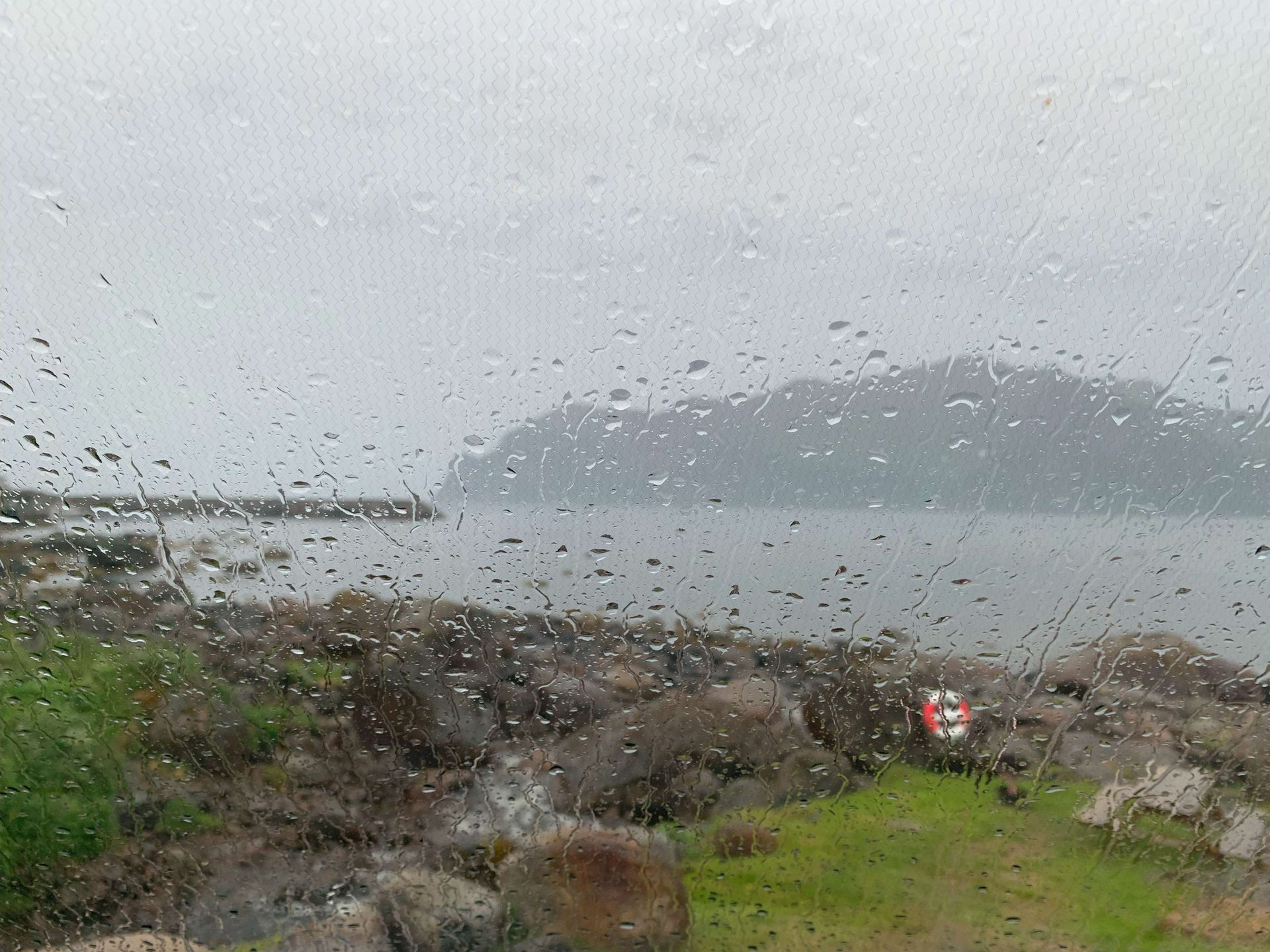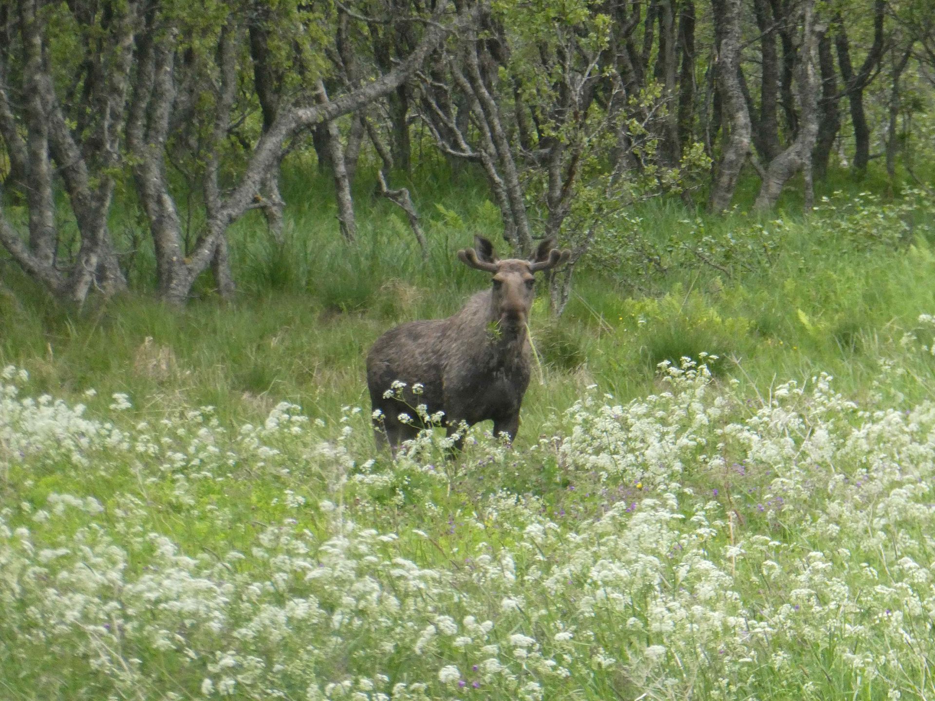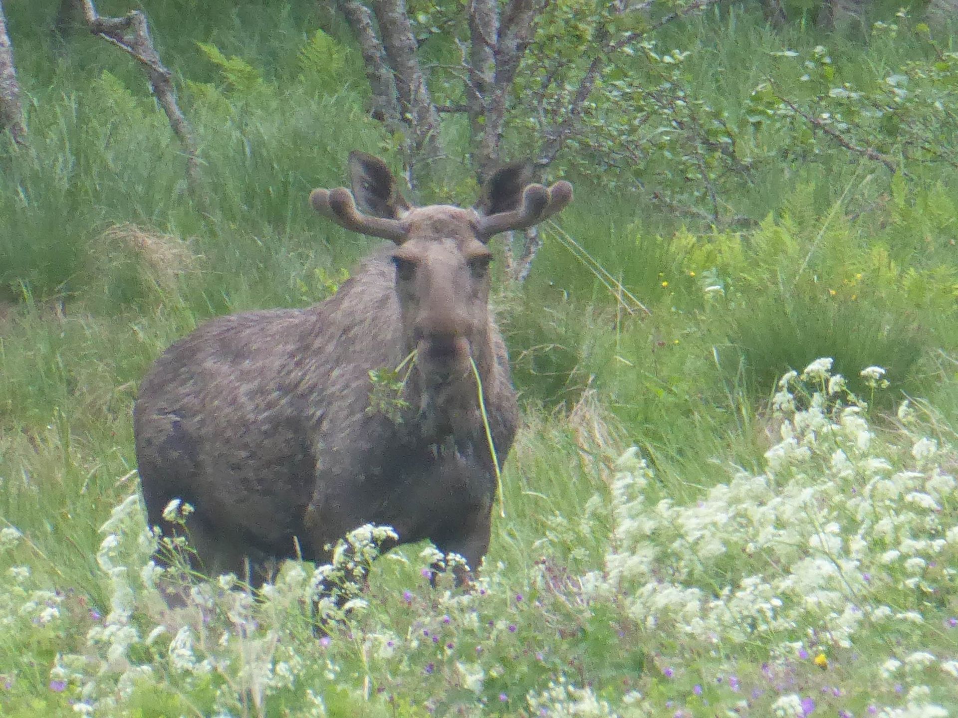Also wirklich, Waldcamping ist für mich sehr schwierig, da fällt mir die (Baum)Decke auf den Kopf. Wir fahren also am anderen Tag weg und sehen als erstes drei Elche am Waldrand. Weil Starkregen angesagt ist, stellen wir uns in Bindal auf einen offeneren Platz und schreiben Reisebericht.
