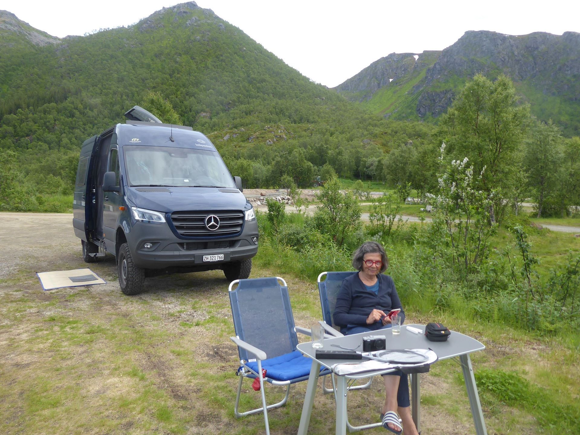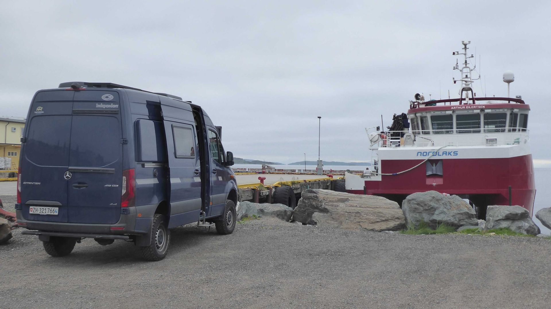 Am Sonntag fahren wir weiter auf die Insel Senja. Von anderen Campern haben wir gehört, dass man elend lange anstehen muss und es nicht sicher ist, ob man auf die nächste Fähre kommt. Also braucht es eine Strategie. Wir kommen vor 9 Uhr an den Hafen in Andenes und schliessen auf. Die Fähre geht ohne uns, aber wir kommen sicher auf die nächste um 13 Uhr, weil wir nun ganz vorne stehen. Zeit für Zmorge, ein Schläfchen, Zeitung lesen und Scheiben putzen.